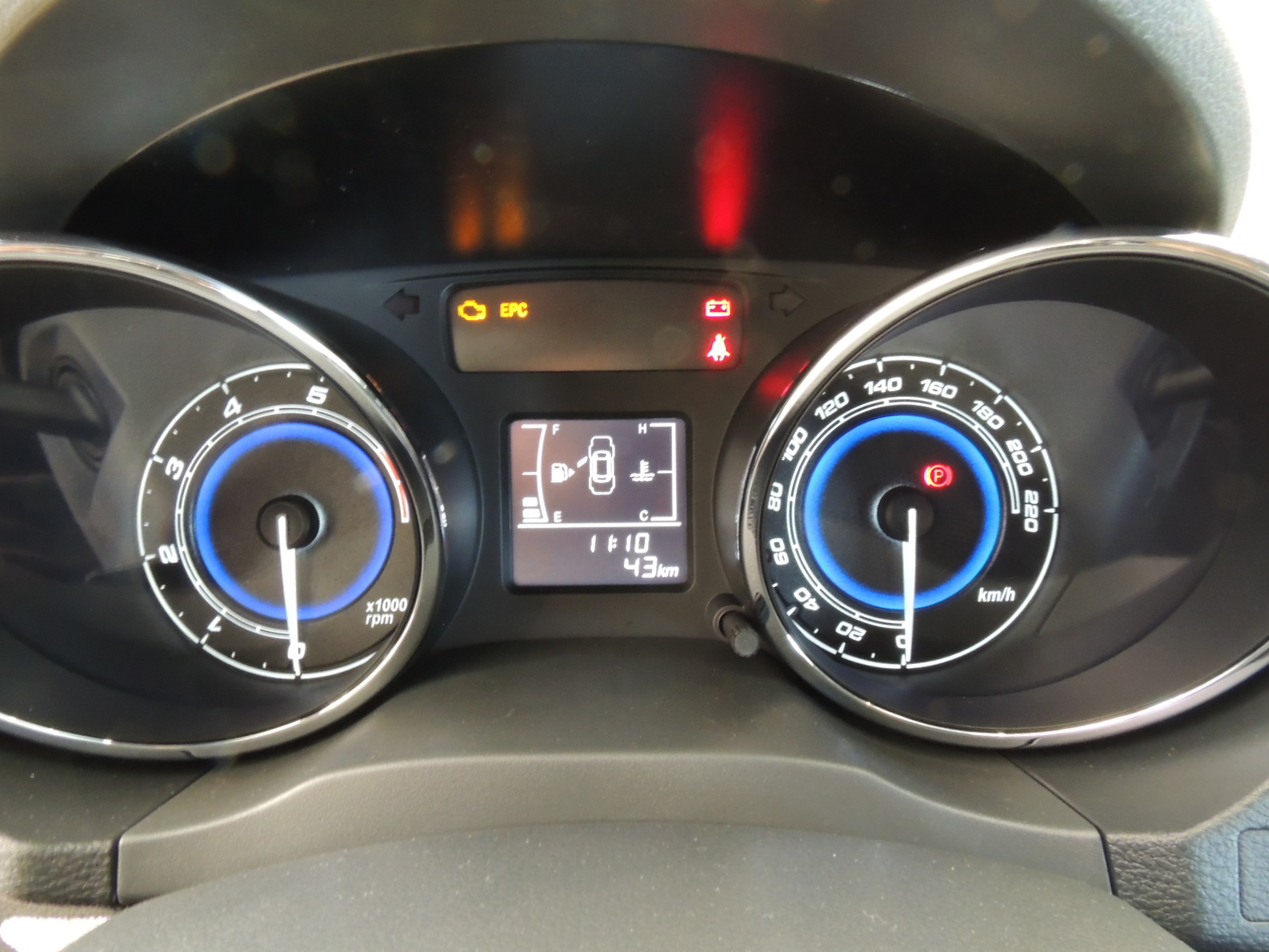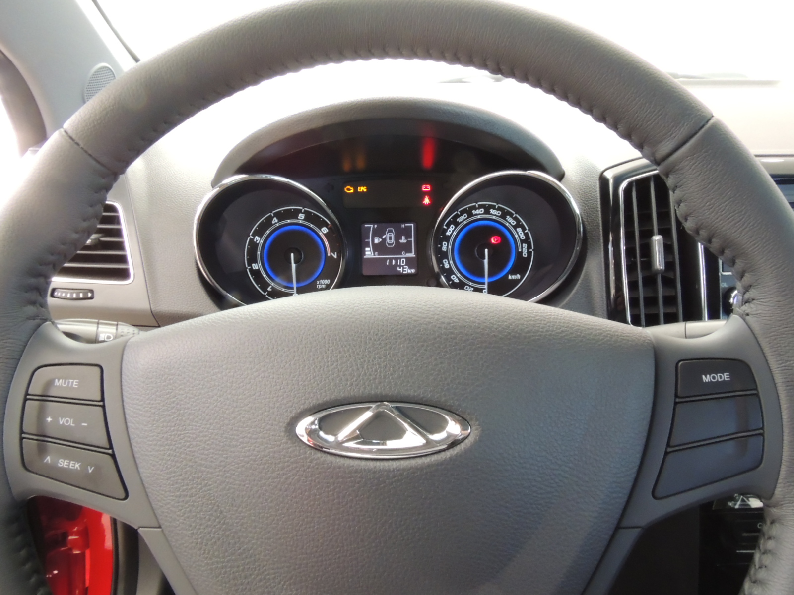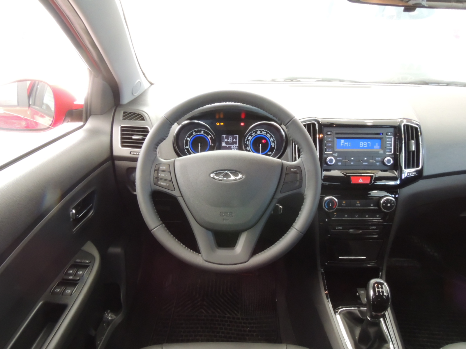 El puesto de manejo es simple y funcional. Somos recibidos por un volante con revestimiento de cuero, un cuadro de instrumentos con dos llamativos bulbos con inserciones cromadas, los que contienen el tacómetro y velocímetro (con grafía circular y retroiluminación blanca y azul). Al centro encontramos un monitor gráfico de seguridad, que hace las veces de minicomputador de abordo que informa acerca de: