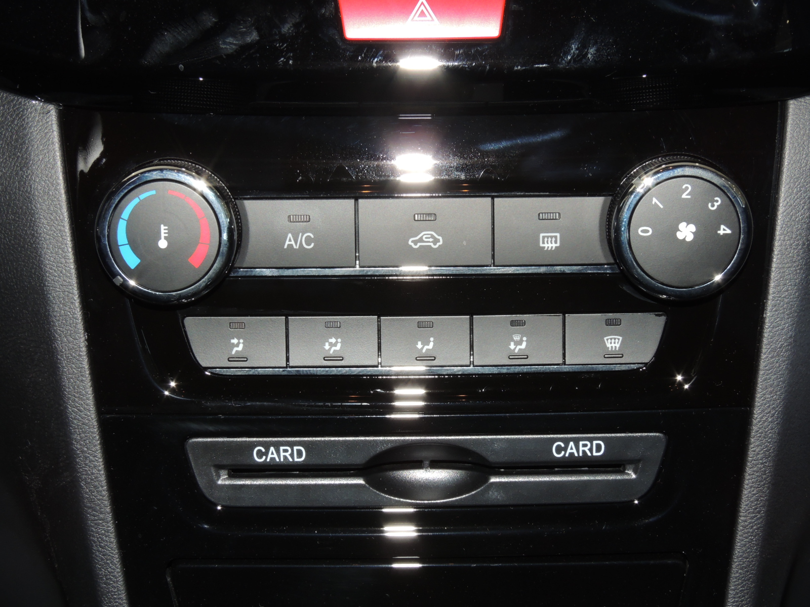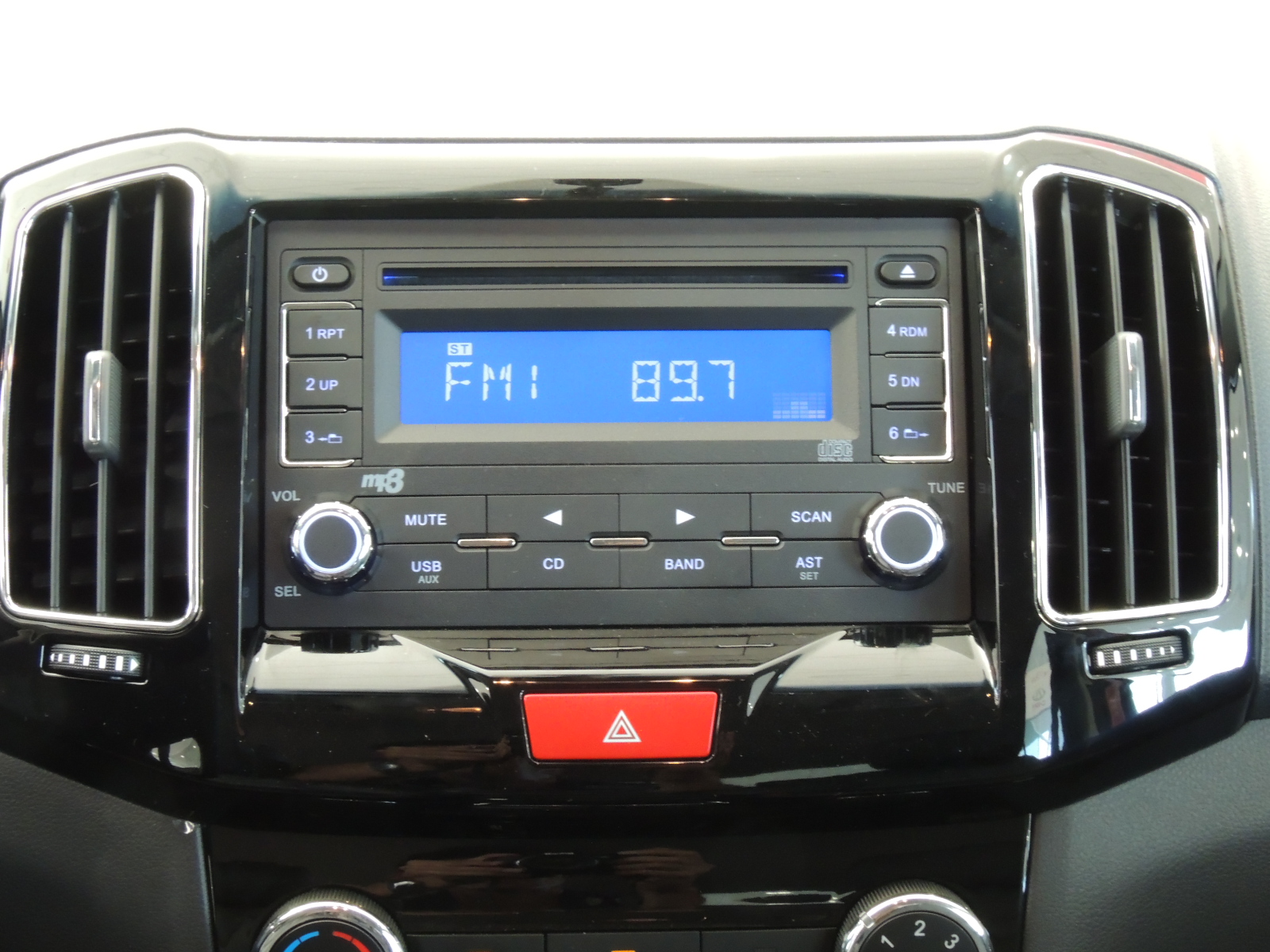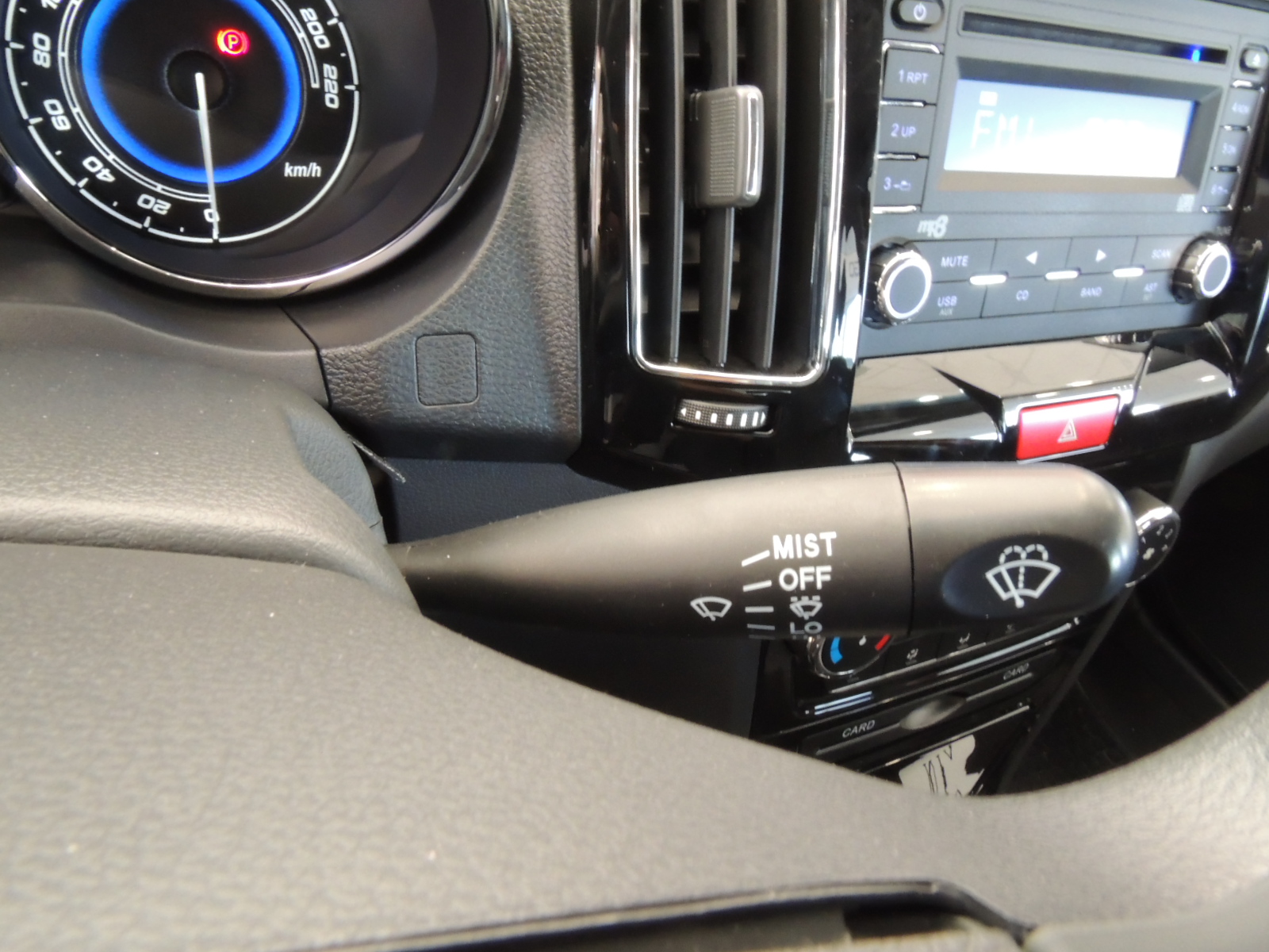 La consola central exhibe un sistema de audio con reproductor de MP3/USB/AUX/CD y cuatro parlantes, con generosa pantalla iluminada en negro con contraste azul, la que es escoltada por dos rejillas de aire verticales. Inmediatamente bajo el audio encontramos los comandos del sistema de climatización (de serie A/C, que mezcla mandos giratorios con otros del tipo pulsador, sobre elegante fondo negro lacado brillante. Un espacio para almacenar tarjetas y un portaobjetos con tapa. Más detalles en ficha técnica adjunta.