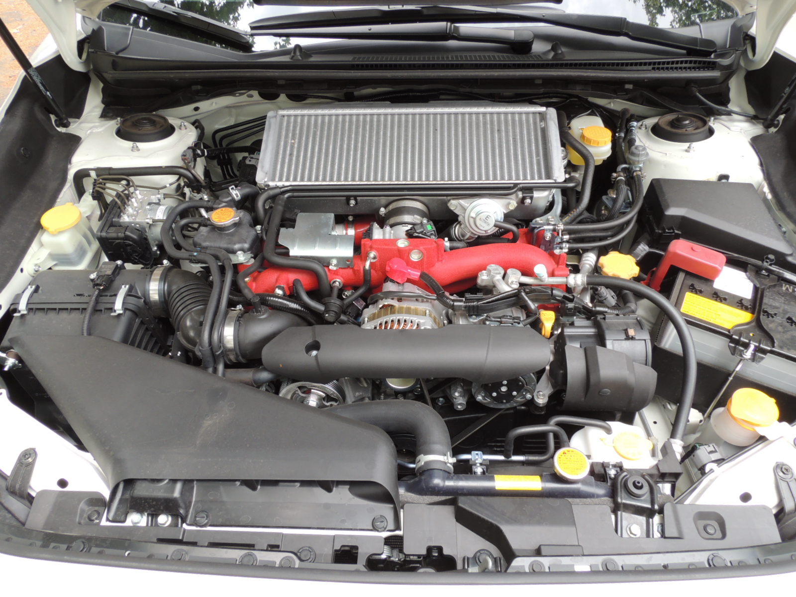 Bajo su capó de aluminio, se esconde un motor boxer turboalimentado de 2.475 c.c. de desplazamiento, cuatro cilindros y 16 válvulas DOHC, que desencadena nada menos que 305HP (+37HP que el WRX y 5HP más que el anterior STI) cuando el tacómetro toca las seis mil vueltas, mientras que su par llega a los 407Nm, cuando el motor gira a 4.000 vueltas por minuto. Toda esta potencia es enviada a las ruedas por medio de una caja manual de seis relaciones. Los consumos homologados por el 3CV arrojan un rendimiento de 7,1 km/l en ciudad; 11,9km/l en carretera y un mixto de 9,6km/l. Durante nuestra prueba, el computador de abordo arrojó un promedio de 7,4km/l.