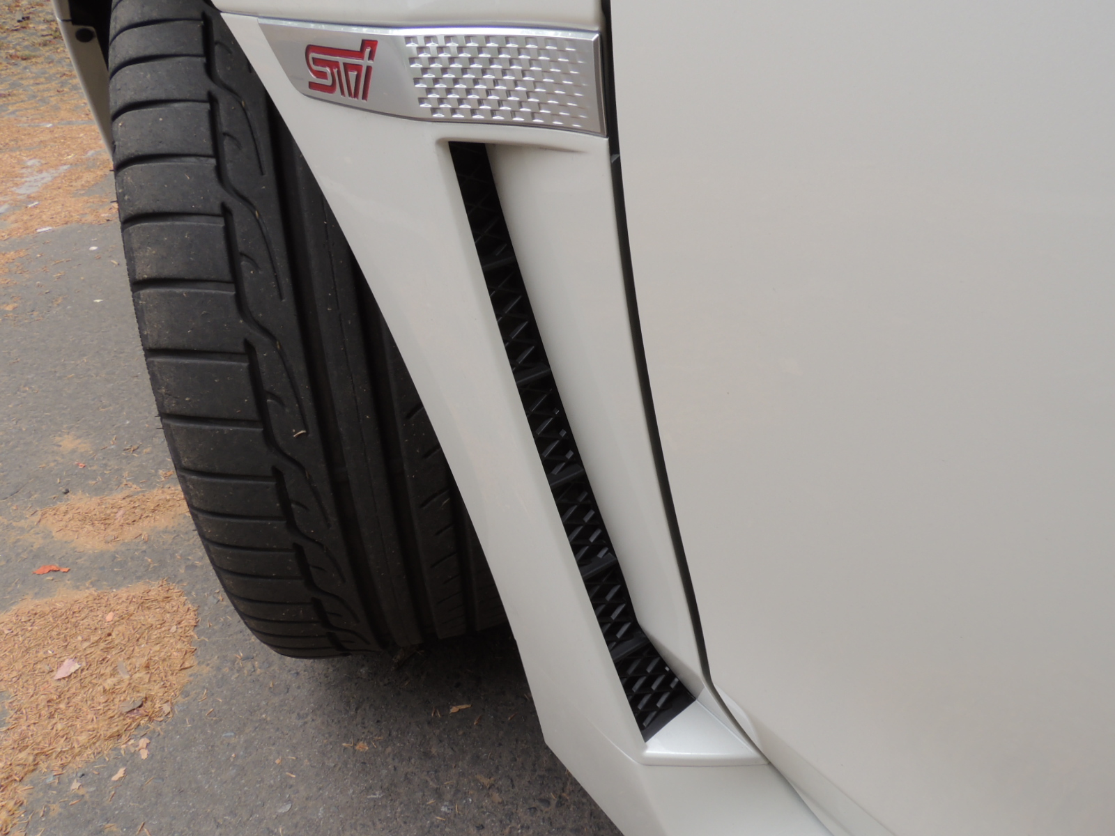 La toma de aire en el capó es más baja y ancha aumentando el flujo de éste que entra al intercooler. Se añaden luces de posición led delanteras y traseras, así como leds de freno posteriores. El techo y capó están fabricados en aluminio y permiten reducir aún más su bajo centro de gravedad. De costado, la única diferencia con el WRX, además de las llantas, reside en la placa que va sobre las branquias laterales con letras rojas STI, mientras que en la zaga, el discreto spoiler del WRX da paso a uno de grandes proporciones, además de la inclusión de la gráfica STI en rojo con bordes cromados en relieve, bajo la designación WRX.