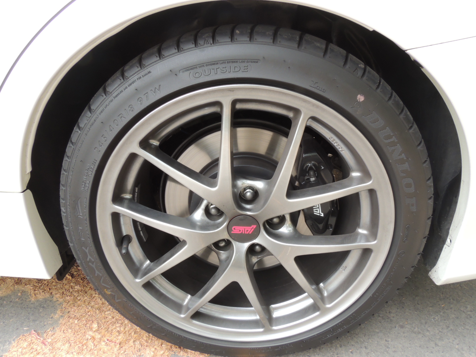 Sus cotas dimensionales son idénticas a las de su hermano WRX, esto es: 4.595mm de largo (+15mm más largo que su predecesor); 1.795mm de ancho y 1.475mm de alto (+ 5mm que el STi anterior). Su batalla también se mantuvo incólume en los 2.650mm (pero se incrementó en 25mm comparado con el STi antiguo). Calza neumáticos Dunlop SP Sport Maxx RT de medida 245/45 R18 con generosas llantas de aleación de color bronce oscuro metálico cuyo diseño deja entrever los enormes rotores de los frenos y las mordazas en las que se lee la gráfica STI en letras blanca sobre fondo negro. Su distancia libre del suelo es de 135mm, mientras que su peso en orden de marcha, alcanza los 1.516 kilos.