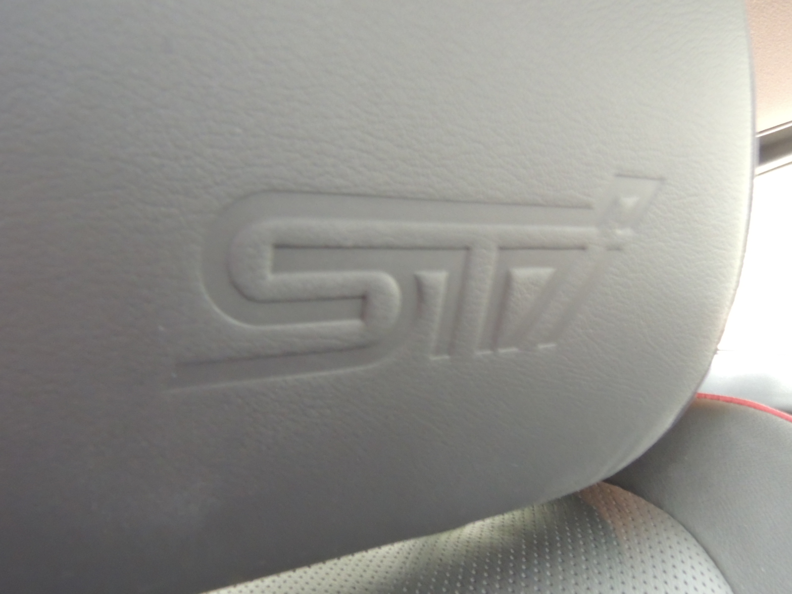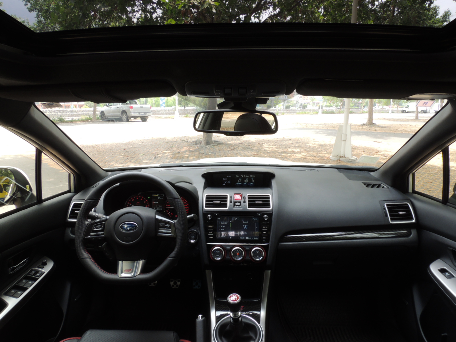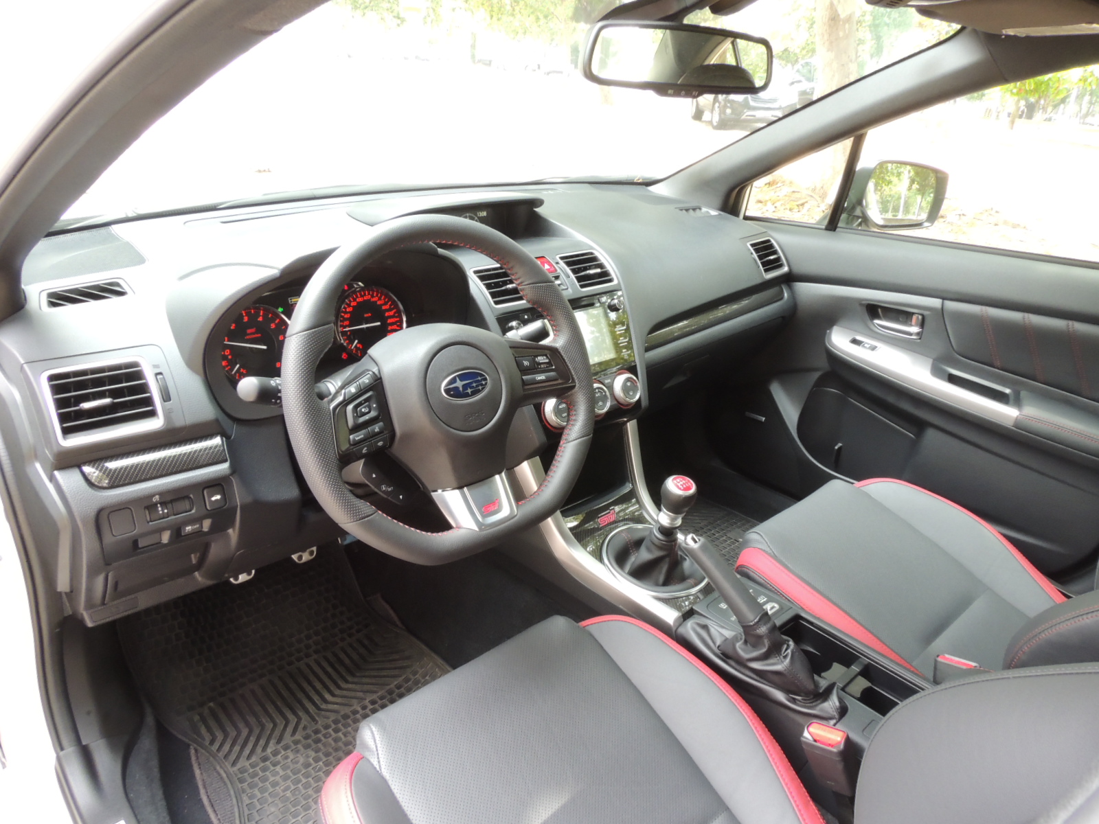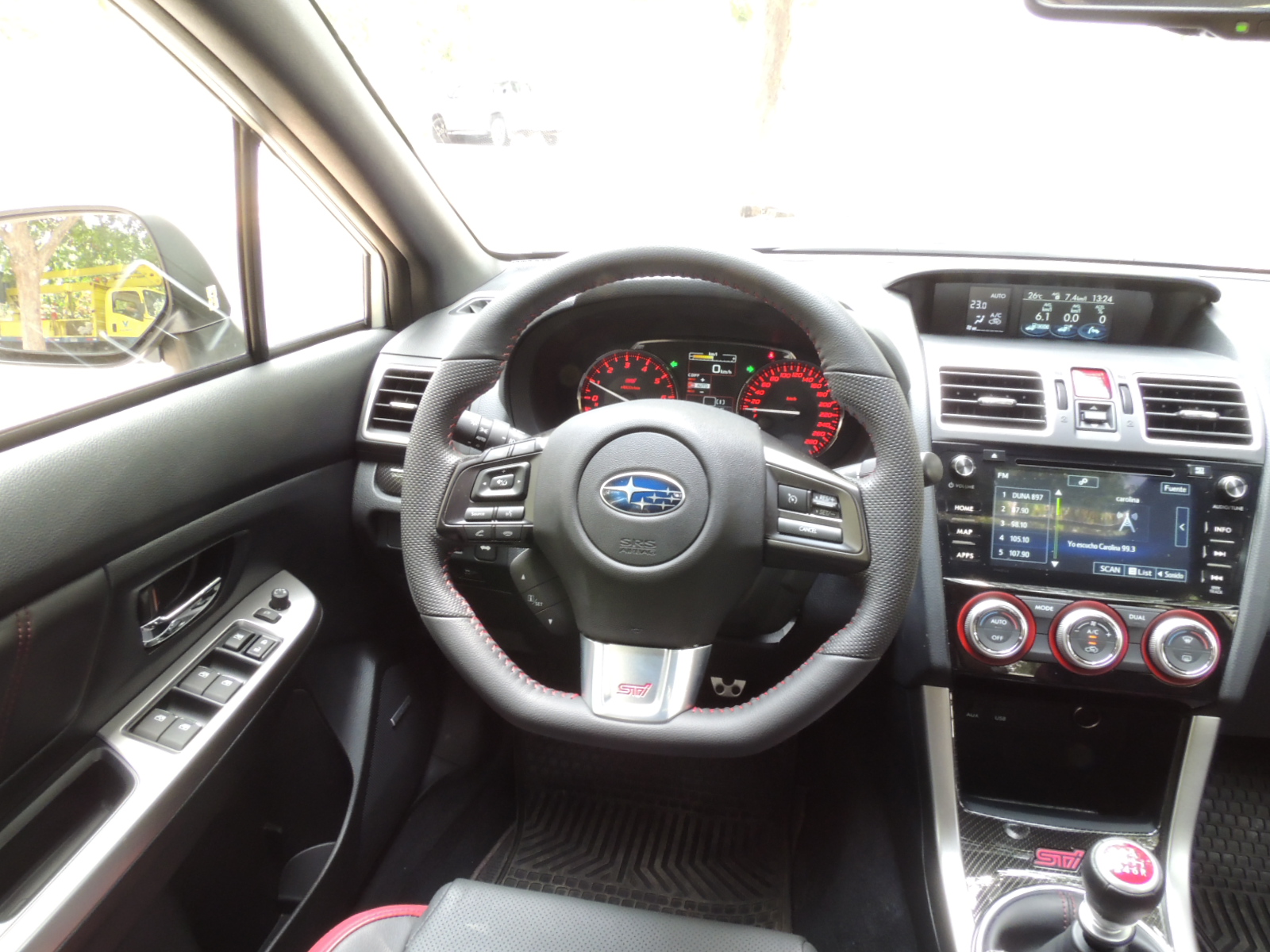 Su habitáculo fue especialmente diseñado con la finalidad de realzar la experiencia de manejo, lo que se aprecia en la posición de los controles y de los canales informativos que están a la mano de quien lo conduce. Se distingue de la cabina del WRX por el empleo de cuero rojo en los apoyos verticales laterales y parte del respaldo, así como la sigla STI grabada en los reposacabezas delanteros. Algo similar se aprecia en las plazas posteriores. Una placa de acero inoxidable nos da la bienvenida al cockpit. El volante se distingue por la adición de dos teclas satelitales al costado izquierdo superior, un texturado de cuero ranurado en los costados y la sigla STI en la base de su forma que emula una letra D. La plancha de los comandos del climatizador tiene un contorno rojo, mientras que el pomo central de la palanca de cambios (donde va el gráfico de la secuencia de marchas, es de color rojo y letras en gris claro.