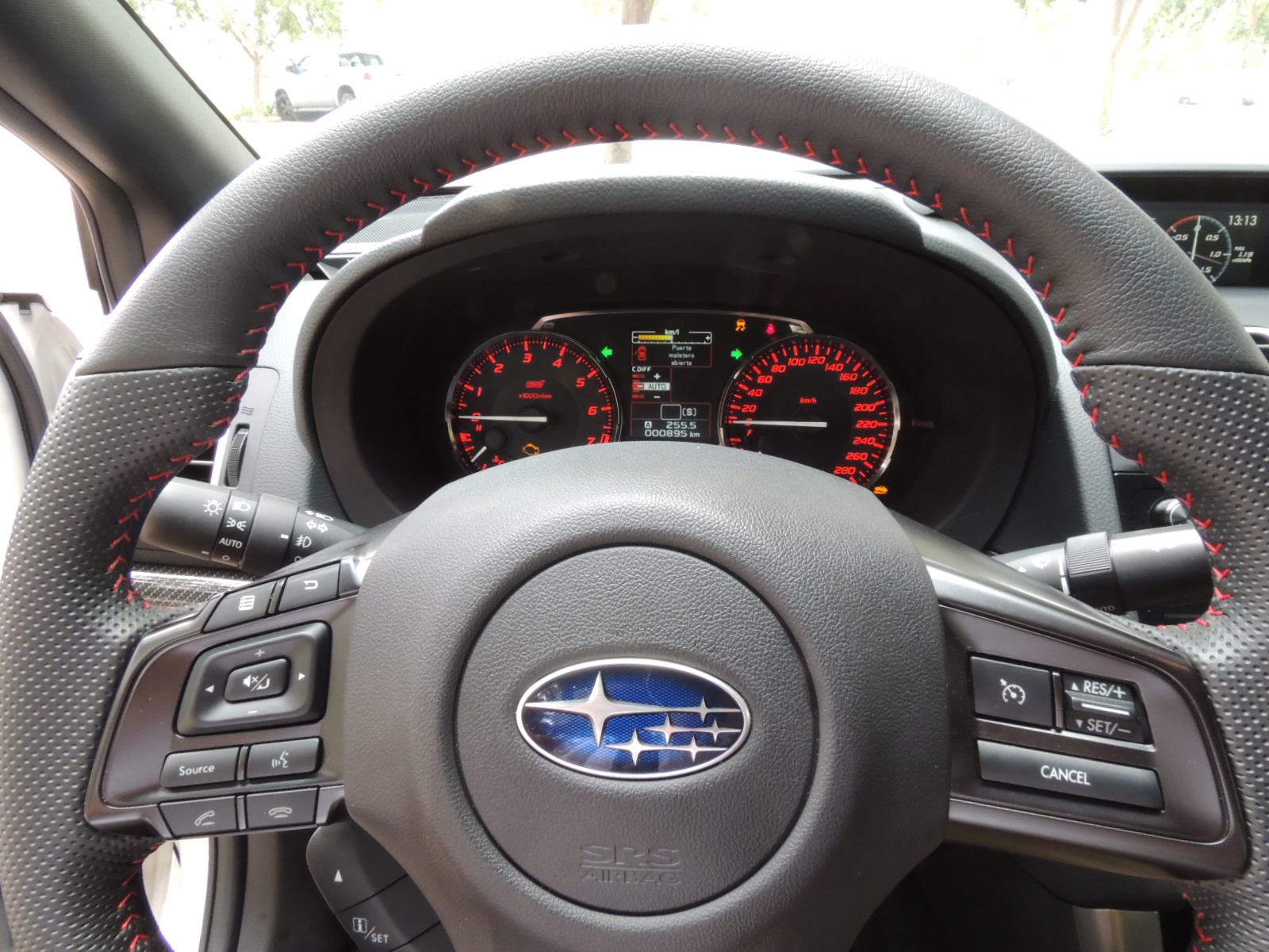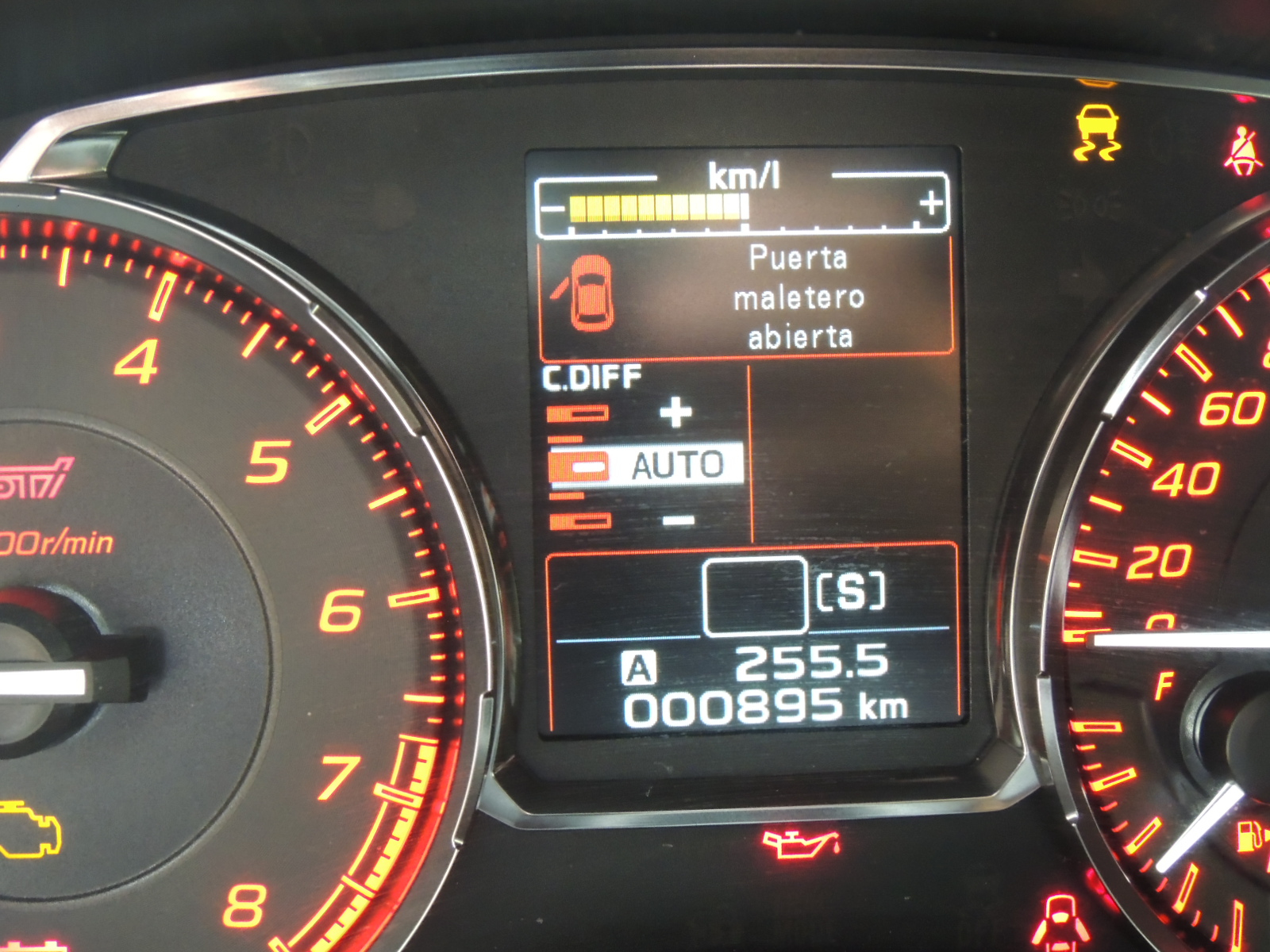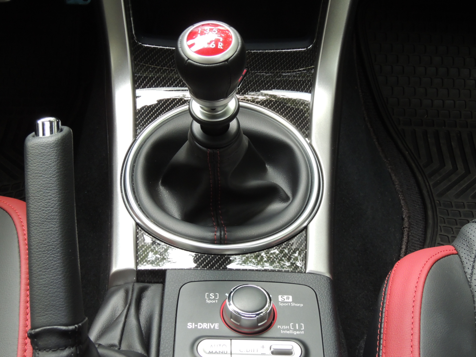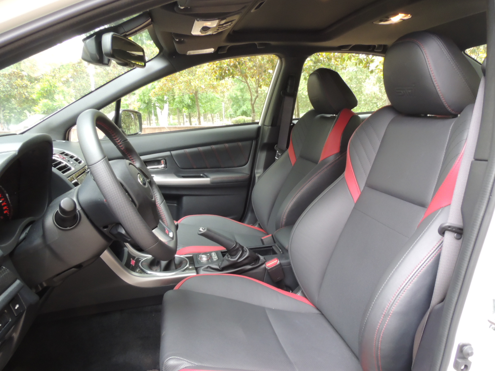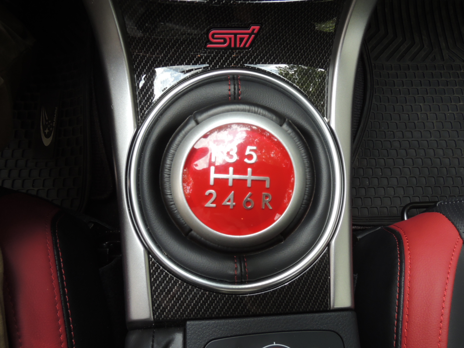 Su habitáculo fue especialmente diseñado con la finalidad de realzar la experiencia de manejo, lo que se aprecia en la posición de los controles y de los canales informativos que están a la mano de quien lo conduce. Se distingue de la cabina del WRX por el empleo de cuero rojo en los apoyos verticales laterales y parte del respaldo, así como la sigla STI grabada en los reposacabezas delanteros. Algo similar se aprecia en las plazas posteriores. Una placa de acero inoxidable nos da la bienvenida al cockpit. El volante se distingue por la adición de dos teclas satelitales al costado izquierdo superior, un texturado de cuero ranurado en los costados y la sigla STI en la base de su forma que emula una letra D. La plancha de los comandos del climatizador tiene un contorno rojo, mientras que el pomo central de la palanca de cambios (donde va el gráfico de la secuencia de marchas, es de color rojo y letras en gris claro.