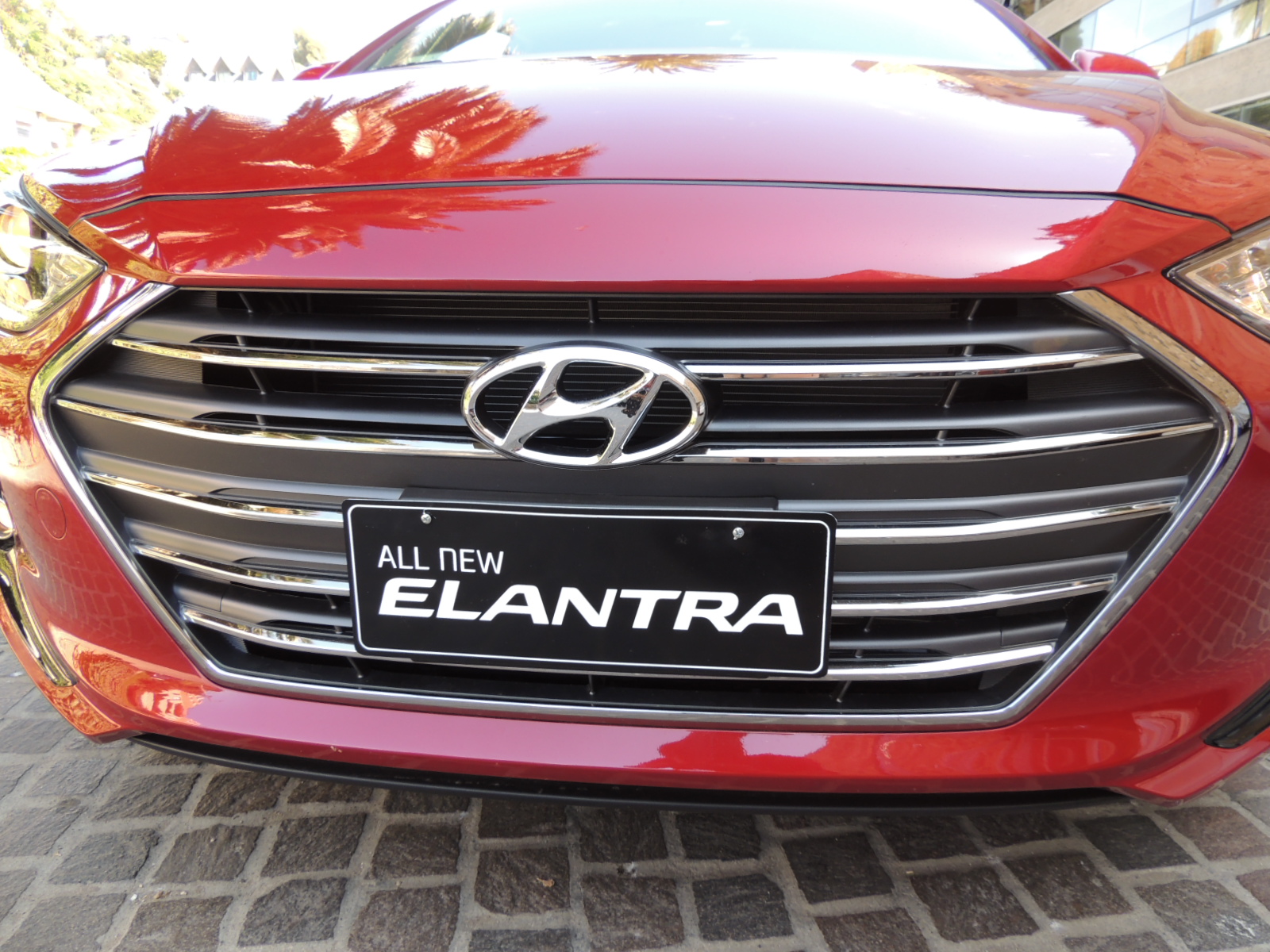 Sven Jacob, Gerente de Producto de Hyundai fue el encargado de desmenuzar las intimidades de este renovado Elantra 2016, partiendo por su frontal, donde la línea del capó se subió, mientras que el aspecto tridimensional de su grilla hexagonal (que se asemeja a la del Génesis) le da una sensación de deportividad con refinamiento, lo que forma parte de la filosofía de diseño de Escultura fluida 2.0, donde las luces delanteras alargadas, ahora disponen de DRL, además de otorgarle una identidad propia. La máscara, en virtud de la versión, puede ir en negro satinado o bien con contornos y listones cromados.