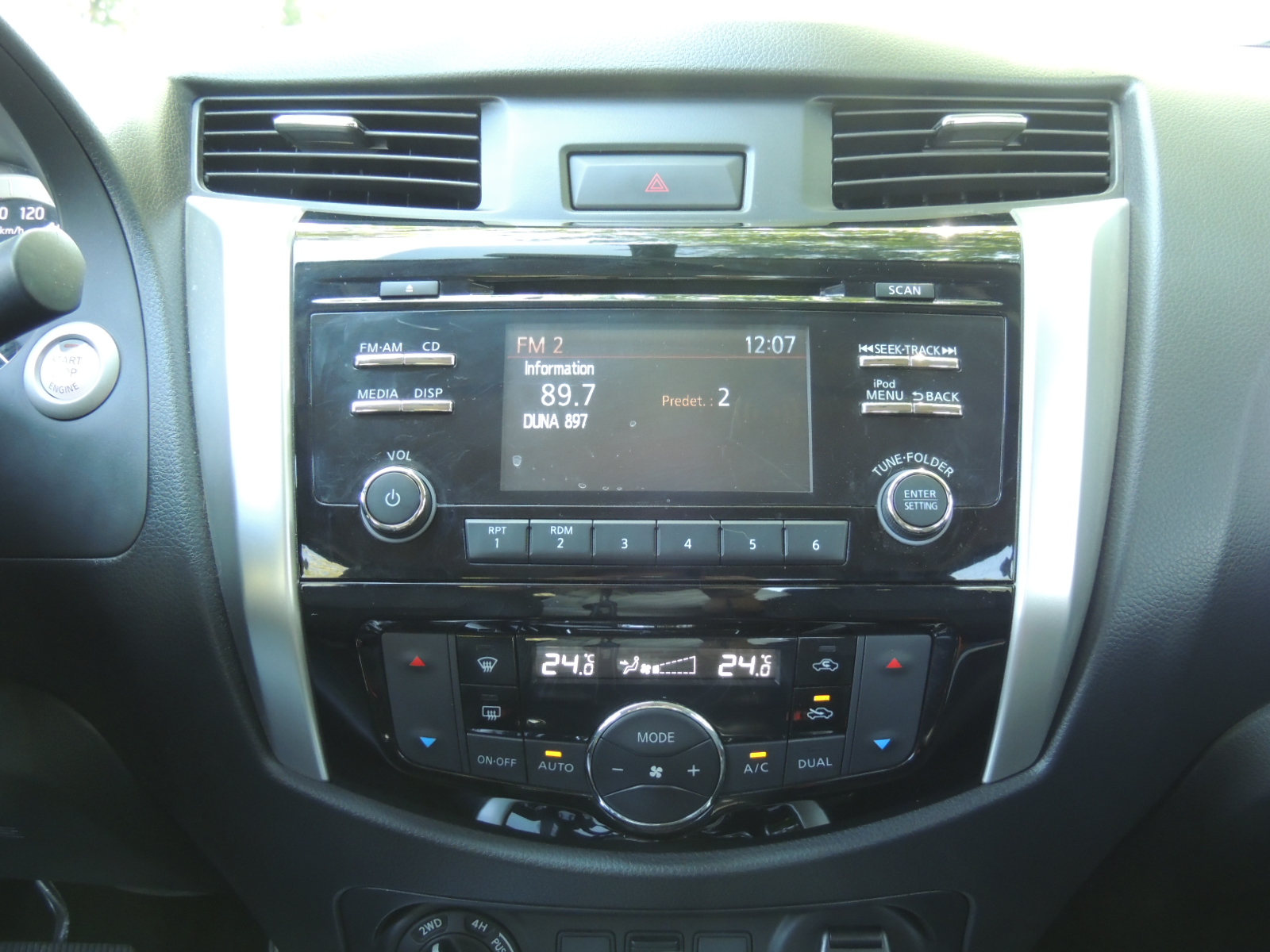 Al centro de la consola encontramos el sistema de audio con seis altavoces y pantalla de 5″ a color, con reproductor de CD/MP3, entrada auxiliar y puerto USB. Más abajo se ubican los comandos digitales del climatizador bi-zona. Luego se encuentra la manilla giratoria para los modos del sistema de tracción, el bloqueo de diferencial trasero, el control de descenso y el de activación o no del sensor de retroceso.