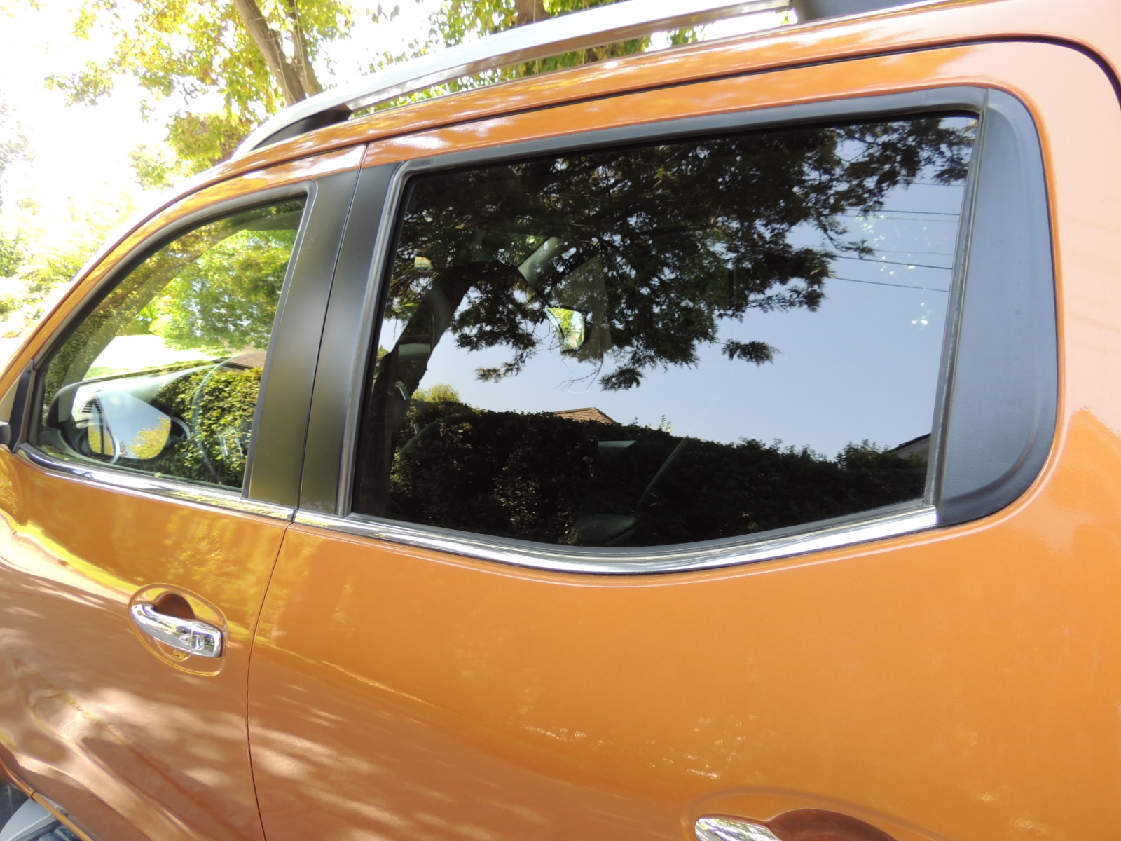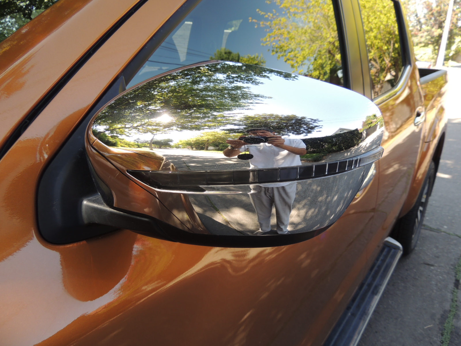 Vista de costado, vemos que sus generosos pasos de ruedas lucen muy llamativos. Sus líneas se mantienen equilibradas tanto en la cabina como en la zona de carga. La superficie vidriada es más generosa en la zona delantera que en la posterior (los ocupantes traseros disponen de vidrios ahumados). Un listón cromado marca la separación entre las ventanas y la superficie de acero de las puertas (con tiradores también cromados), además de conferirle más elegancia a la NP 300. Nos gustaron sus generosos espejos retrovisores externos con acabado cromado (exclusivo de la LE, las otras llevan acabado de resina negro), repetidores de los intermitentes integrados en la carcasa, regulables y plegables eléctricamente, que entregan una excelente retrovisión, al igual que el espejo interior con brújula (que en esta versión, también podría ser fotocromático o con atenuación automática, en vez de la clásica perilla de ajuste manual).