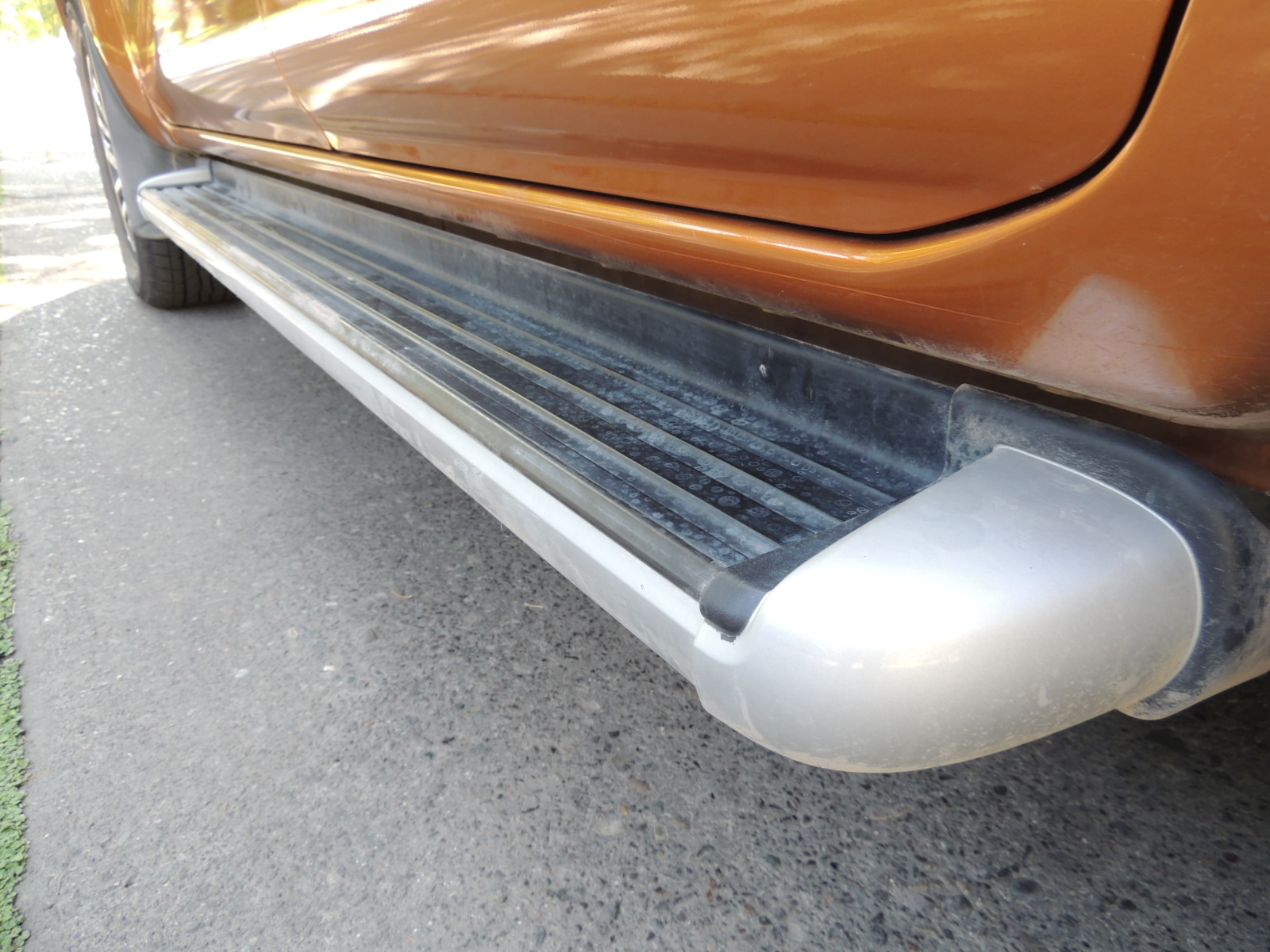Para facilitar la entrada y salida de los ocupantes, especialmente de aquellas/os de estatura más baja, la NP 300 LE dispone de estriberas laterales, que pueden resultar algo limitantes a la hora de enfrentar ciertos obstáculos (si tuviesen ocultamiento eléctrico, ¿sería mucho pedir?, o que se pudiesen desmontar a voluntad). Calza neumáticos Maxis 770 Bravo H/T de medida 255/60 R18 (opcionalmente se puede ordenar con unos A/T 255/70 R16) con llantas de aleación de aluminio pulido con diseño de seis rayos dobles. Otro elemento distintivo del acabado LE son sus barras de techo satinadas. Las versiones propulsadas por el motor diésel, llevan la grafía «Diesel» en ambos costados de la caja de carga. Las aletas de guradafangos en las cuatro ruedas son de serie en todas las versiones. Su ángulo ventral alcanza los 25,2º, mientras que su generoso despeje llega a los 255,4mm.