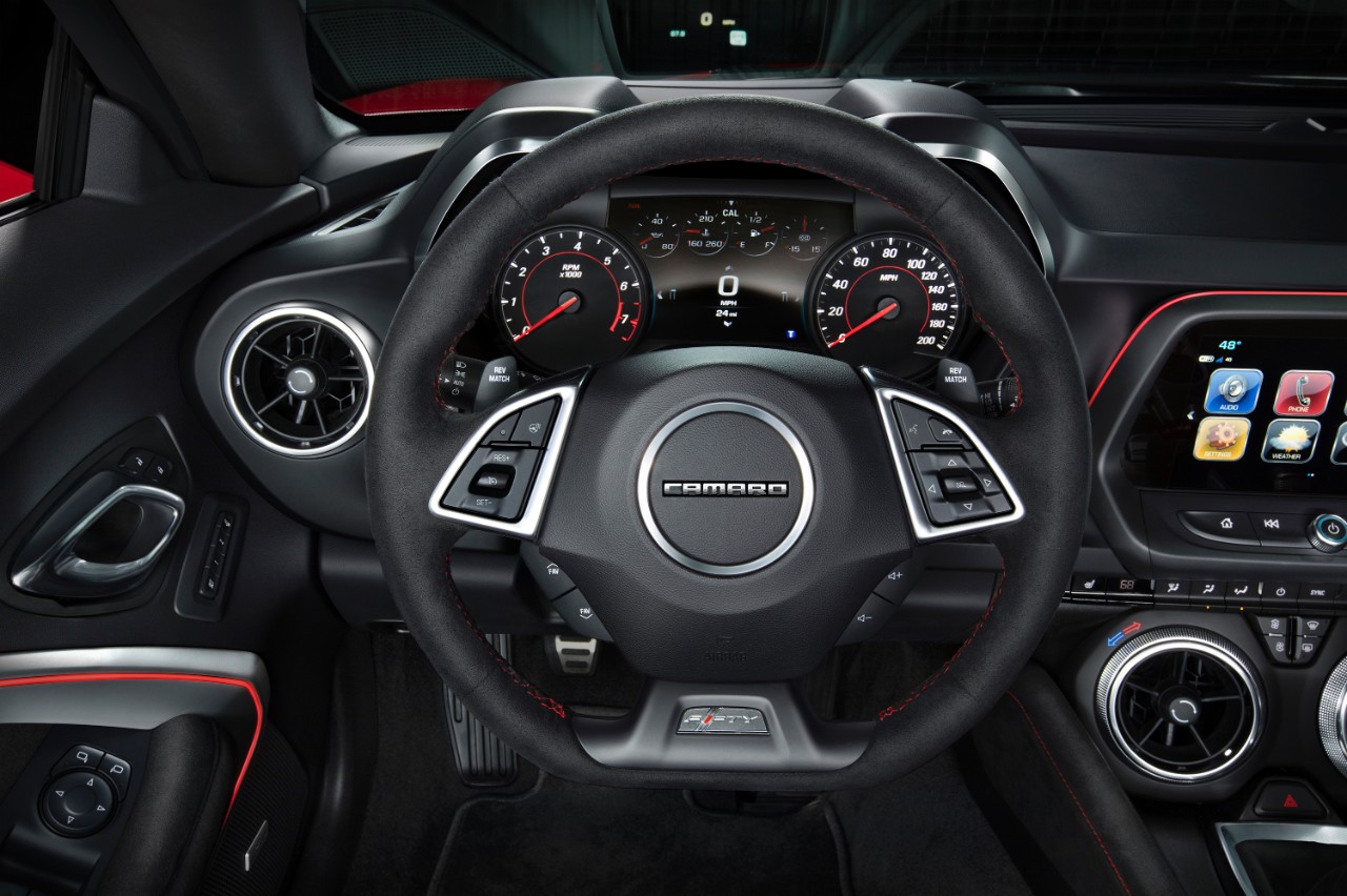 La apertura de la parrilla inferior, por ejemplo, ofrece un mayor flujo de aire en comparación con el Camaro SS, y la rejilla superior incorpora una nueva versión del logo de Chevrolet. También hay un nuevo capó, con un inserto de fibra de carbono y extractor de calor que saca el aire caliente del compartimiento del motor. Otros cambios incluyen un divisor frontal más grande, un alerón trasero de estilo ala y pasos de ruedas delanteros más amplios – todo afinado para mejorar la aerodinámica y asi darle una mayor estabilidad a altas velocidades.