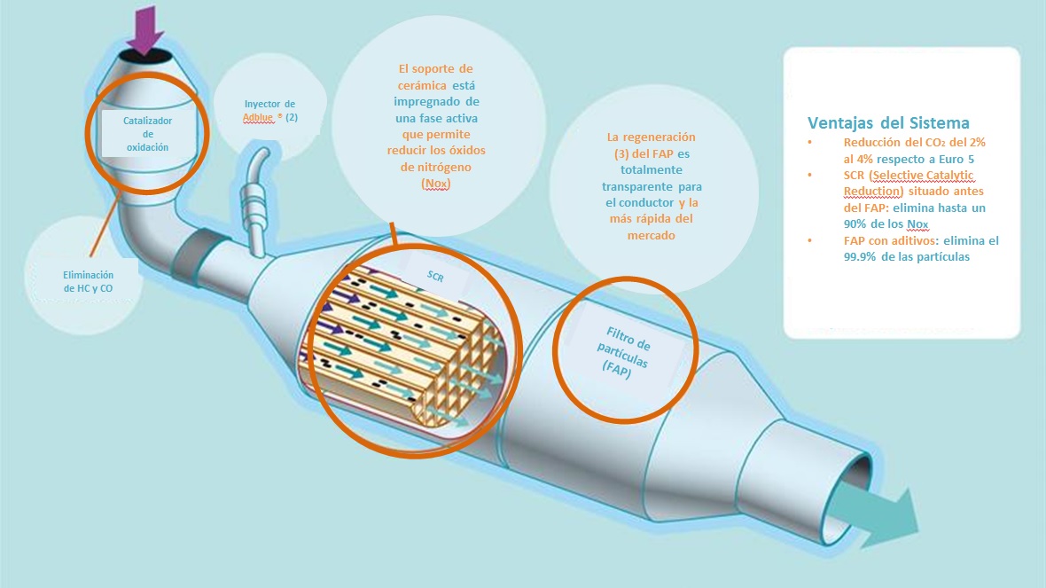 La tecnología Blue HDi alude a que las emisiones contaminantes de este tipo de propulsores son tratadas continuamente, puesto que la línea de escape está equipada con tres elementos de descontaminación: el catalizador de oxidación, el filtro de partículas, y el SCR que elimina los óxidos de nitrógeno que emite el motor. Esta tecnología está protegida por más de un centenar de patentes.