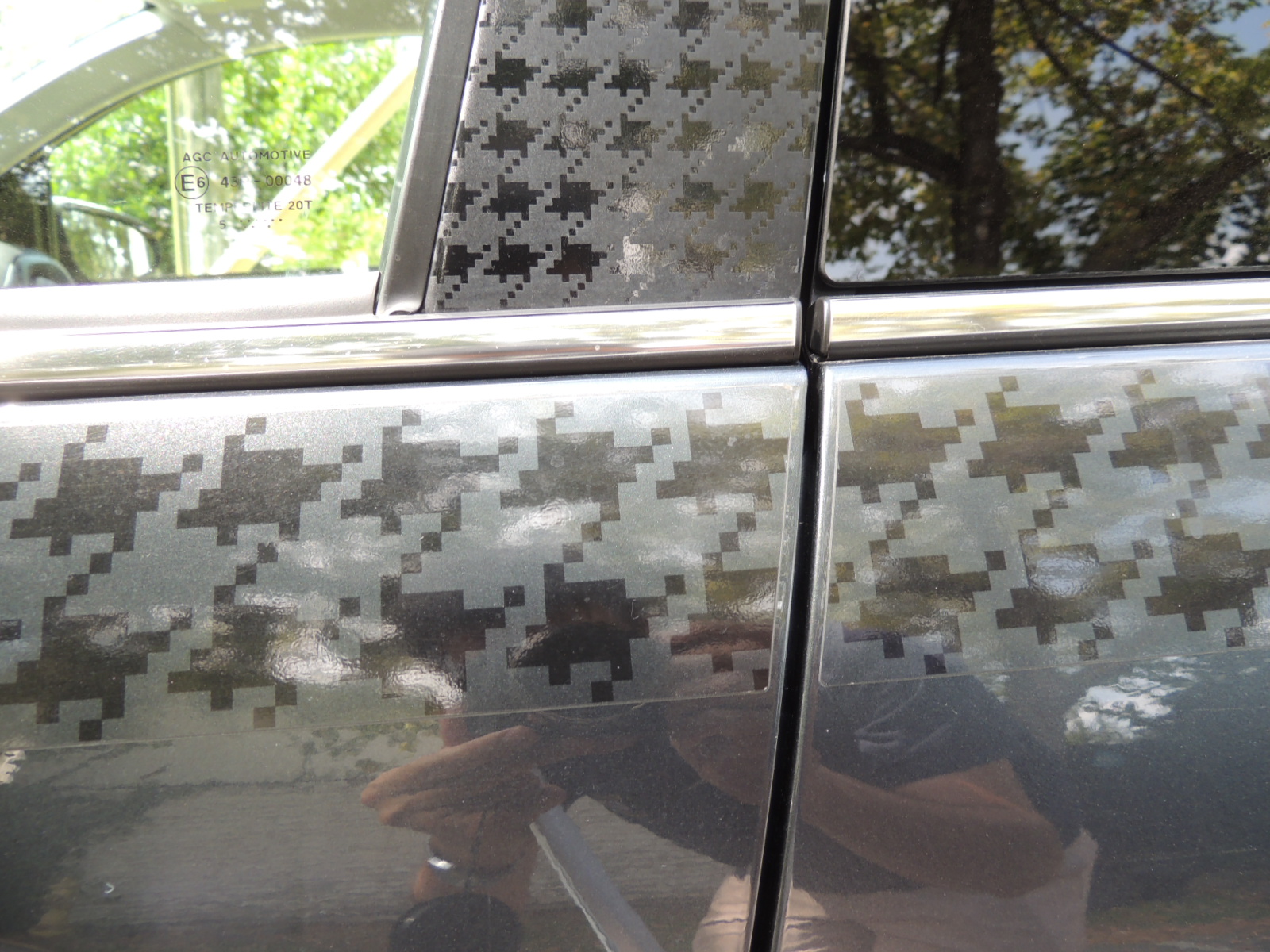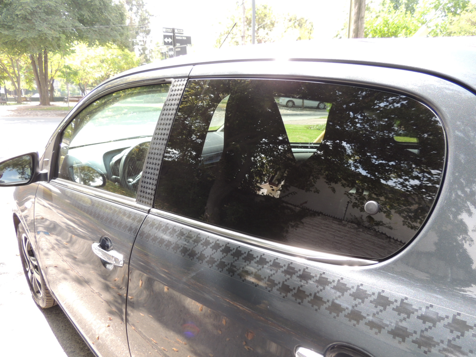 Al verlo de costado, los voladizos están reducidos a su mínima expresión, poniendo de manifiesto la compacidad del modelo. Acceder a su cabina es muy sencillo gracias a sus amplias puertas. Nos llamó la atención del particular recubrimiento de sus espejos retrovisores externos con el tema Dressy que combina el aspecto chic y deportivo, motivo que se repite en una banda adhesiva integrada en la parte inferior de las ventanas, pilar B, alfombras interiores y ciertas zonas del tablero. La ausencia del clásico intermitente integrado en los espejos exteriores (que nos hubiese gustado ver en esa pieza) es suplida por los repetidores situados en los pasos de ruedas. Ambas ventanas laterales posteriores, heredan del 107 su carácter pivotante, además de darle un toque de exclusividad, el hecho de que sean polarizadas. Una línea cromada que emerge de las aletas delanteras, se extiende por toda la parte baja de los vidrios laterales, separando la superficie vidriada de la de acero. Los tiradores de las puertas, revestidos en cromo aportan su cuota a la elegancia del conjunto.