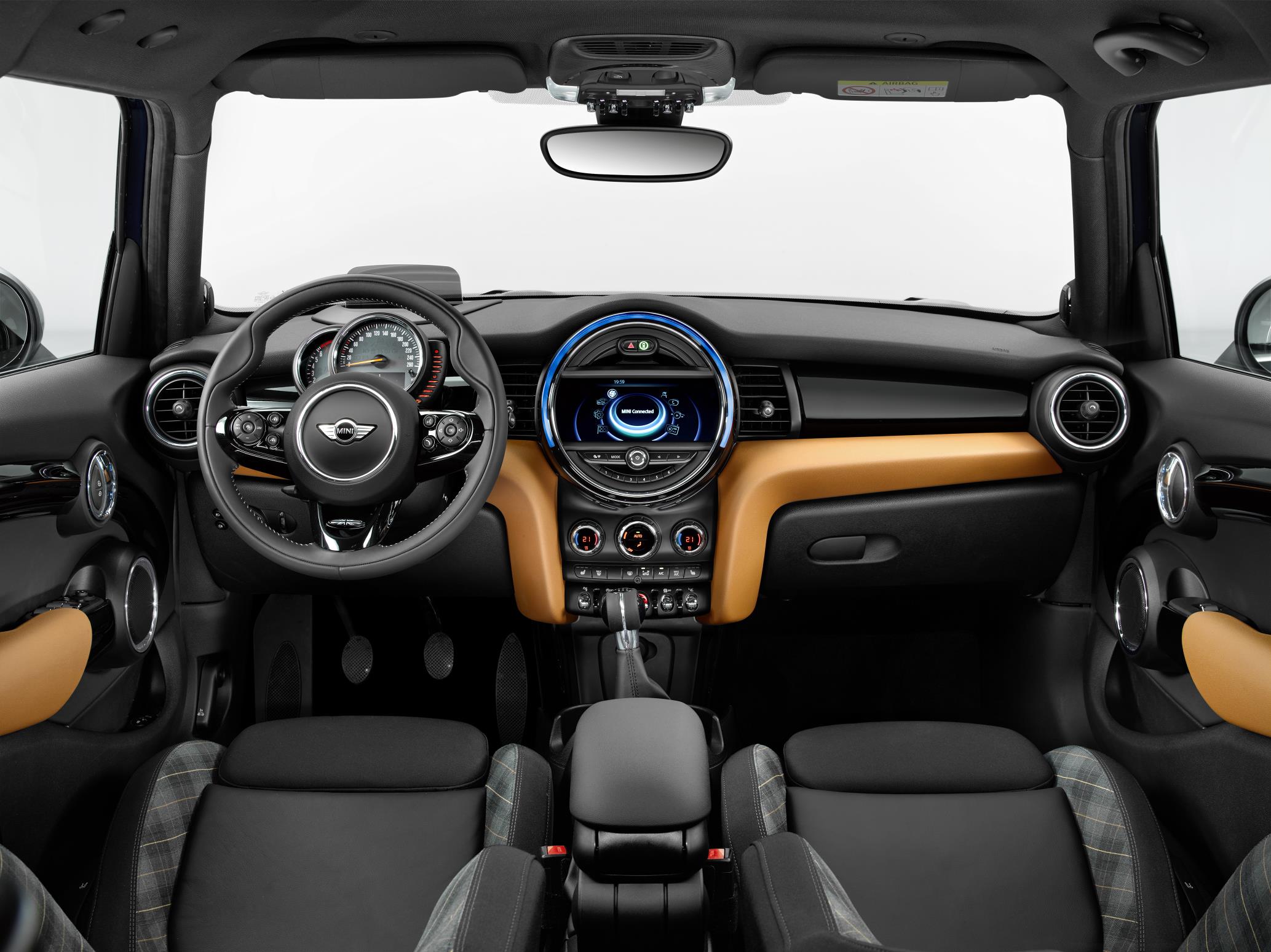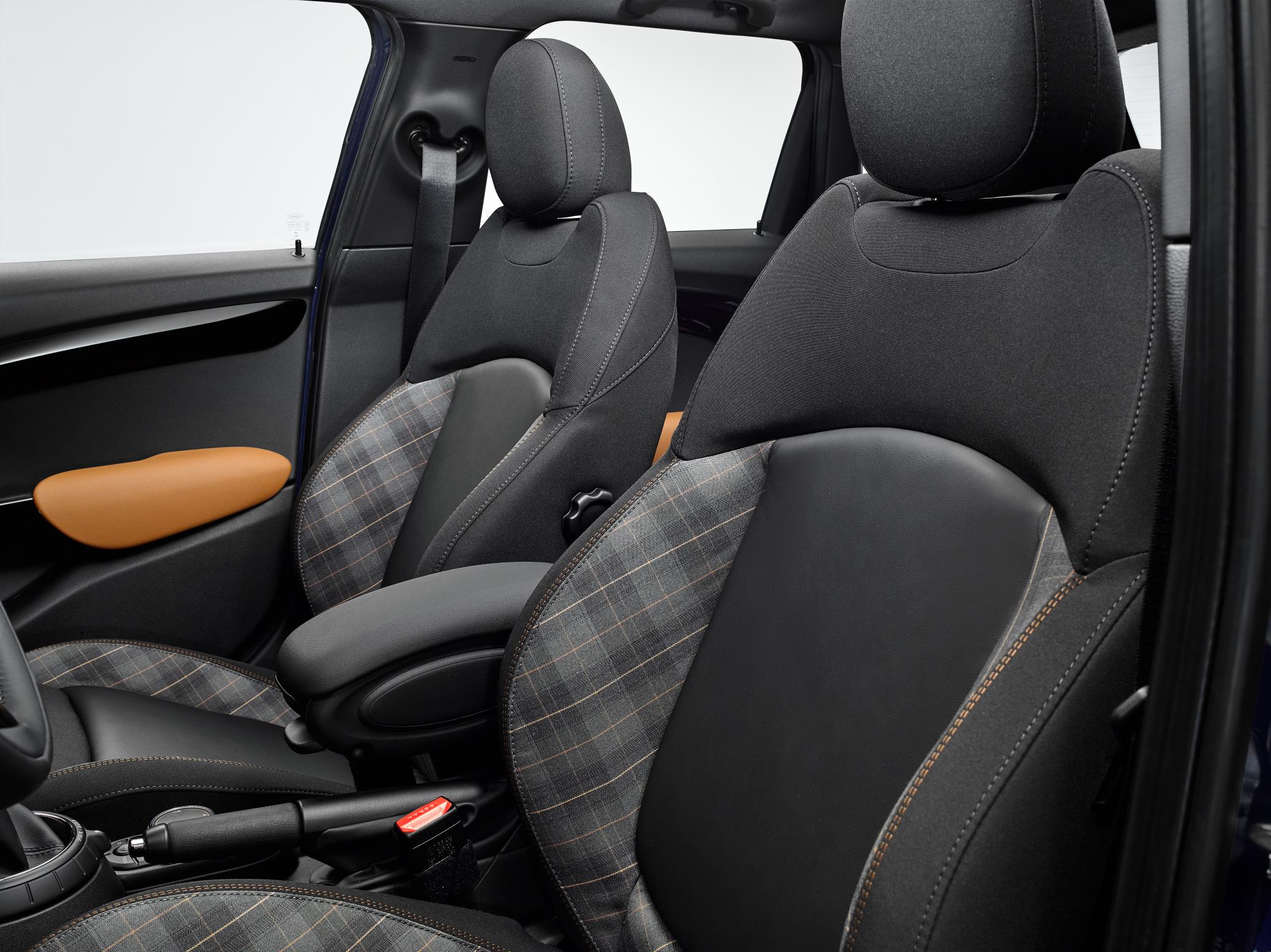 - Habitáculo con diseño «ambiente»: Asientos tapizados en tela/cuero, superficies interiores con recubrimiento Piano Black y logotipo MINI Seven el instrumento central.