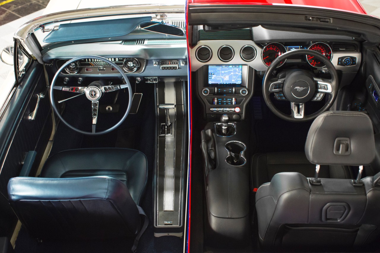 En las fotos que ilustran la nota, se puede ver un Mustang convertible blanco de 1965, mientras que a la derecha está su simil contemporáneo de 2015, con la particularidad de que viene con volante a la derecha, donde así se vende en varios de los 150 mercados a los que es exportado.