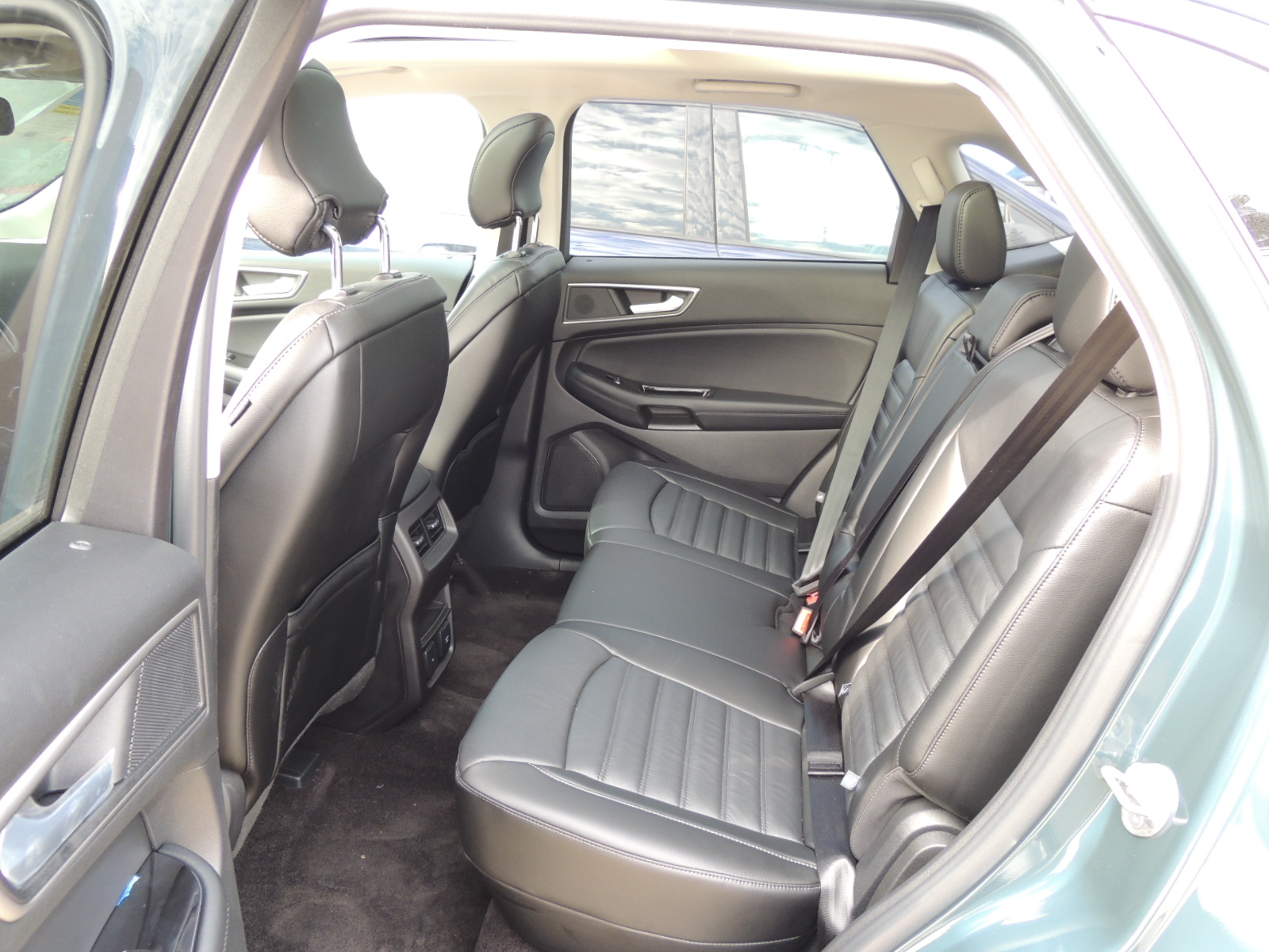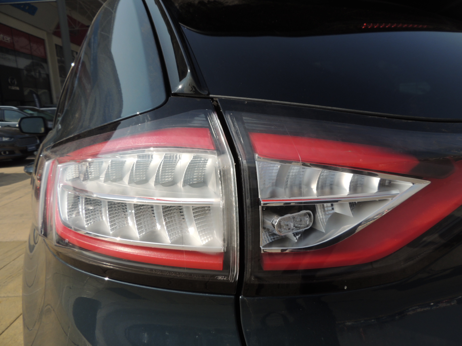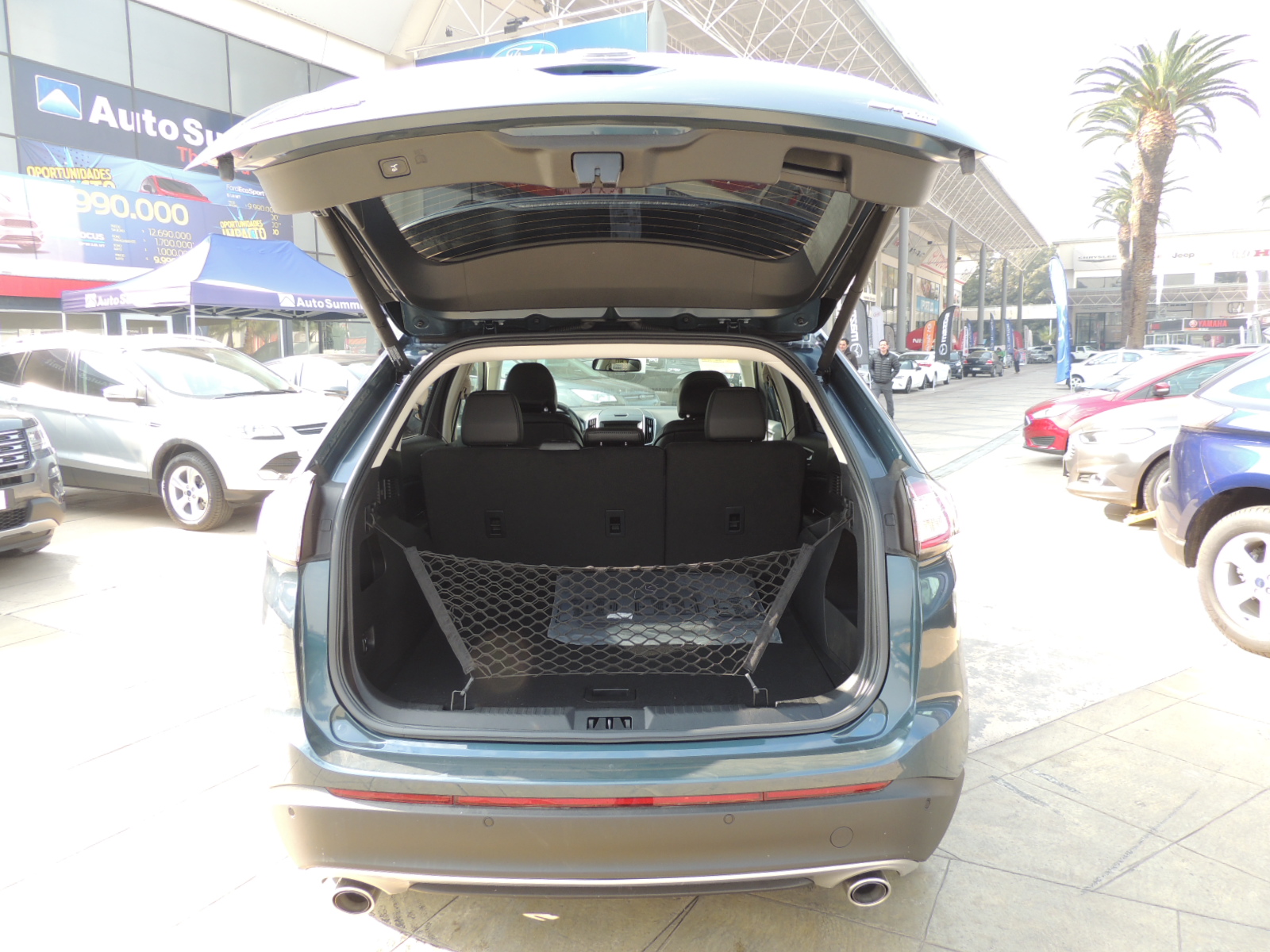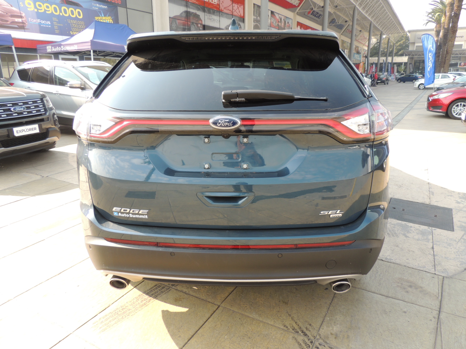Por detrás, mantiene su generoso spoiler posterior con una tercera luz de freno LED. Sus ópticos con tecnología LED recorren toda la parte alta de esta sección, otorgándole un aspecto deportivo y premium a la vez. Los logos del modelo y nivel de equipamiento van ubicados más cercas del borde infarior del portalón, mientras que las salidas de escape cromadas le otorgan una apariencia muy dinámica a esta sección del Edge.