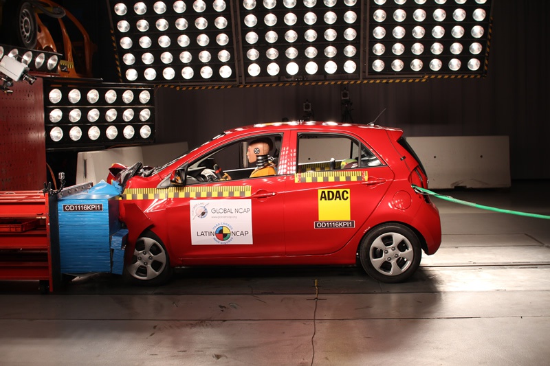 El Kia Morning, fabricado en Corea del Sur, fue probado en la versión más básica de seguridad disponible en los mercados de Latin NCAP. Cabe consignar que en nuestro país, Morning se ofrece en las versiones 1.0 EX con airbag sólo para el conductor y 1.2 EX con doble bolsa de aire frontal. La falta de airbags explica el resultado pobre en el test a pesar de que la estructura fue catalogada como estable. El bajo puntaje para protección de ocupante infantil es determinado por las lecturas elevadas en los dummies durante la prueba de choque, la falta de cinturones seguridad de tres puntas en todas las posiciones e instrucciones erróneas por parte del manual de instrucciones para la instalación de Sistemas de Retención Infantil (SRI). El modelo no fue probado en impacto lateral debido a que en el impacto frontal obtuvo cero estrellas.