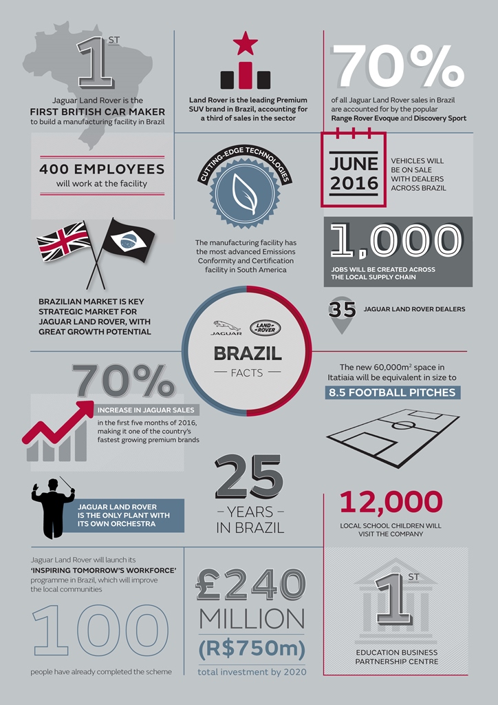 En la inauguración de la nueva planta, Wolfgang Stadler, director ejecutivo de Fabricación dijo: “La apertura del nuevo edificio Jaguar Land Rover de clase mundial es el último hito importante dentro de nuestra expansión global. Land Rover ya es líder en el mercado brasileño para modelos SUV premium medianos, lo que representa más del 30% de todas las ventas en ese segmento. El Range Rover Evoque y el Discovery Sport ahora se fabricarán por primera vez en América Latina, basados en la popularidad entre los clientes en Brasil”.