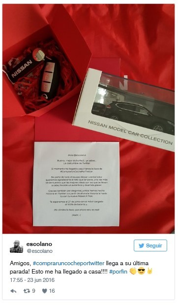 Todo empezó a finales de marzo, cuando el usuario de Twitter Raúl Escolano, catalán de 38 años y especialista en marketing digital, (@escolano) expuso la posibilidad de comprar un auto a través de Twitter bajo la etiqueta #compraruncocheportwitter. Escolano lanzó un reto a las distintas marcas de automoción en España para poder adquirir un vehículo 100% mediante redes sociales.