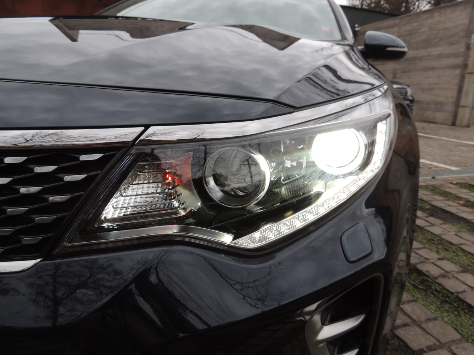 Reconocible instantáneamente como un Kia, el nuevo Optima 2.4 GT Line integra la parrilla ‘tiger-nose’ característica de la marca con faros más largos, anchos y envolventes, estirados de forma tensa hacia los prominentes pasos de rueda. El paragolpes se prolonga hacia ángulos laterales audaces alrededor de las tomas de aire laterales satinadas (que reemplazan los neblineros LED del 2.0 EX, lo que añade un mayor volumen a la parte inferior del frontal y da al auto una imagen más ancha y estable. Asimismo, la toma de aire inferior luce un listón satinado que realza esa sección del sedán. Otro elemento diferenciador son las boquillas de los lavafaros, que mantienen limpios los ópticos de xenón con luces diurnas LED y sistema de luz de apoyo en curva, que KIA denomina como SBL (Static Bending Light).