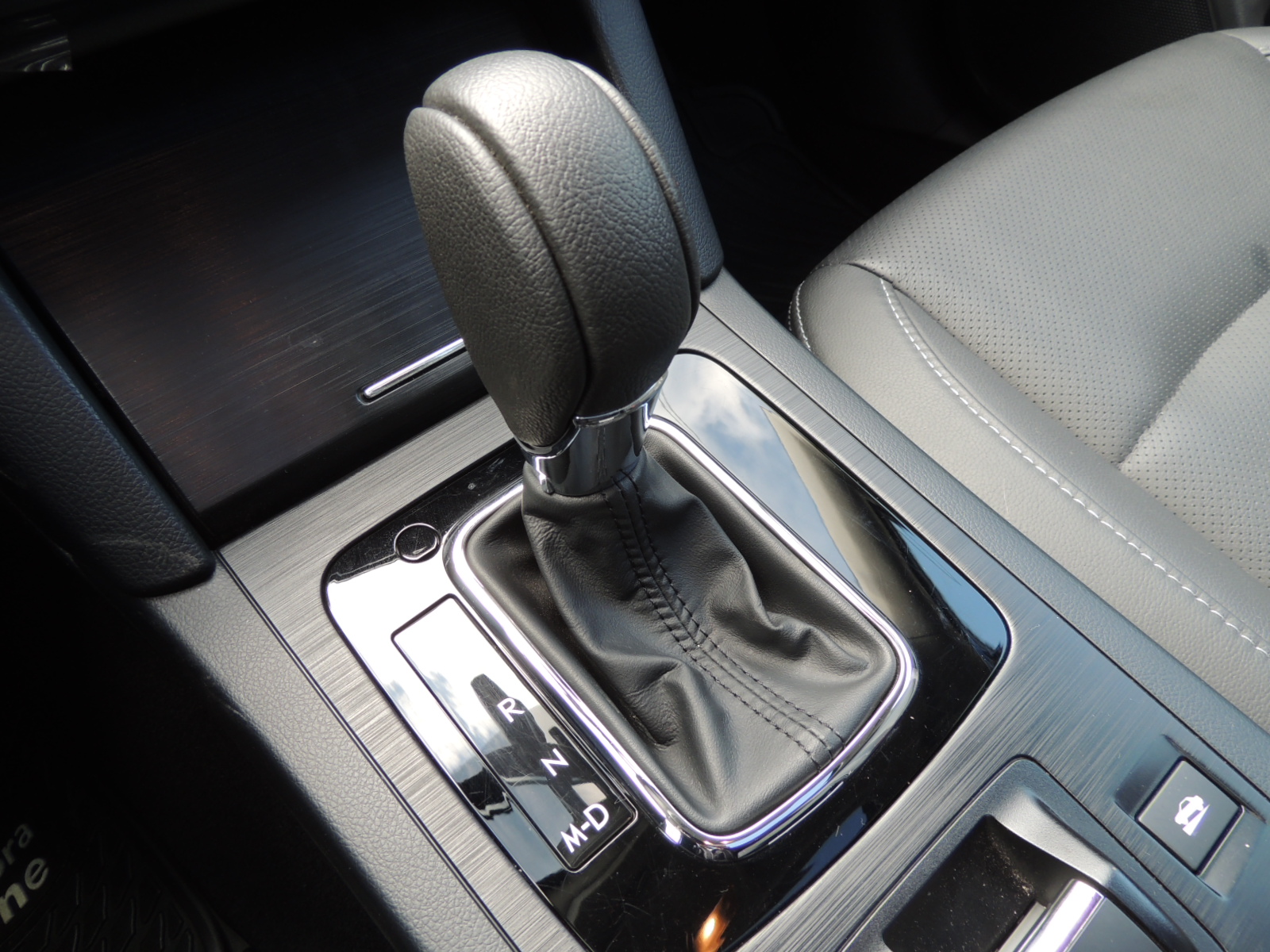La palanca selectora de la transmisión CVT Lineartronic presenta empuñadura revestida en cuero con las a estas alturas clásicas posiciones P, R,N, M/D. Esta última nos permite escoger entre manejo automático o bien, para darle más dinamismo, subir o rebajar marchas por medio de las paletas situadas en el volante.