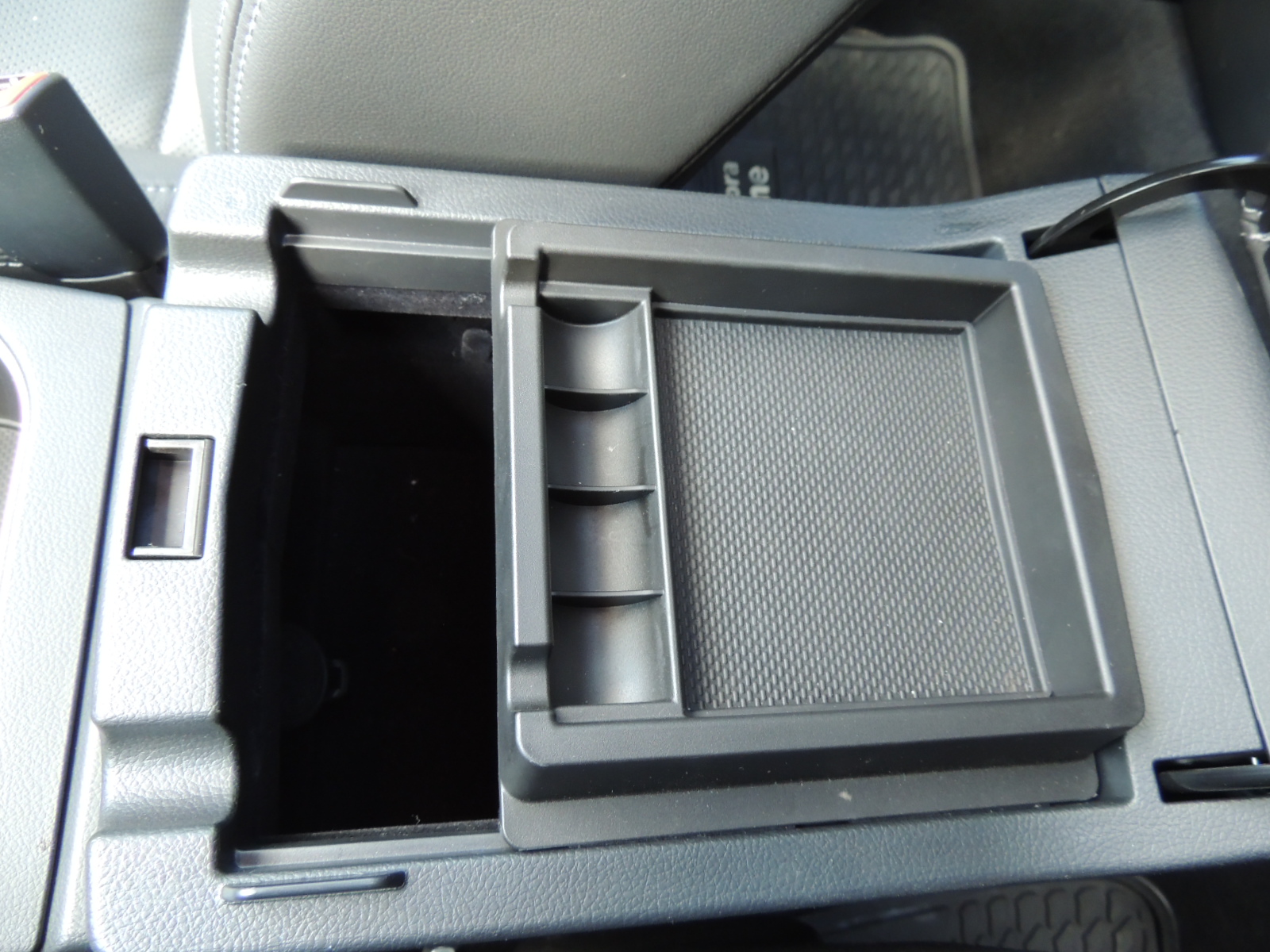 Entre ambos asientos delanteros encontramos un reposabrazos central que oculta una gran consola central, dividida en dos secciones: una desmontable para objetos menores como monedas, tarjetas y lapiceras y otra más profunda alfombrada con una toma adicional de 12V.