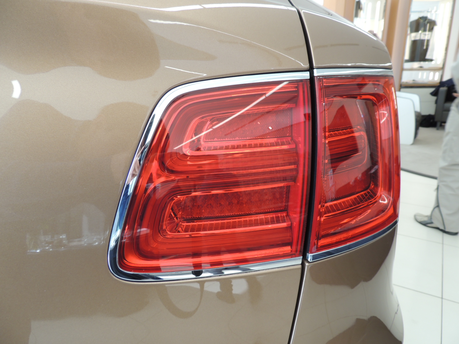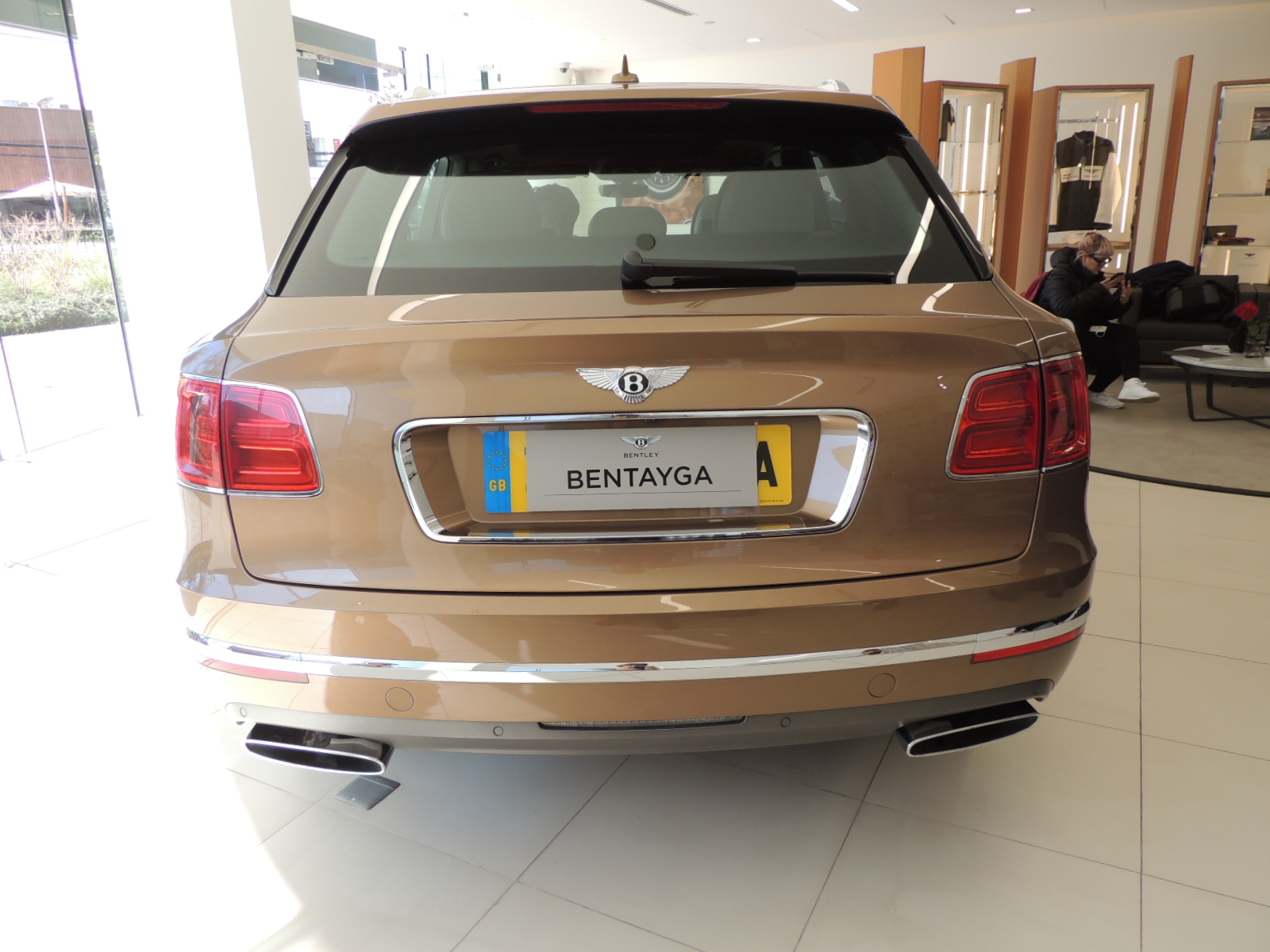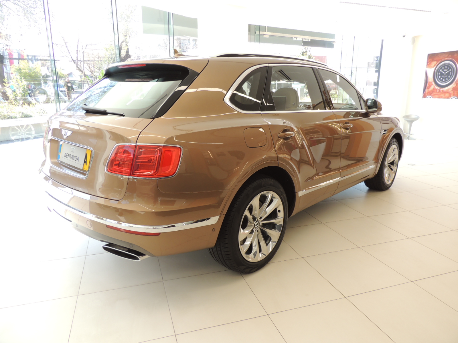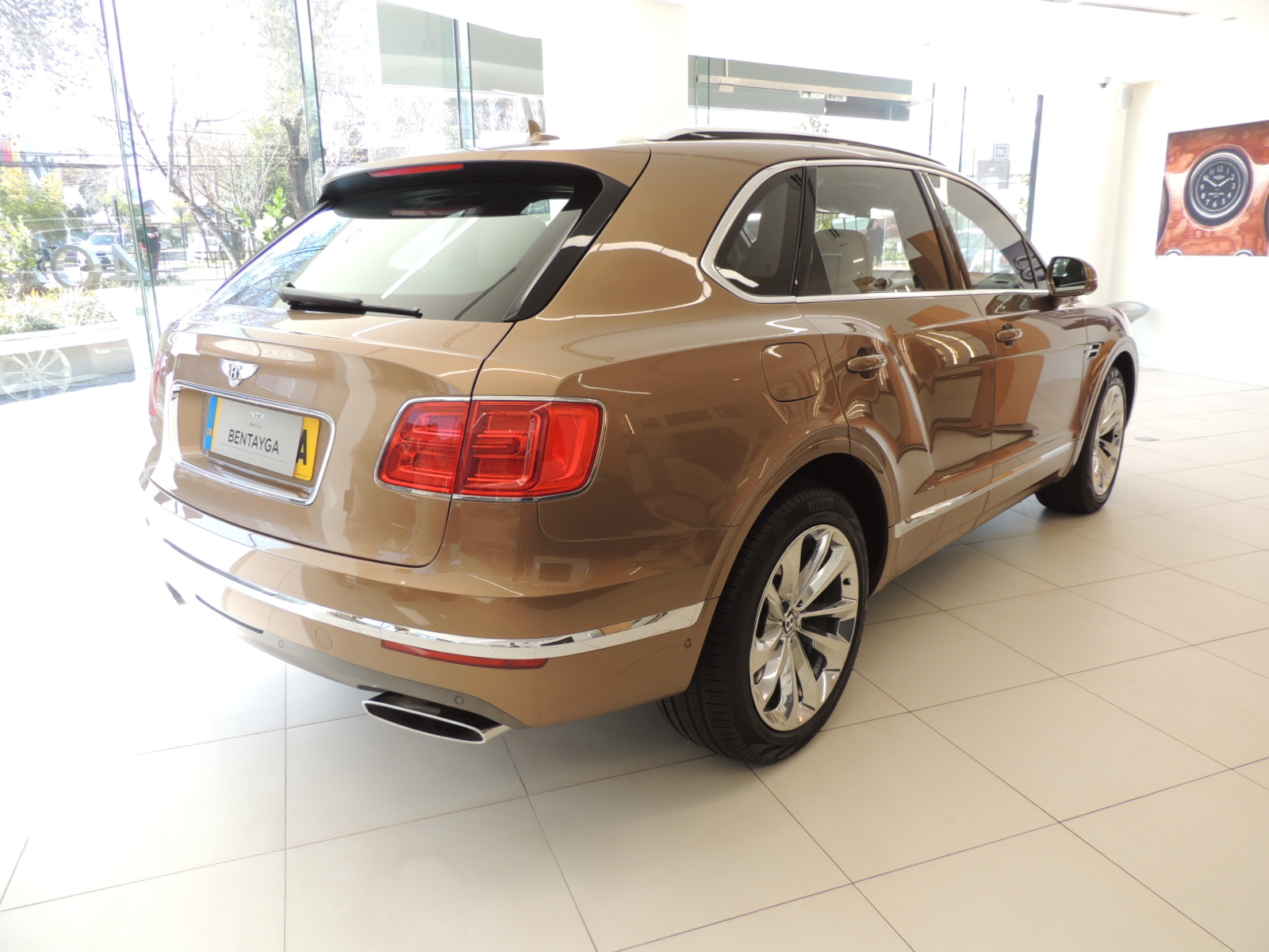 La ventana trasera dispone de un elegante limpiaparabrisas posterior, además de describir una suave curva que se remata a la altura de los ópticos segmentados con gráfica luminosa en forma de B, le da a esta parte del Bentayga un diseño distintivo y exclusivo. El logo característico de Bentley preside la zona del portapatente, que se ve realzado con un elegante contorno cromado, mismo recurso que se aplica para el contorno de los ópticos pero de manera más sutil.