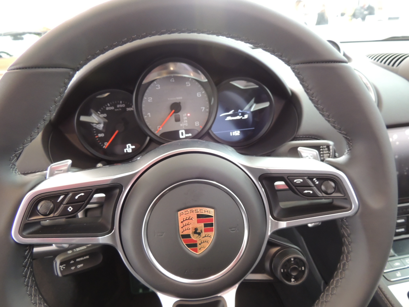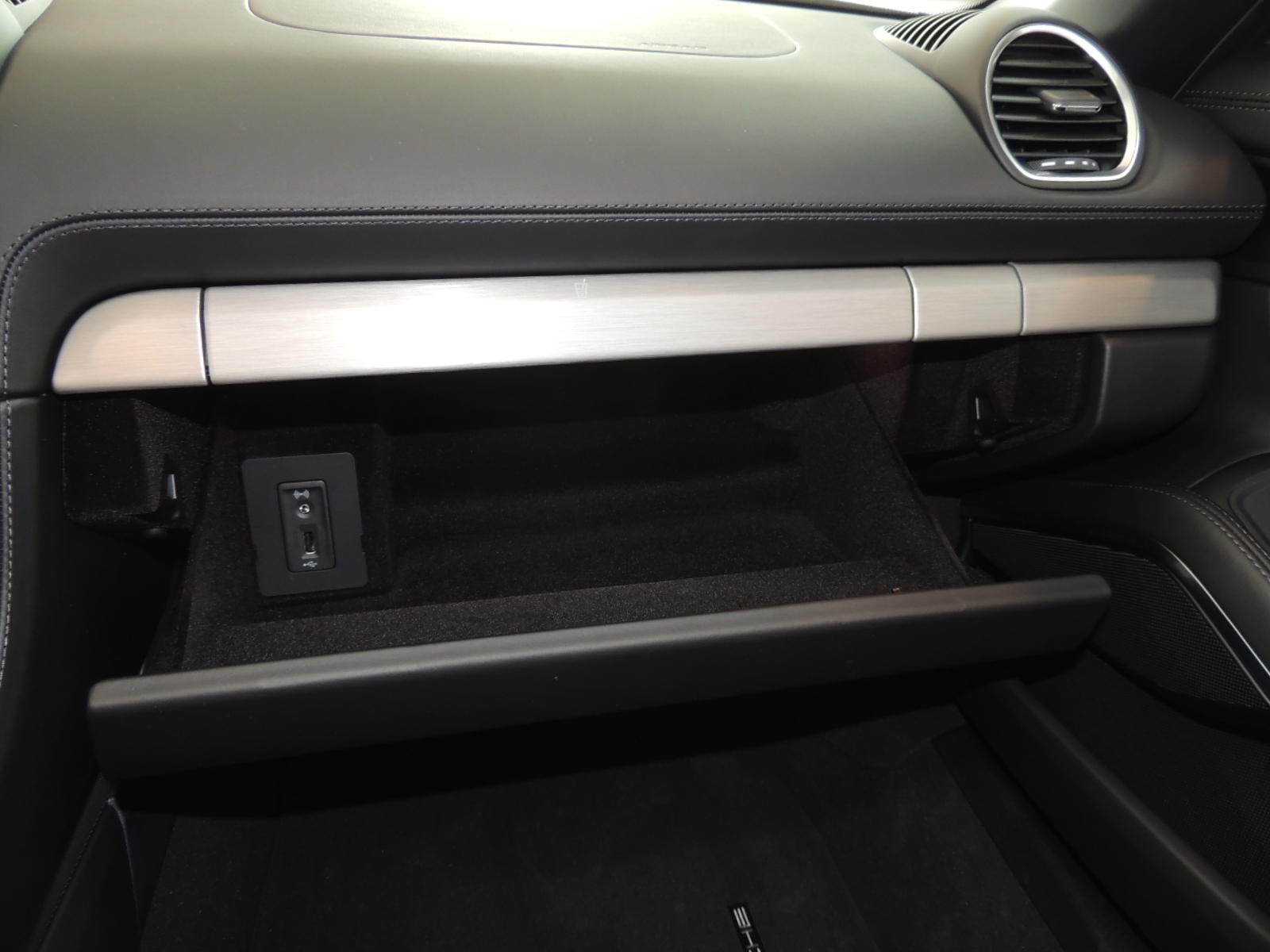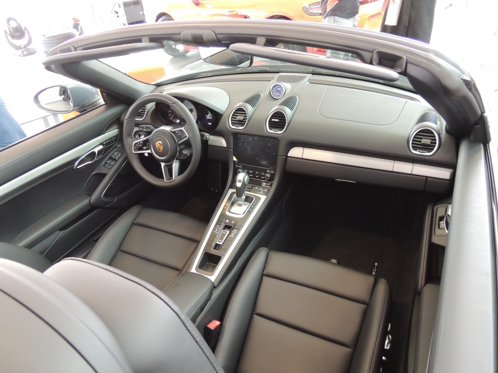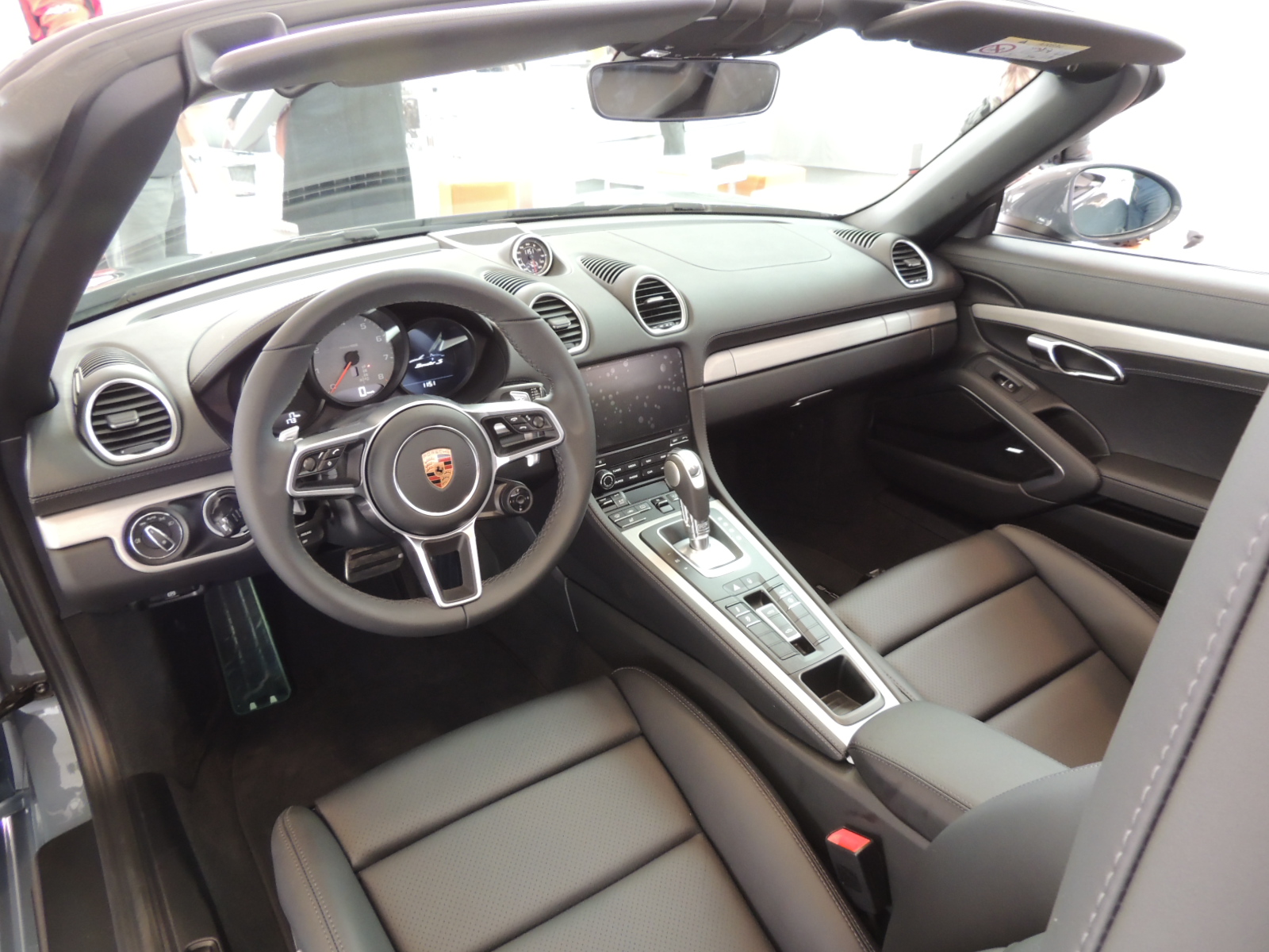 El conductor se encontrará en el habitáculo del 718 Boxster ese ambiente interior tan propio de Porsche, ahora mejorado con nuevos elementos como son un nuevo volante deportivo de estilo purista, la consola central ascendente, el cuadro de instrumentos con tres relojes analógicos, que de izquierda a derecha son velocímetro, tacómetro y un computador de abordo de generosas 4,6″ a color con múltiples informaciones acerca del funcionamiento del auto y el sistema de audio y comunicación.