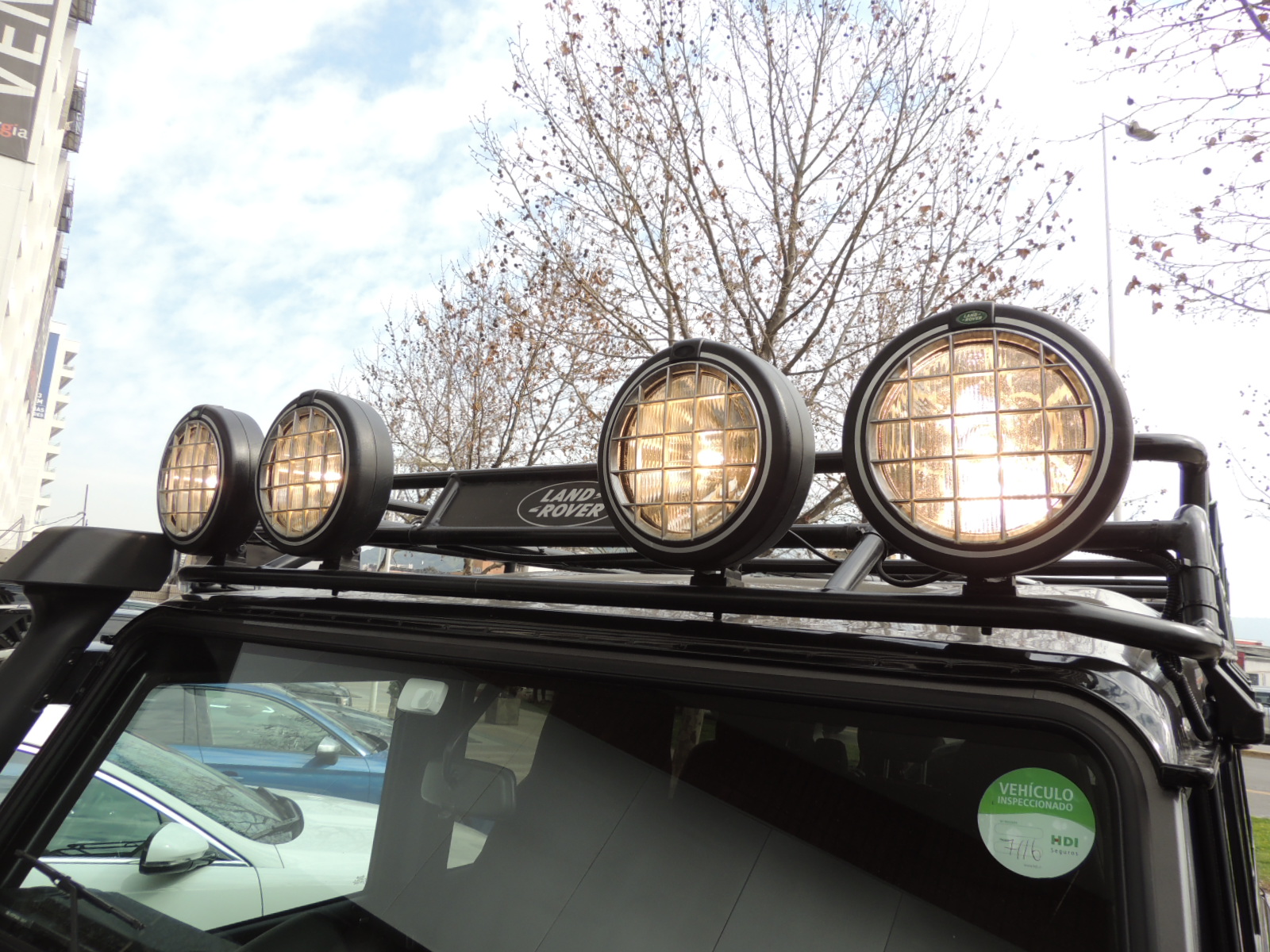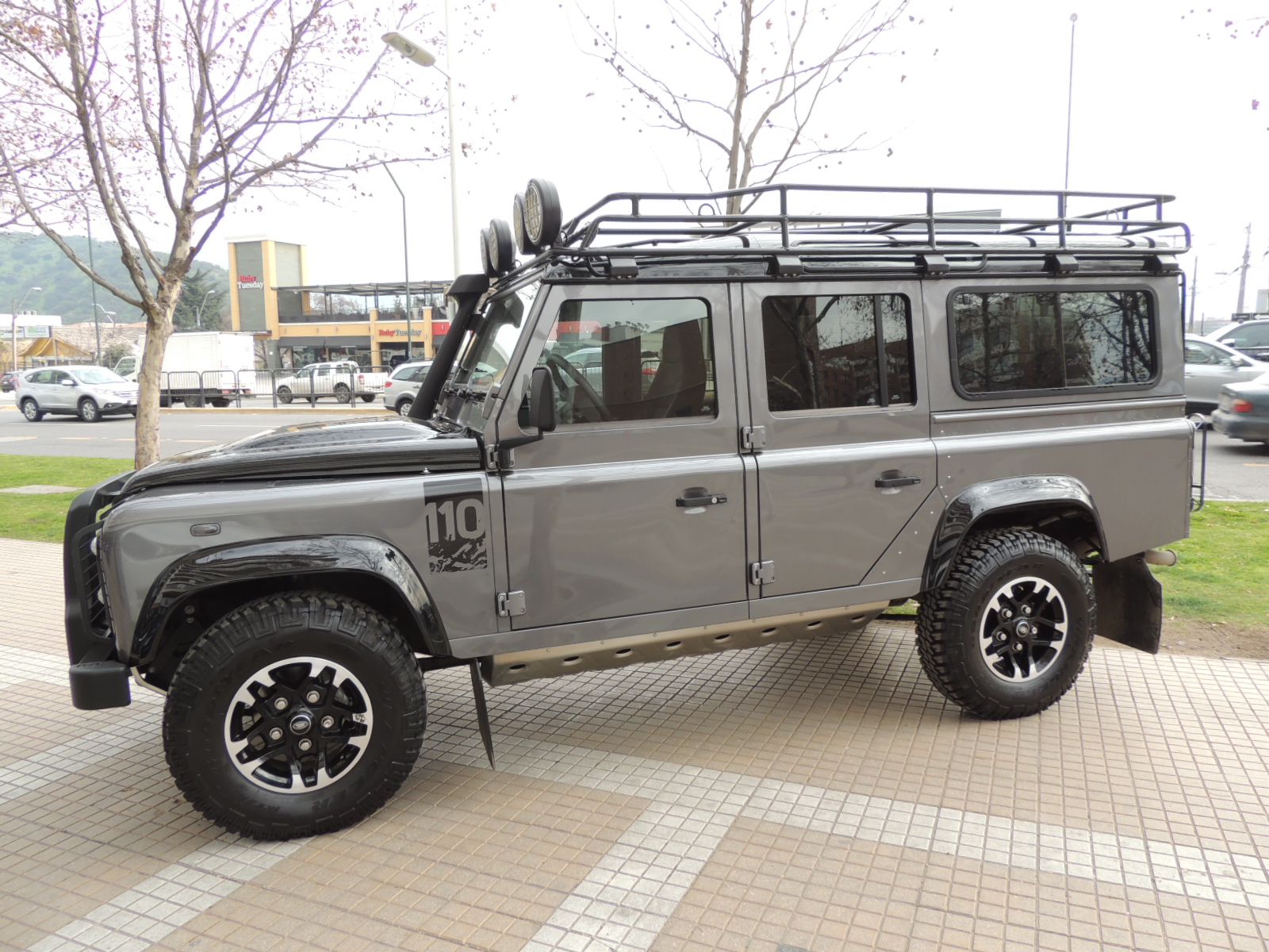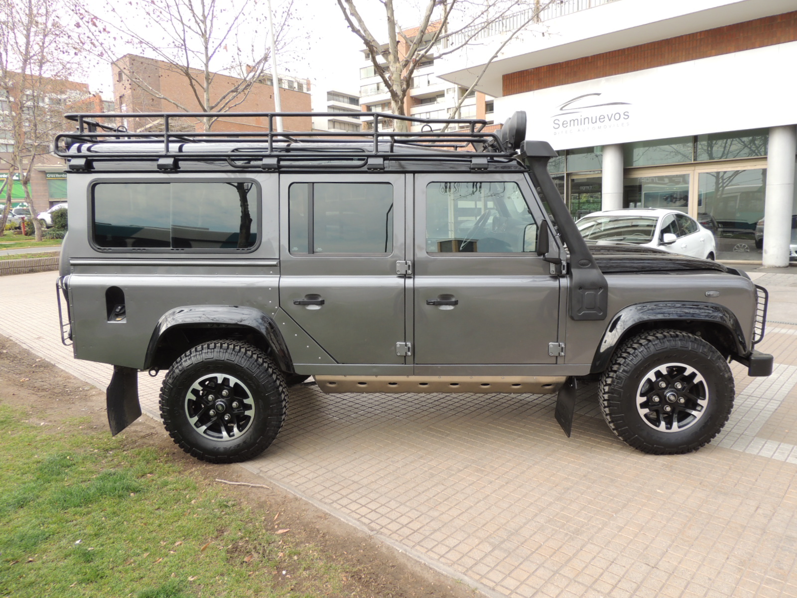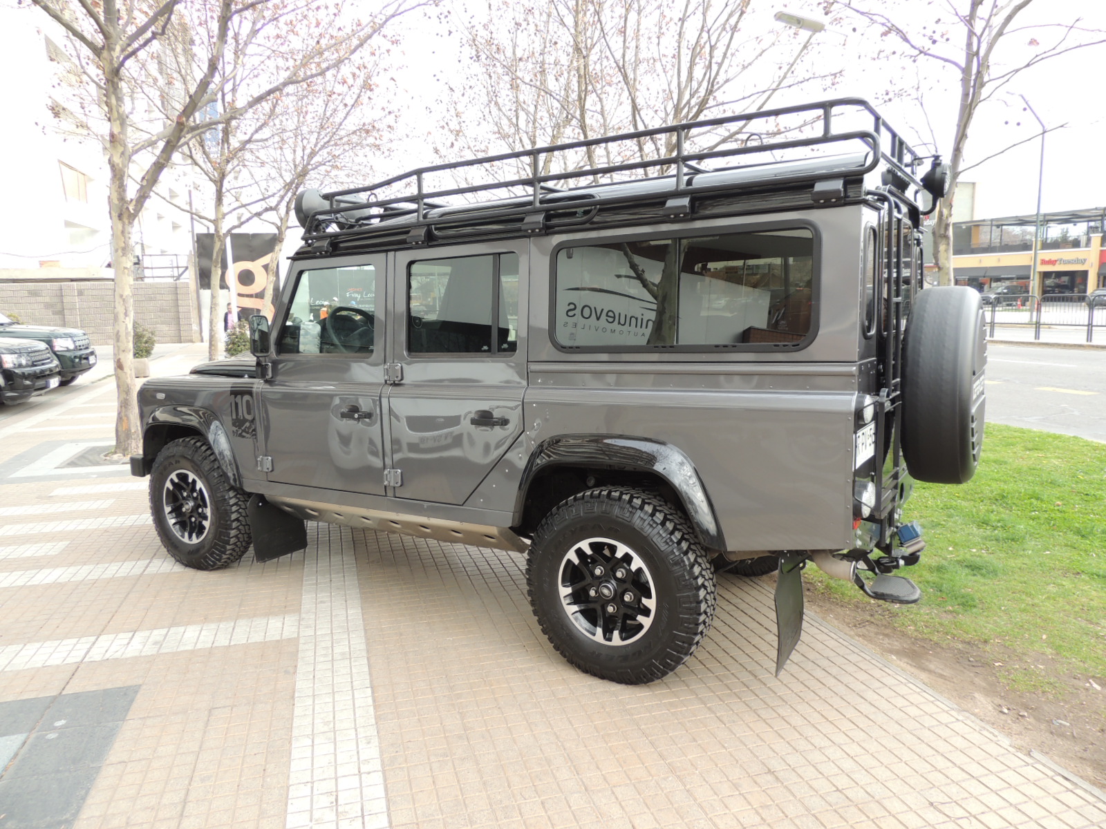 Los faros delanteros con proyector LED de siete pulgadas, los indicadores frontales transparentes y las llantas de aleación de radio doble y pulido a espejo Gloss Black distinguen al modelo, inspirado en las expediciones. Los alerones frontales cuentan con etiquetas adhesivas de los modelos 90 y 110. Además, mantiene el Rack Defender sobre el techo, snorkel y acceso posterior a la parrilla de techo mediante escala.