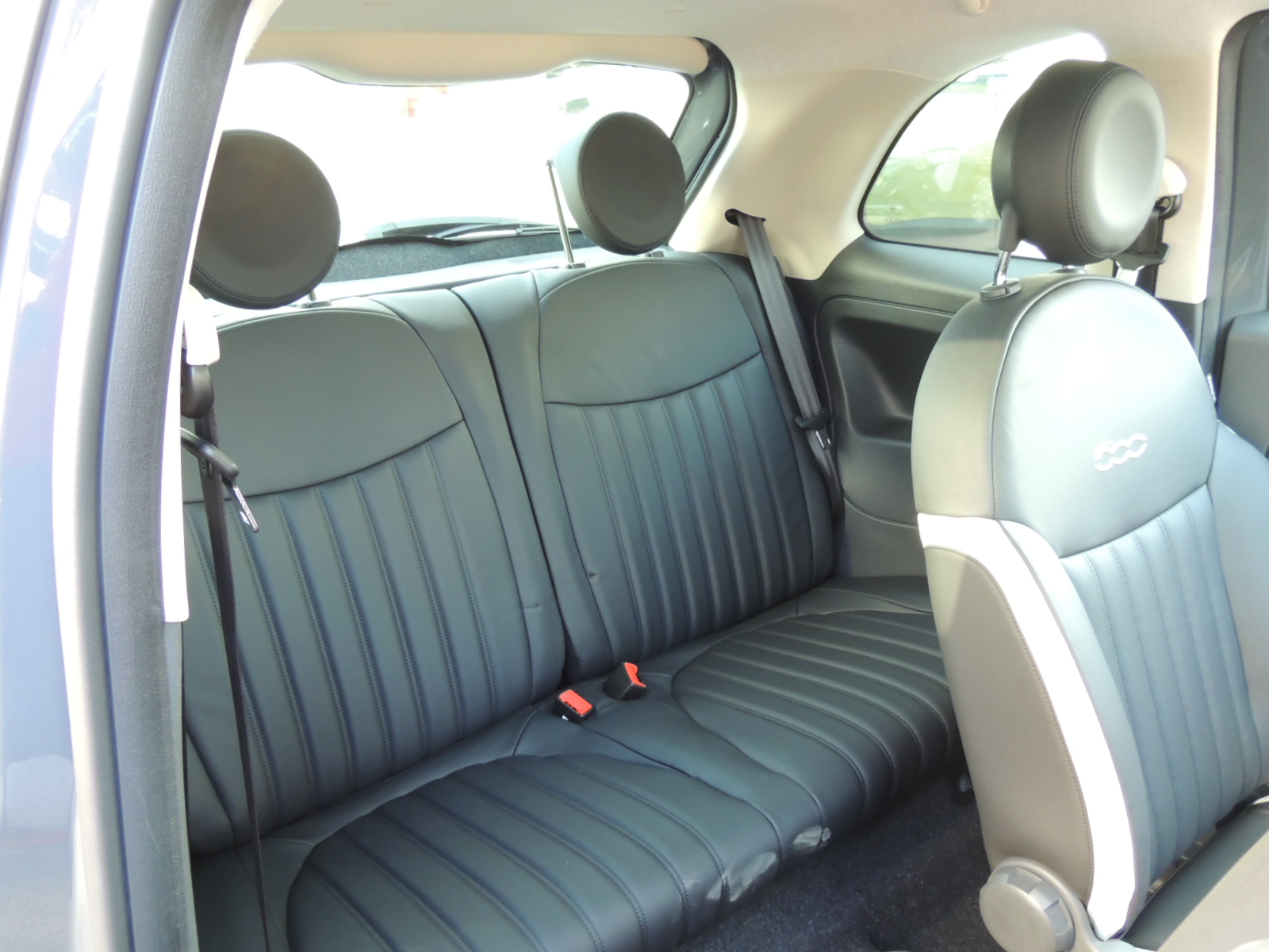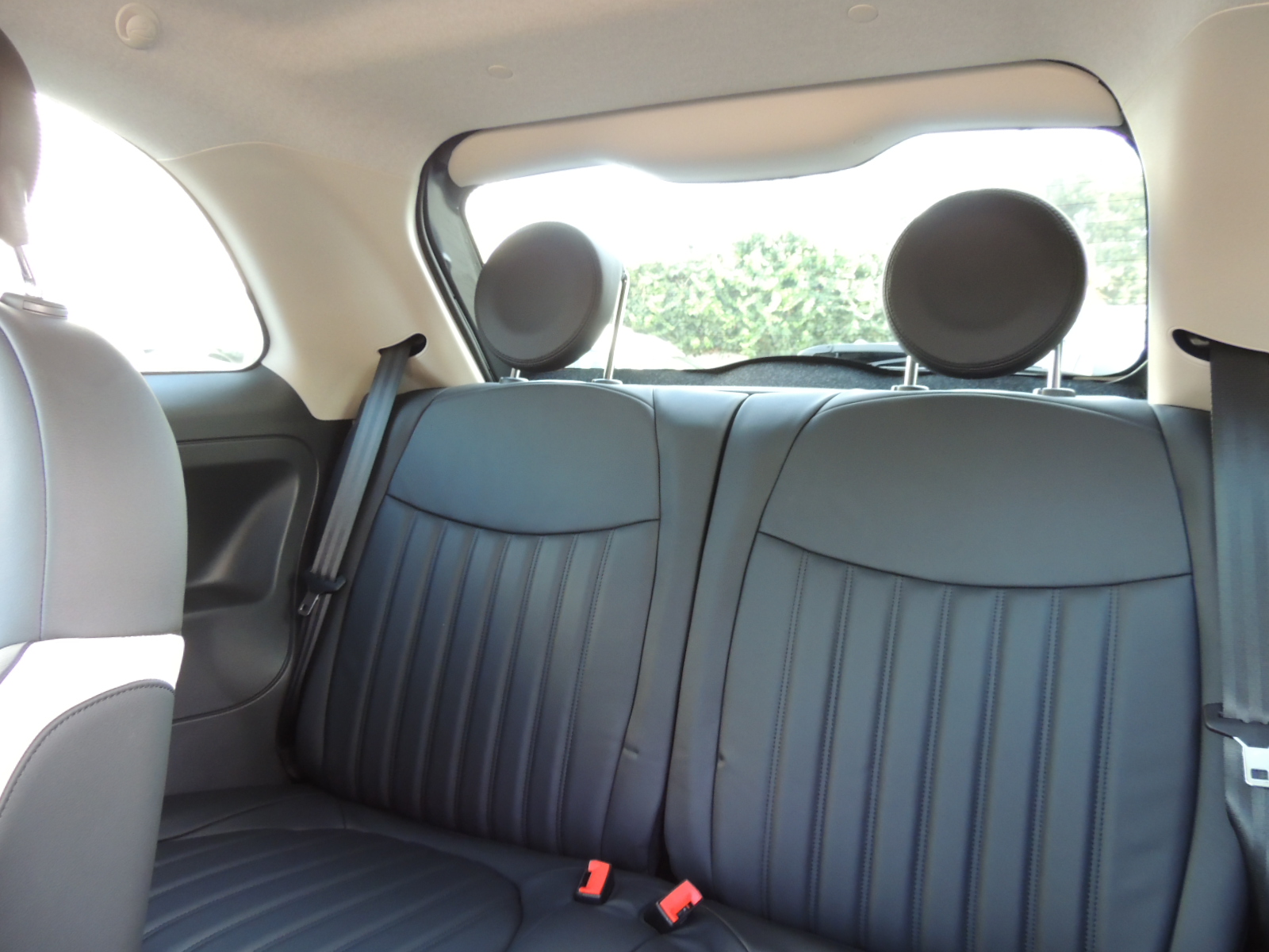 La unidad que conocimos dispone de tapicería de cuero con bordes en color marfil con apoyacabezas negro y el logo «500» bordado en el respaldo, también en tono marfil. El acceso a los asientos posteriores se realiza de manera sencilla: basta con reclinar el asiento y levantar una palanca de la parte alta del respaldo para que éste se deslice hacia adelante suavemente. Para una persona de estatura alta, debemos ser sinceros, el espacio disponible es escaso.