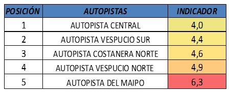 Así, el ranking de comportamiento del primer semestre del 2016 lo lideró Autopista Central, con un índice de 4; mientras que el peor comportamiento lo obtuvo la Autopista del Maipo, con un índice de 6,3.