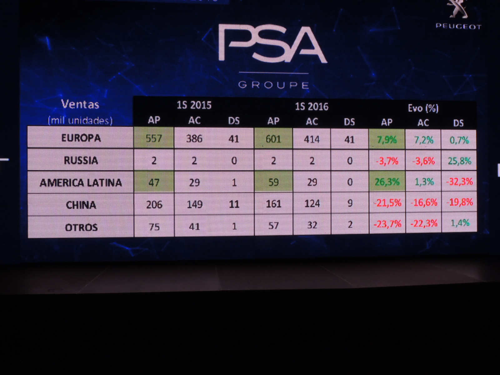 A nivel mundial, sobre todo en Europa, se aprecia que la participación de mercado del Grupo PSA(Peugeot – Citroën y DS) crece con un 11,3% de uno de los mercados más grandes del planeta. En América Latina se aprecia una caída de los mercados, anotando un retroceso de casi un 8%. Pero a pesar de esa caída, el Grupo PSA está ganando participación de mercado, con un market share de casi 4%.