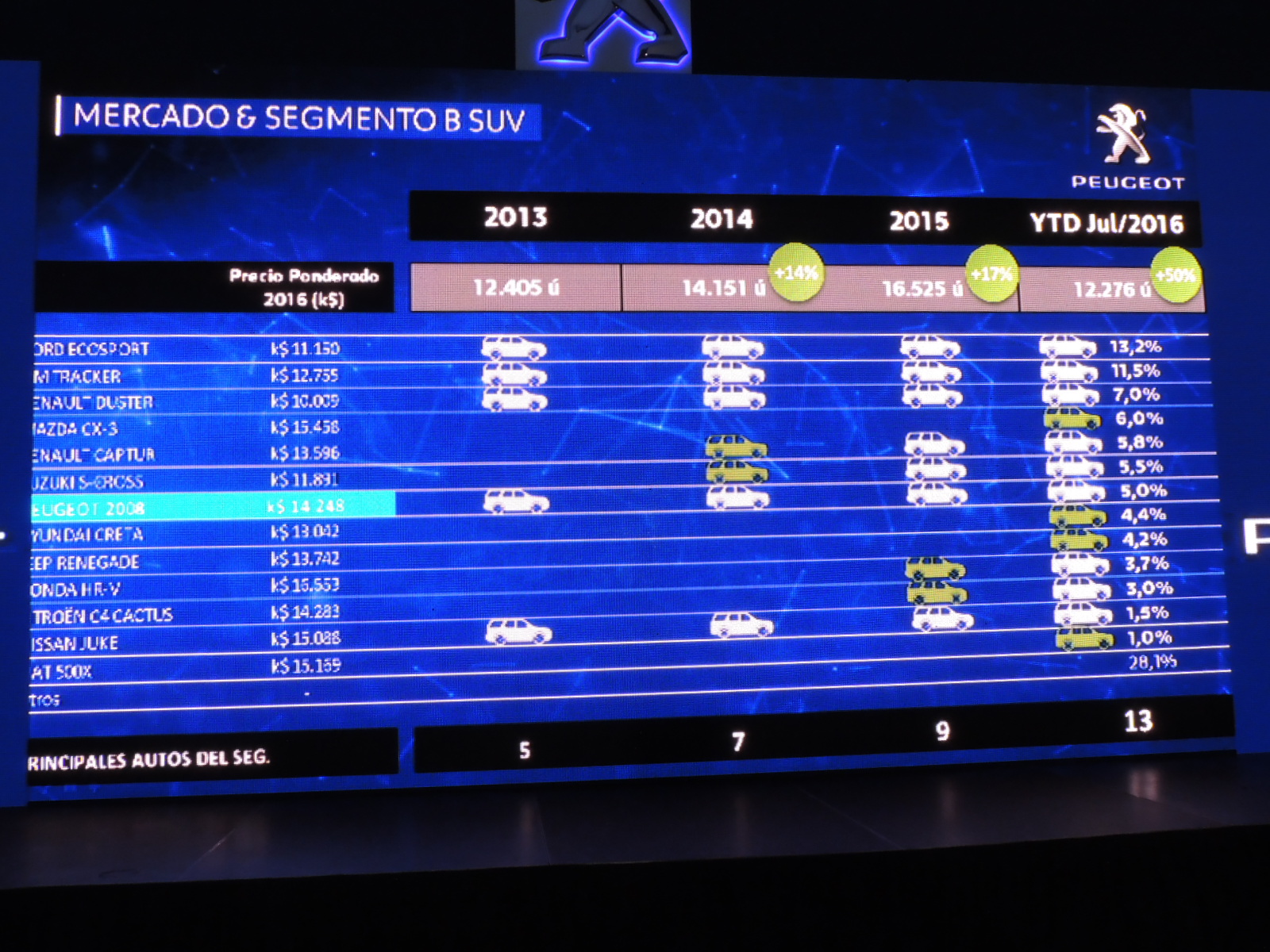 Cabe consignar que en octubre de 2013, sólo habían cuatro modelos con los que competía 2008: Chevrolet Tracker, Ford Ecosport, Nissan Juke y Renault Duster. Llegando a 12 modelos en lo que va del presente año, que muestra el interés de los consumidores por este tipo de automóviles.