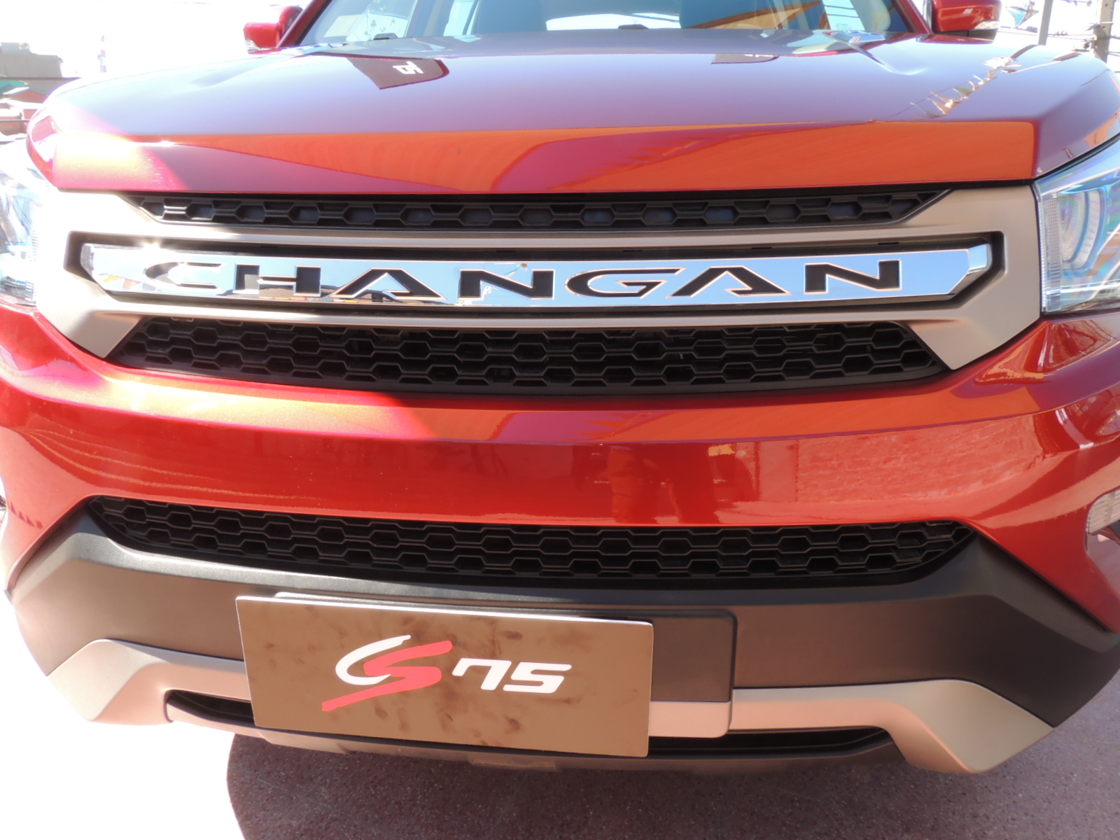 Sus creadores buscaron darle al CS75 un diseño que se viese deportivo y elegante a la vez, con líneas bastantes agresivas. Nuestras impresiones acerca de su frontal, es lo llamativo que resulta su calandra con el llamativo listón cromado que lleva grabado «Changan» a lo ancho, rodeado por revestimientos en gris satinado, que en cierta medida me recuerda al de una marca especialista en todoterreno. El parachoques alberga los intermitentes y neblineros en una sola pieza, adoptando una forma similar al de un boomerang. La zona central e inferior del paragolpes va revestida en una resina negra, además de la zona del difusor en gris satinado, donde encontramos otra toma de aire inferior.