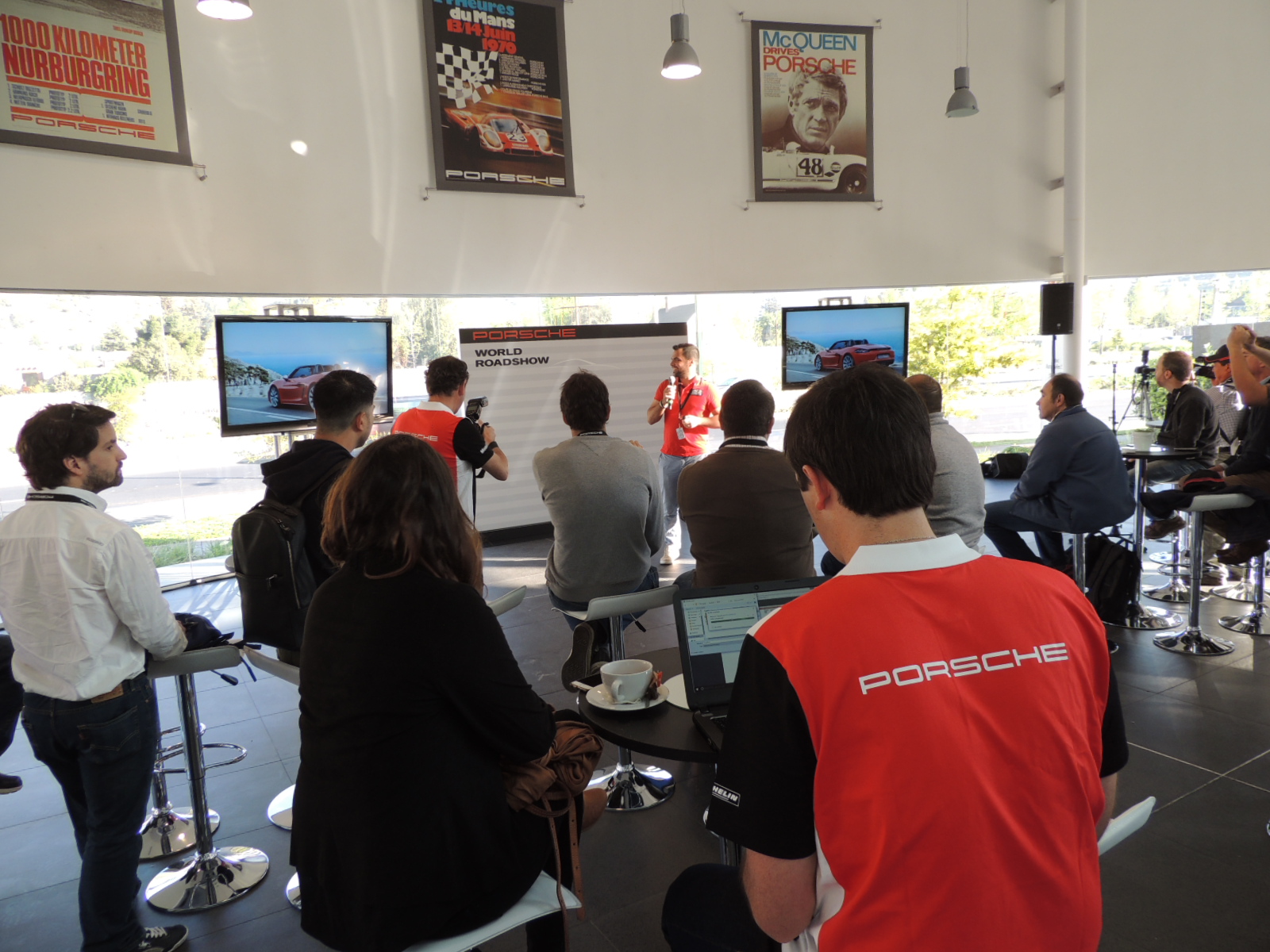 El grupo de periodistas se dividió en cinco grupos, signados por colores en nuestras respectivas tarjetas de acreditación, cada uno de los cuales quedó bajo la custodia de uno de los cinco instructores certificados (tres españoles, uno mexicano y otro venezolano) por Porsche Alemania. En los tres circuitos dispuestos: Pista 1, Pista 2, Frenaje y Agarre, se encontraba lista y dispuesta una generosa flota de 22 autos que representaba buena parte del Line up de la marca, comenzando por el recién presentado 718 Boxster y Boxster S, 911 Carrera, 911 Carrera S, 911 Carrera 4S, 911 Targa 4S, Macan S, Macan GTS, Cayenne S, Cayenne Turbo y Cayenne Turbo S, Panamera 4S Executive (batalla larga) y un Panamera Turbo. Todos contaban con patente alemana, indicativo de que procedían directamente desde Stuttgart.