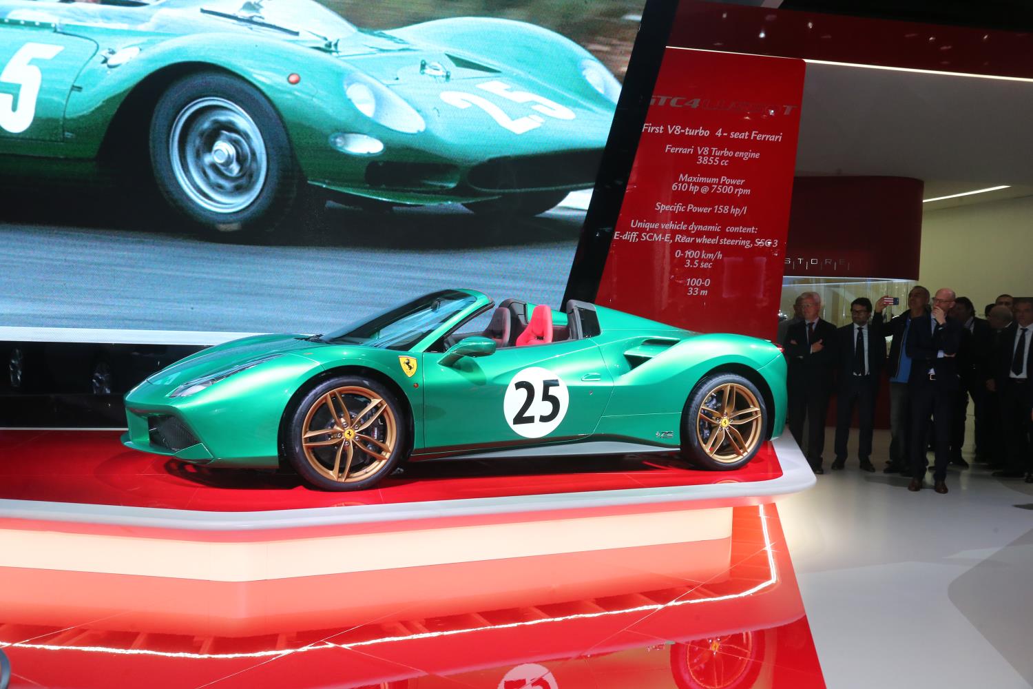 Como parte del programa de acciones especiales para conmemorar el 70º aniversario de su fundación en 2017, Ferrari ha utilizado su experiencia de personalización de vehículos para diseñar 70 acabados inspirados en los modelos más paradigmáticos de su historia. Varios ejemplos están expuestos en el stand de Ferrari: el F12berlinetta con la configuración “El Stirling”, el 488 GTB en su versión “El Schumacher” y el California T como “El Steve McQueen”, mientras que el 488 Spider se presenta con dos variantes: “La joya verde” y “El Spider”.