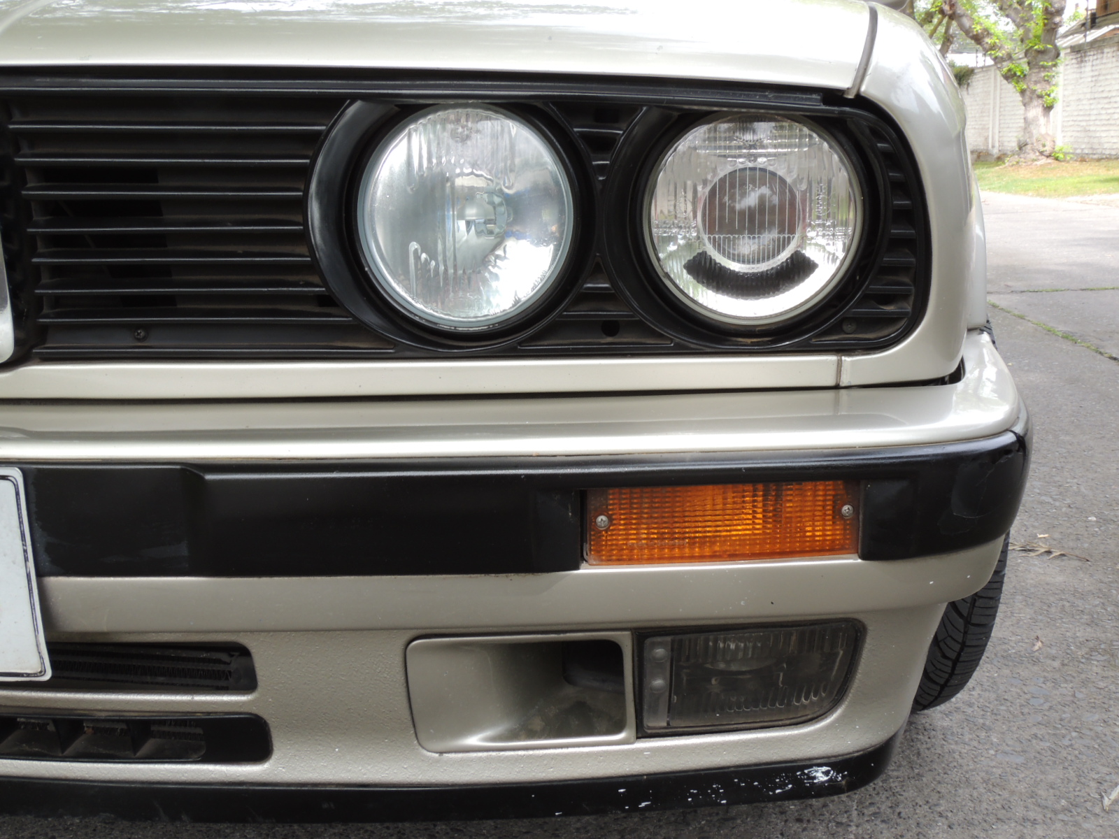 El parachoques, variaba dependiendo de la versión. Recuerdo que los primeros 316i montaban paragolpes cromados con bordes de uretano, mientras que las versiones actualizadas a contar de 1988, montaban parachoques a tono con el color de la carrocería, de manera parcial, por cuanto una franja negra protegía las zonas más expuestas a topones. Los intermitentes iban integrados en el parachoques. Más abajo encontramos un faldón frontal con abertura para el radiador de aceite del motor, mientras que en las esquinas van los neblineros semirectangulares. Un recubrimiento plástico protegía todo el borde inferior.