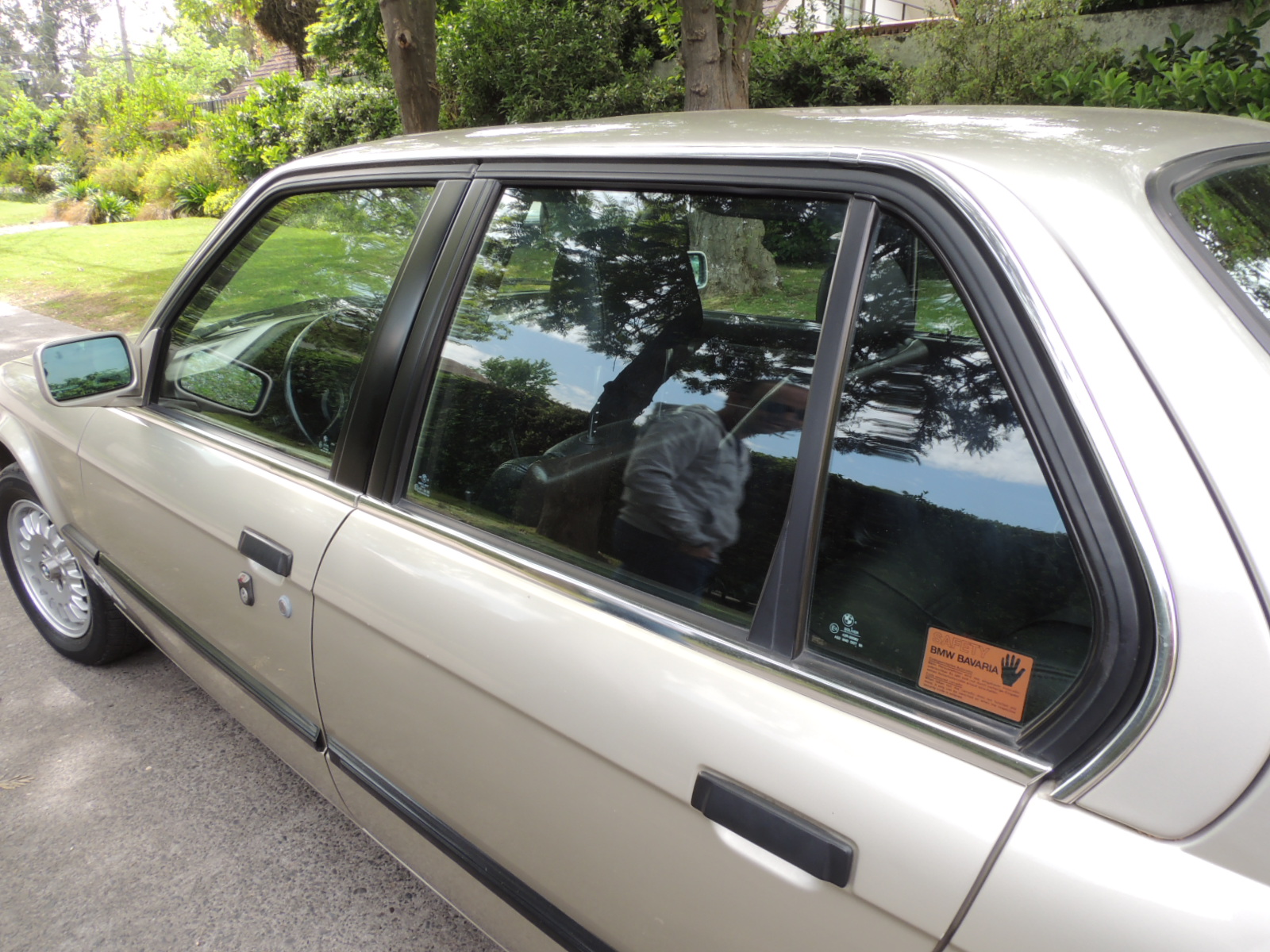 De perfil, destaca un ancho pilar B en color negro que transmite una sensación de solidez.Todo el contorno de las puertas es recorrido por un vierteaguas cromado que se ensancha en la parte posterior. Una línea de cintura recorre desde el nacimiento de los faros, pasando por las manillas de las puertas negras, hasta los ópticos traseros. Tanto el paso de ruedas delantero como las puertas disponen de un listón negro en relieve para protegerlas de eventuales golpes o rasmillones. El zócalo iba pintado en negro. Se desliza sobre neumáticos Bridgestone Potenza RE910 de medida 195/60 R14 con llantas de aleación originales BMW.
