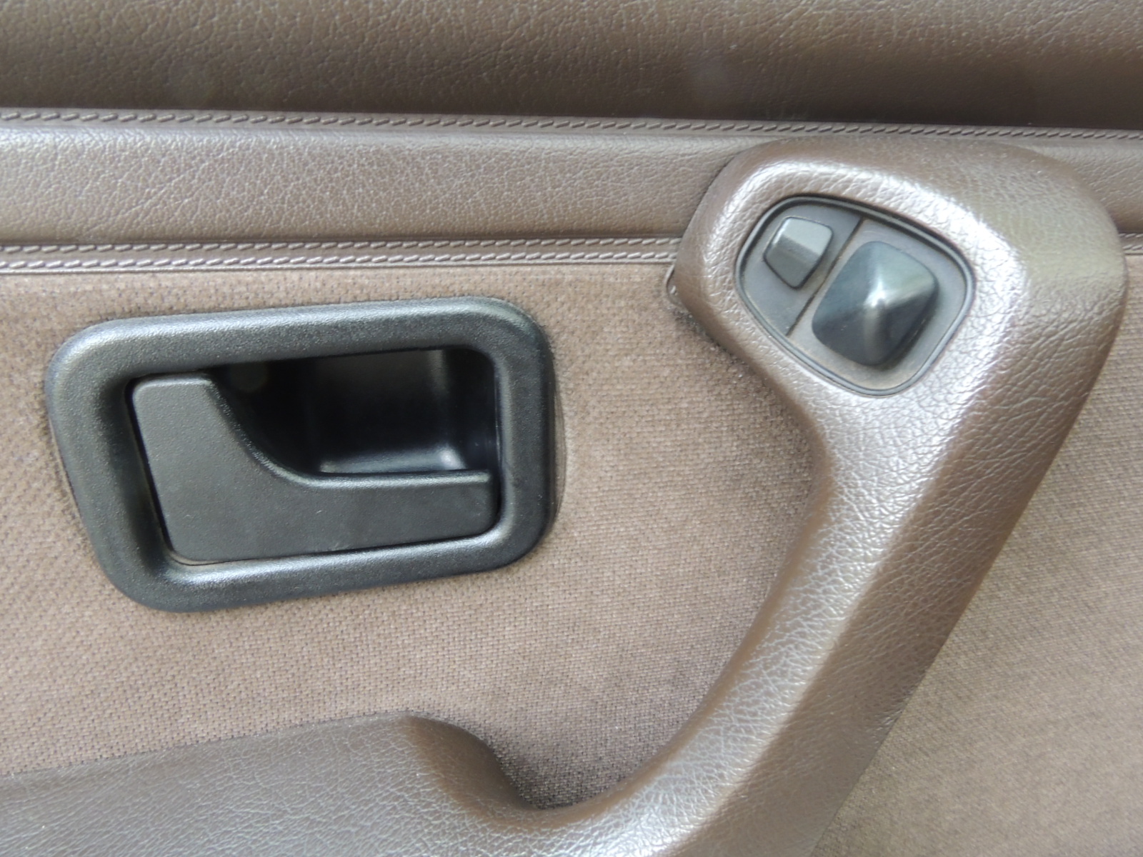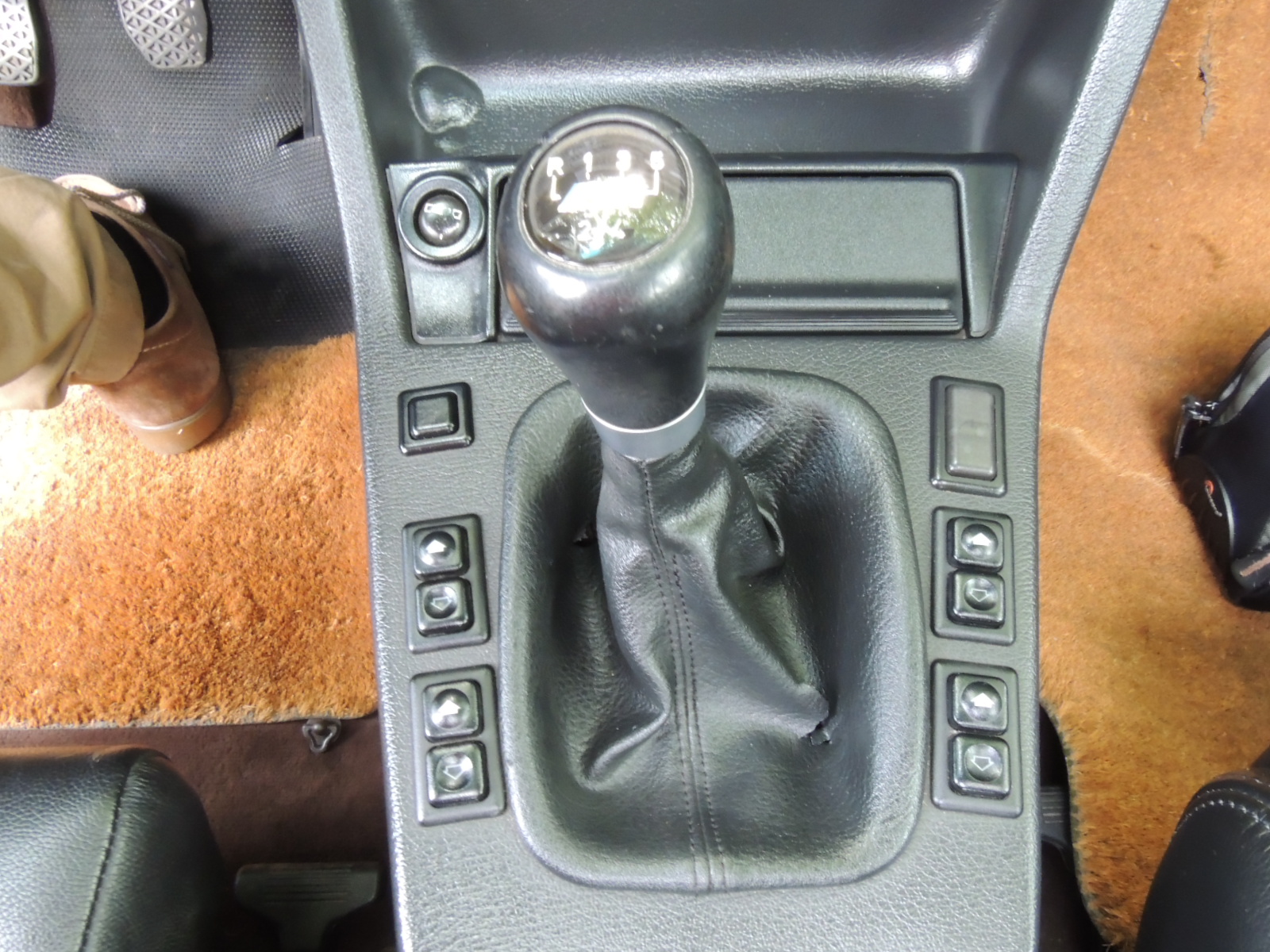 Inmediatamente hay un pequeño espacio portaobjetos, cenicero con su respectivo encendedor. Entre ambos asientos delanteros, hallamos la palanca de cambios de cinco marchas con fuelle en cuero y empuñadura M, rodeada a ambos lados por los interruptores de accionamiento de los alzavidrios delanteros y traseros, el freno de mano y un espacio para albergar discos compactos.
