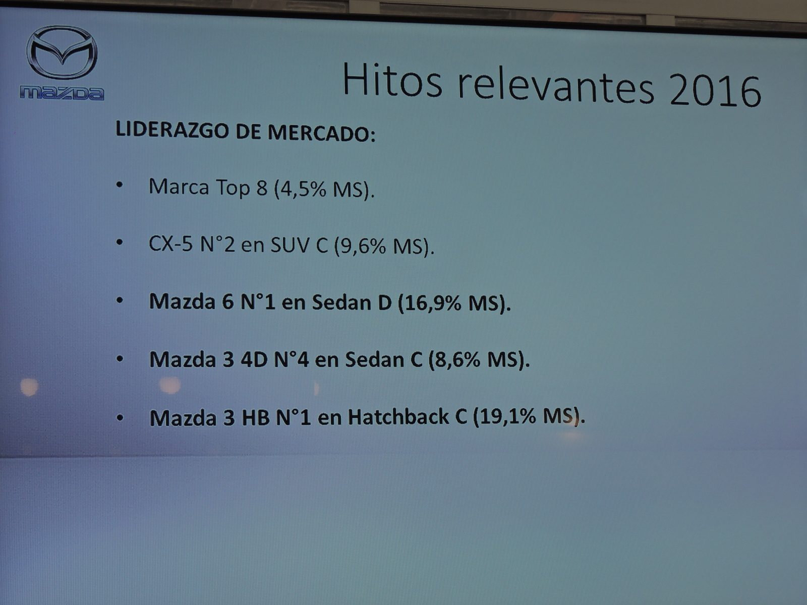 Repasando los hitos de la marca durante el pasado ejercicio, destaca la elección del Roadster MX-5, elegido por la prensa especializada chilena como “Mejor deportivo del Año”, además de haber sido elegido como “Auto Mundial del Año” y “Diseño Mundial del Año” en el Salón de Detroit 2016. Lo anterior nos habla de hacia dónde va la marca. No estamos en presencia de una marca generalista interesada en crear volumen, sino de un fabricante que se diferencia por el diseño, andar y tecnología aplicada en su gama de productos.