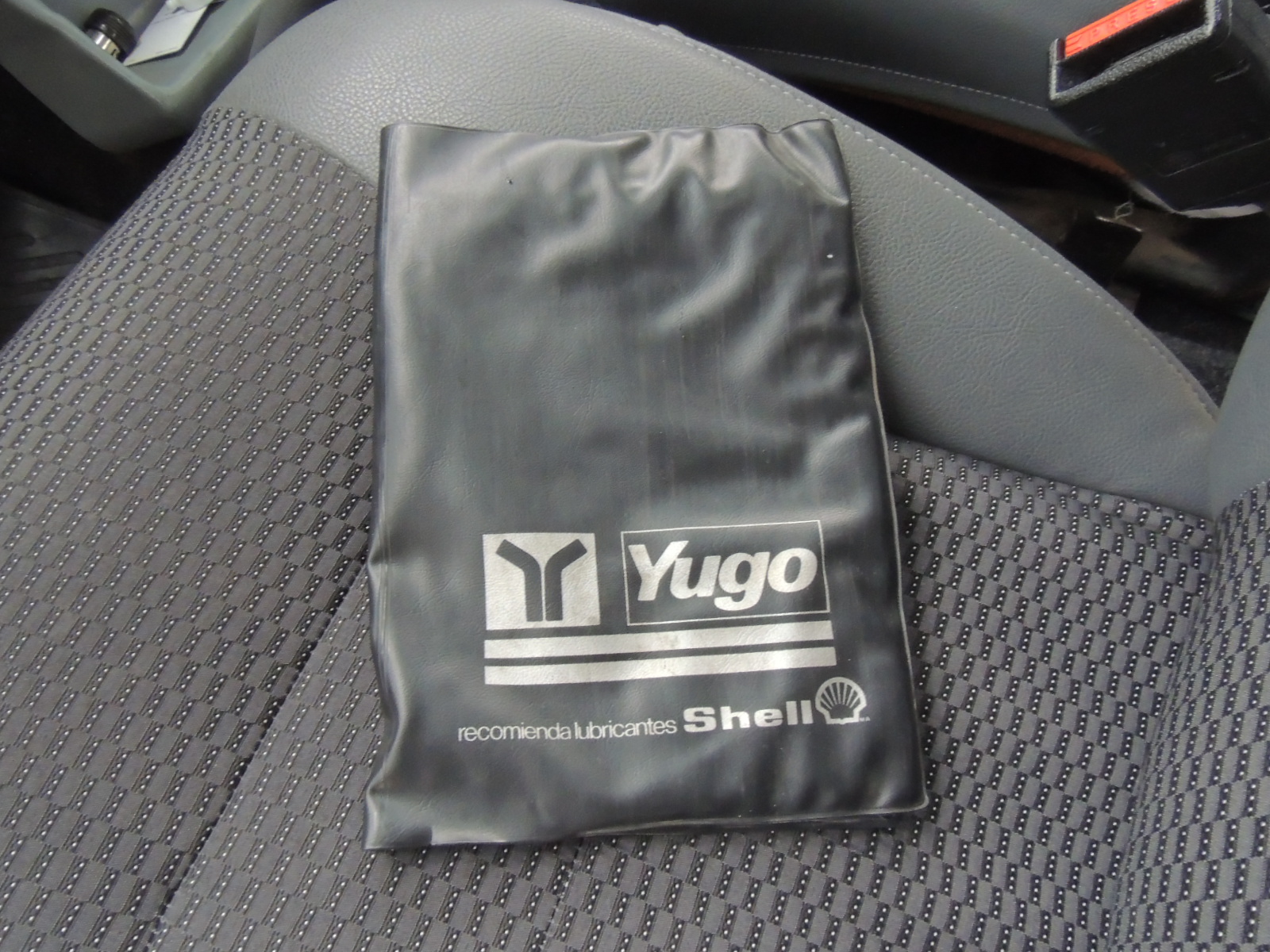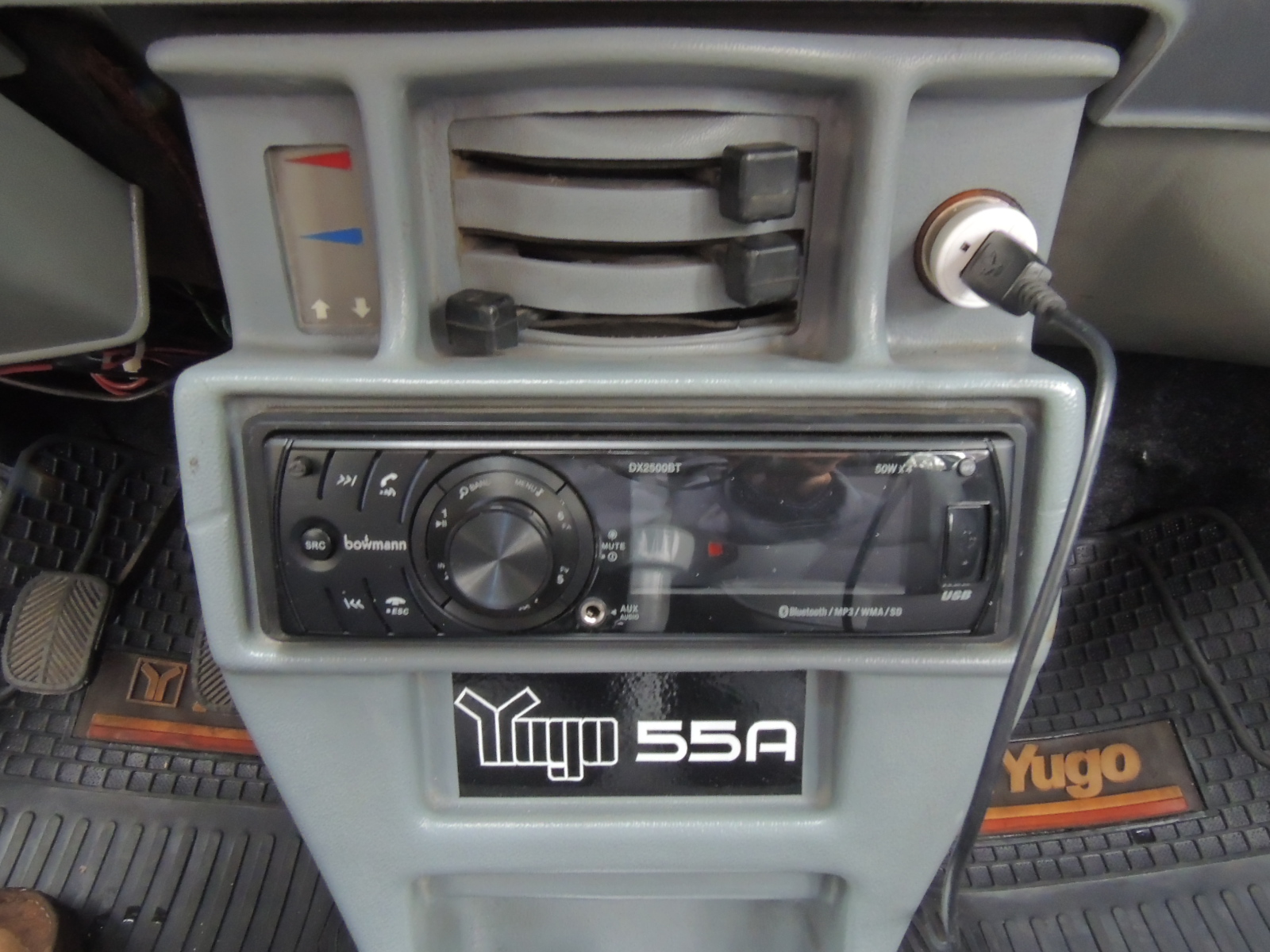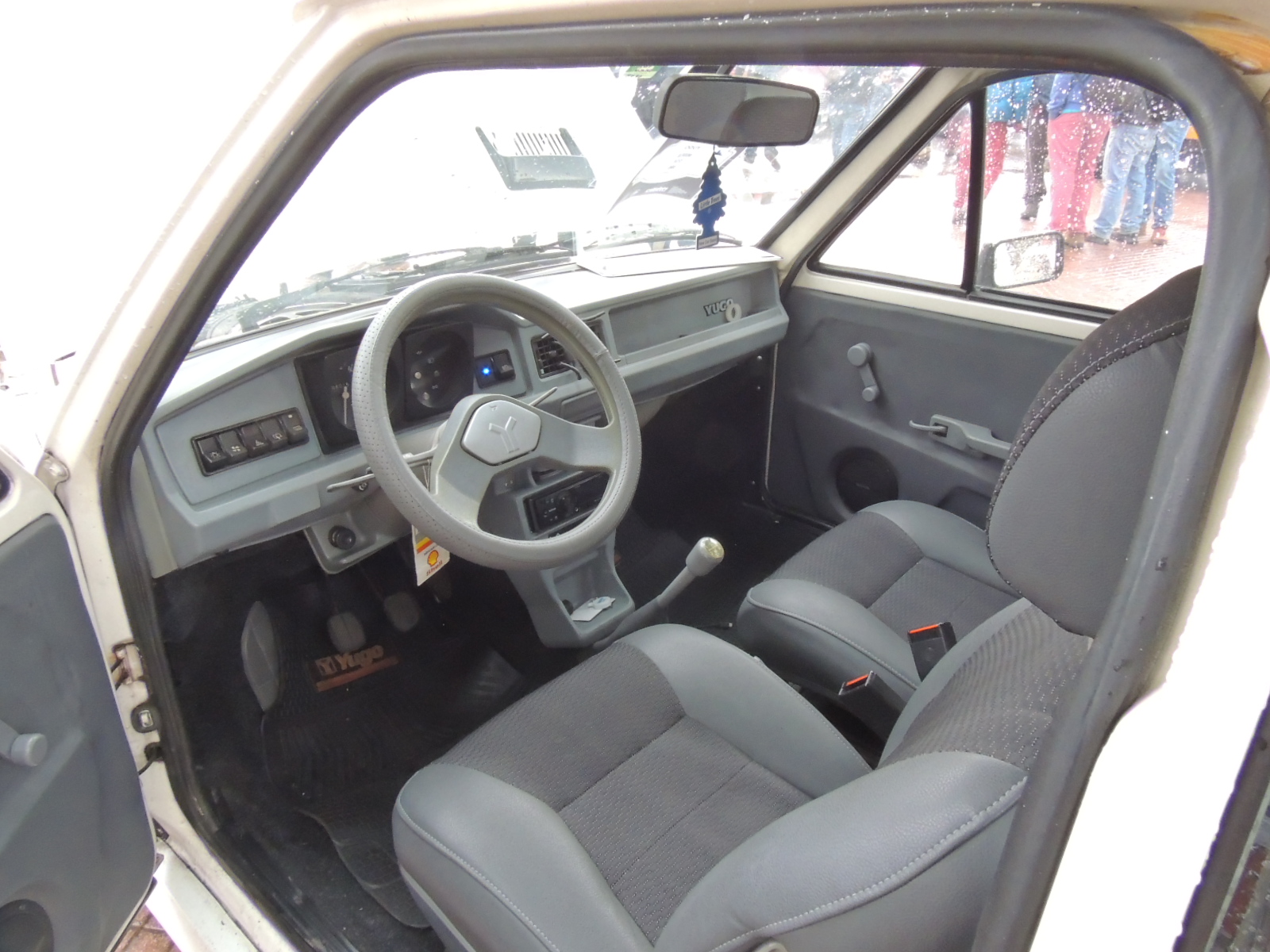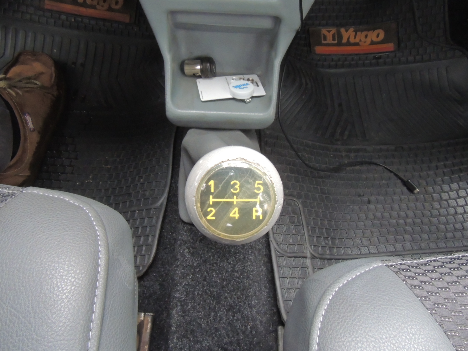 Más abajo encontramos otro adhesivo que alude al pequeño Yugo y un pequeño espacio para dejar objetos. La palanca de cambios iba directamente conectada al piso.