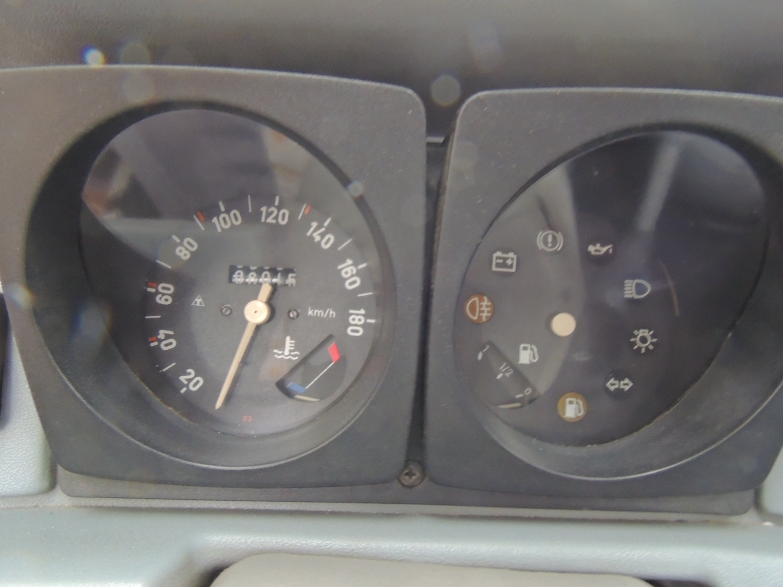 Al costado derecho una batería de testigos: freno de mano, líquido de freno, neblinero trasero, luces altas, ampolleta fundida, intermitentes y bajo nivel de combustible. Además de la aguja indicadora de nivel en el estanque.