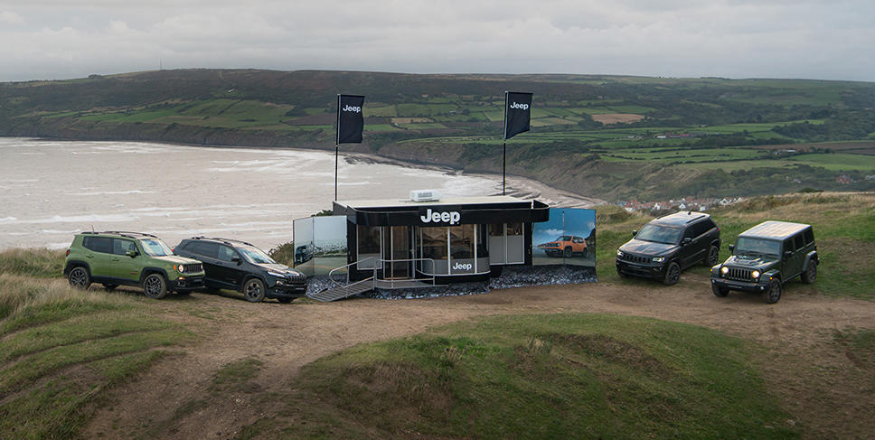 El showroom móvil de tres toneladas y media fue remolcado a través del exigente terreno del North York Moors por un Jeep Grand Cherokee 75 aniversario. El concesionario totalmente negro mide 9 metros de largo y se ha instalado en tan solo medio día.