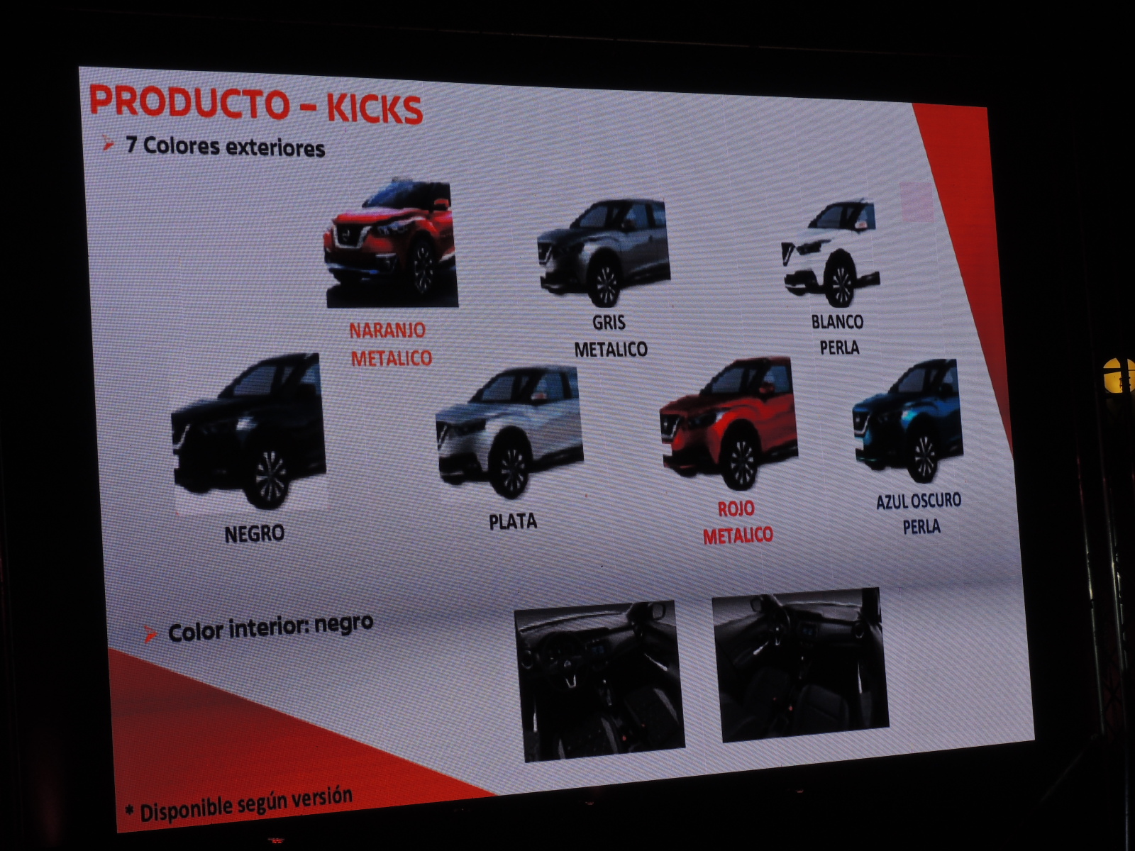 1.- Kicks Sense: Barras de techo, espejos del color de la carrocería con ajuste eléctrico, llantas de aleación aro 16, aire acondicionado manual, sistema de audio con 4 parlantes y BT, llave inteligente con botón de encendido, 2AB, ABS/EBD/BA y sensor de retroceso. 5MT $11.490.000.