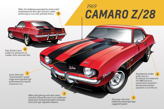 La primera generación de Chevrolet Camaro nació en la era del muscle car, las guerras de vehículos de pista y las carreras en carretera que dieron lugar al original Z/28 en 1967. Esta generación también fue pace car dos veces en la carrera Indy 500, primero en 1967 y después en 1969.
