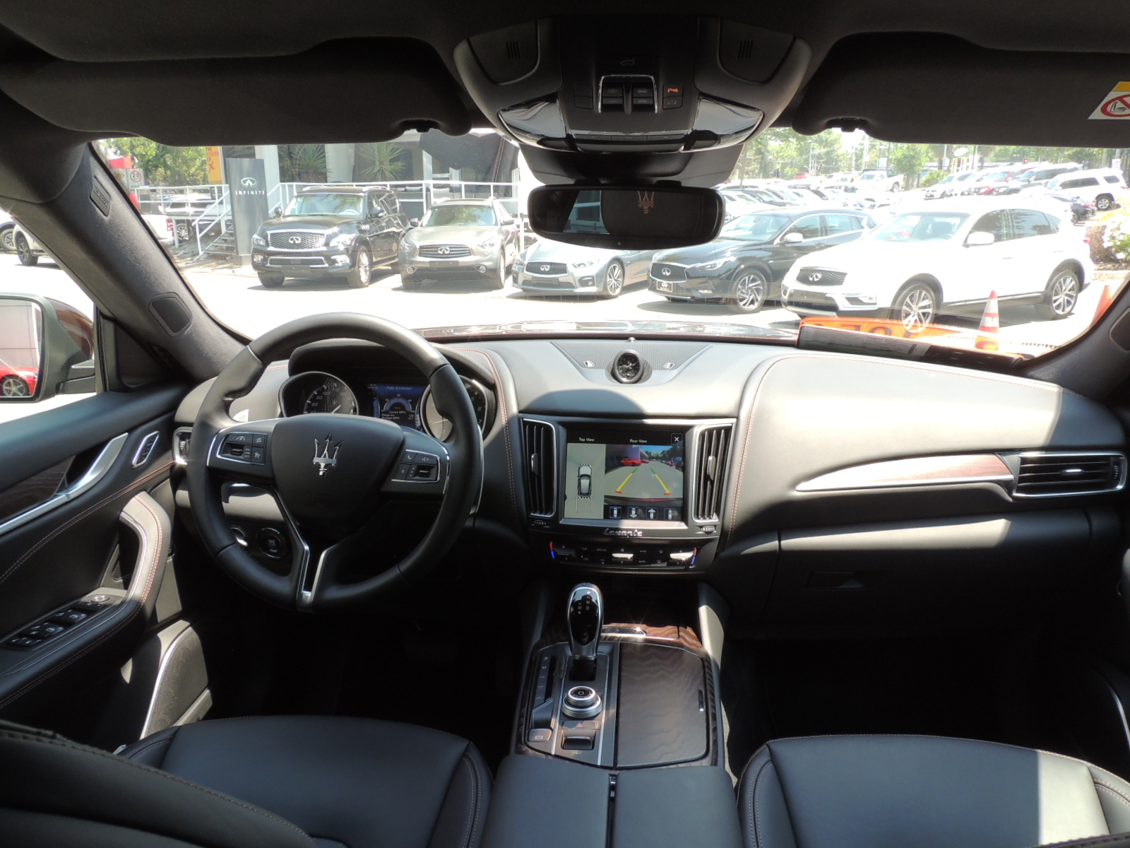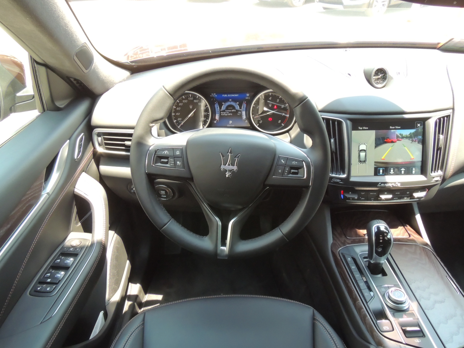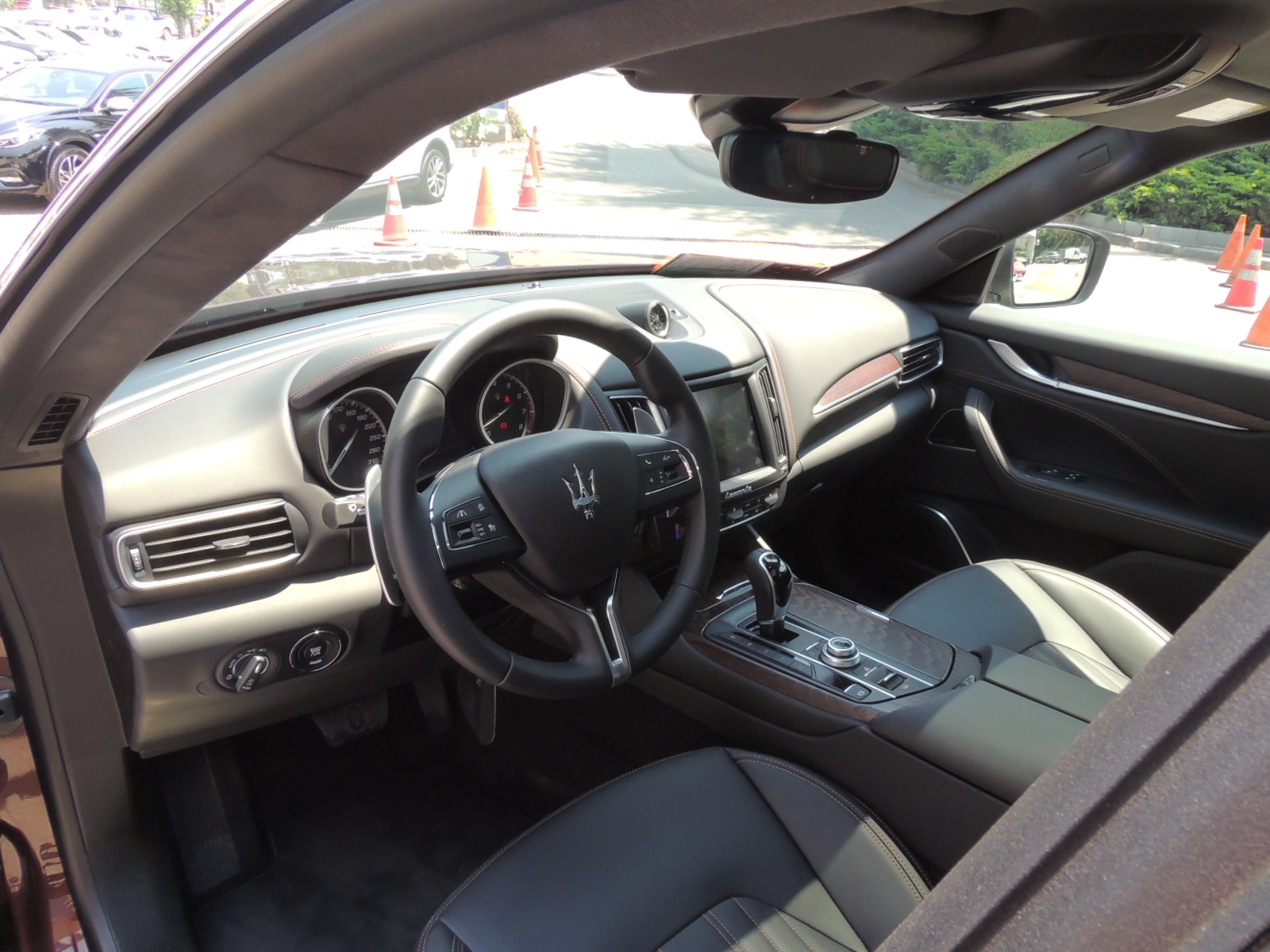 Basta con abrir cualquiera de sus cinco puertas, para tener acceso a un salón o living de primera clase, partiendo por sus asientos revestidos en cuero. Maserati dice que el Levante puede ser configurado dentro de un total de 28 alternativas de combinaciones de colores. El cuadro de mandos y la consola fueron rediseñados para alojar la pantalla táctil de 8,4″, el panel con los botones de los modos de manejo, el mando giratorio y el controlador de la suspensión neumática. El panel sigue las líneas vistas en el Ghibli y Quattroporte, con luz blanco como retroiluminación. El clásico reloj analógico de Maserati va situado en la parte alta de la consola central.