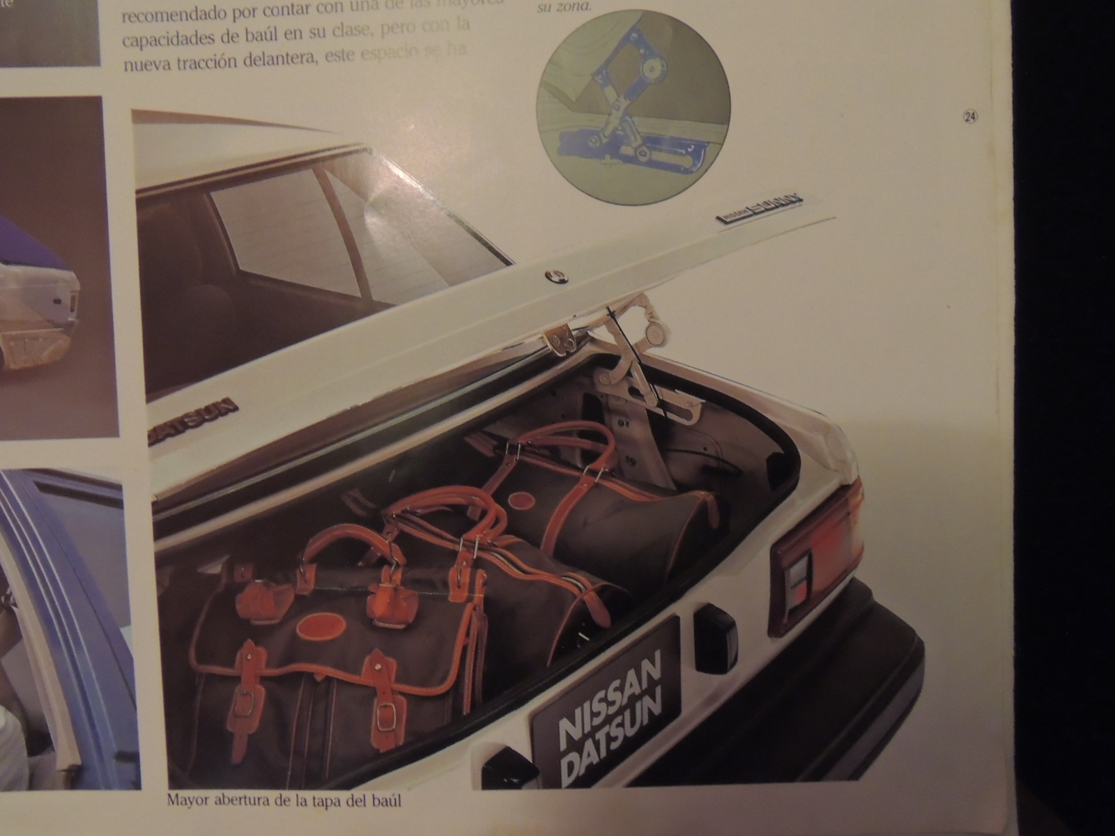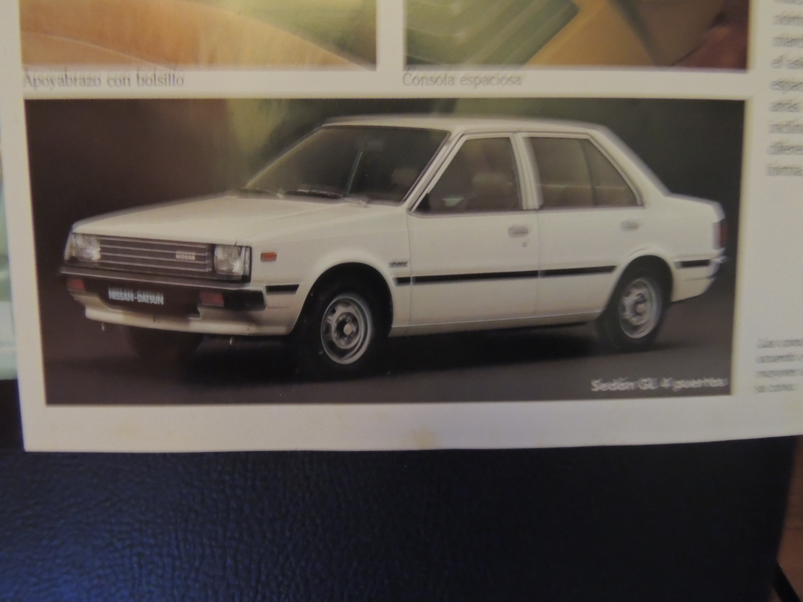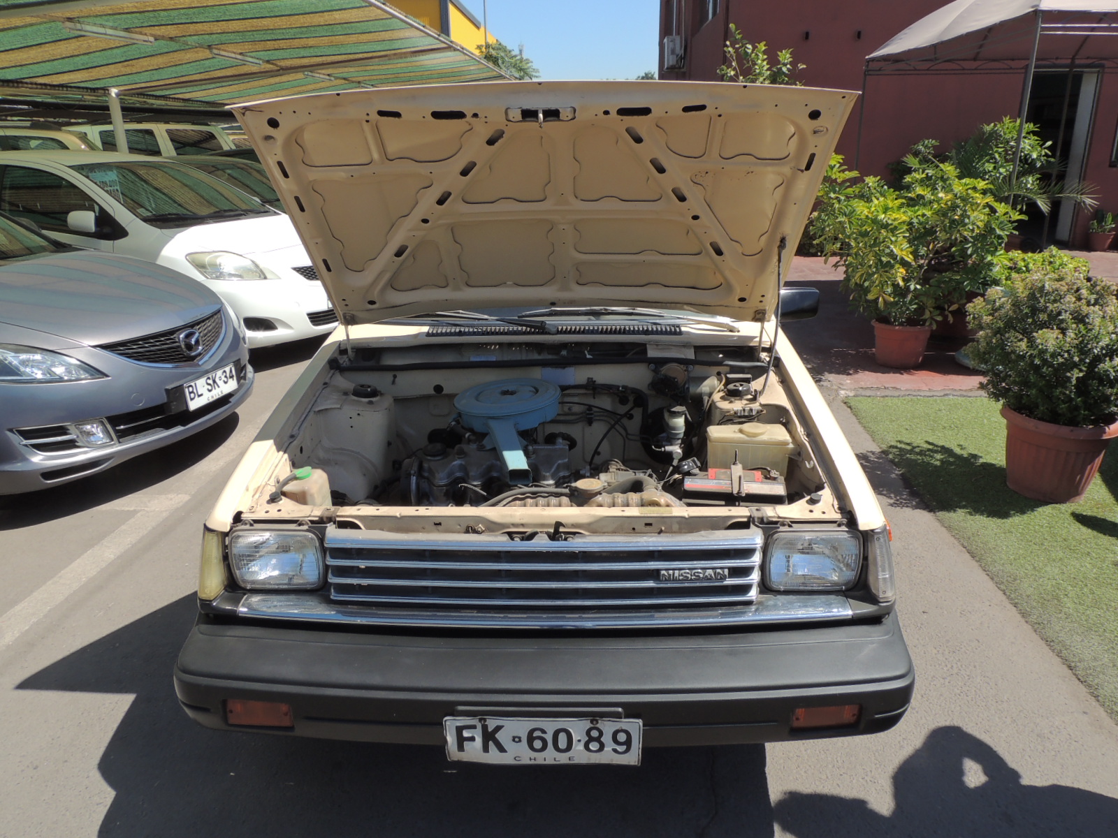 Analizando sus líneas, estamos en presencia de un sedán de tres volúmenes, de diseño muy clásico y proporcionado para aquellos años. Su frontal, difería del de origen mexicano, partiendo por la presencia de una máscara de cuatro lamas horizontales cromadas con las letras Nissan en blanco del costado derecho del observador. Incluso recuerdo algunos ejemplares que llevaban una chapa roja con dorado, que indicaba los 50 años de la compañia. Iba flanqueado por dos ópticos cuadrados de halógeno, que albergaba luces bajas y altas, mientras que al costado, en forma vertical, iban las de posición. Otro elemento diferenciador era la presencia de un generoso parachoques delantero de resina, muy prominente, que alberga en sus esquinas los intermitentes. Los limpiarabrisas iban pintados en gris claro, que en la unidades de origen mexicano eran negros.