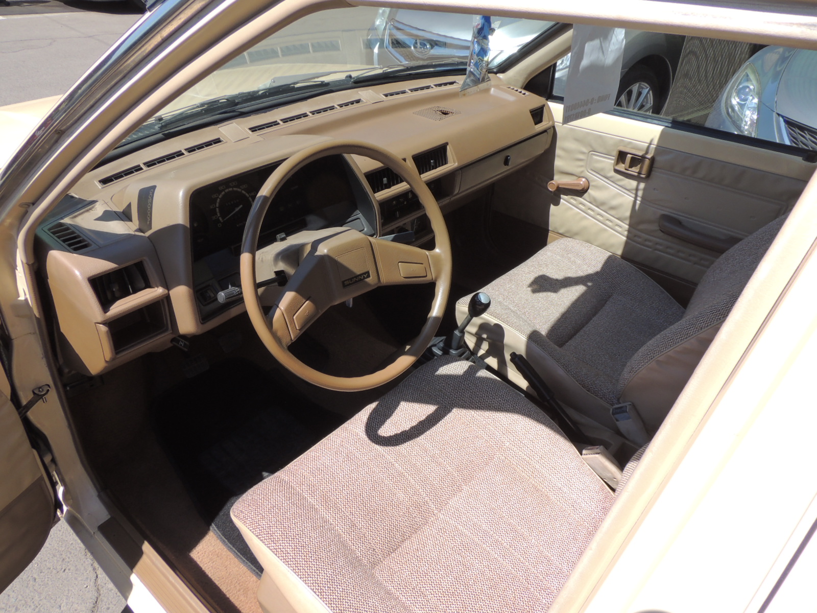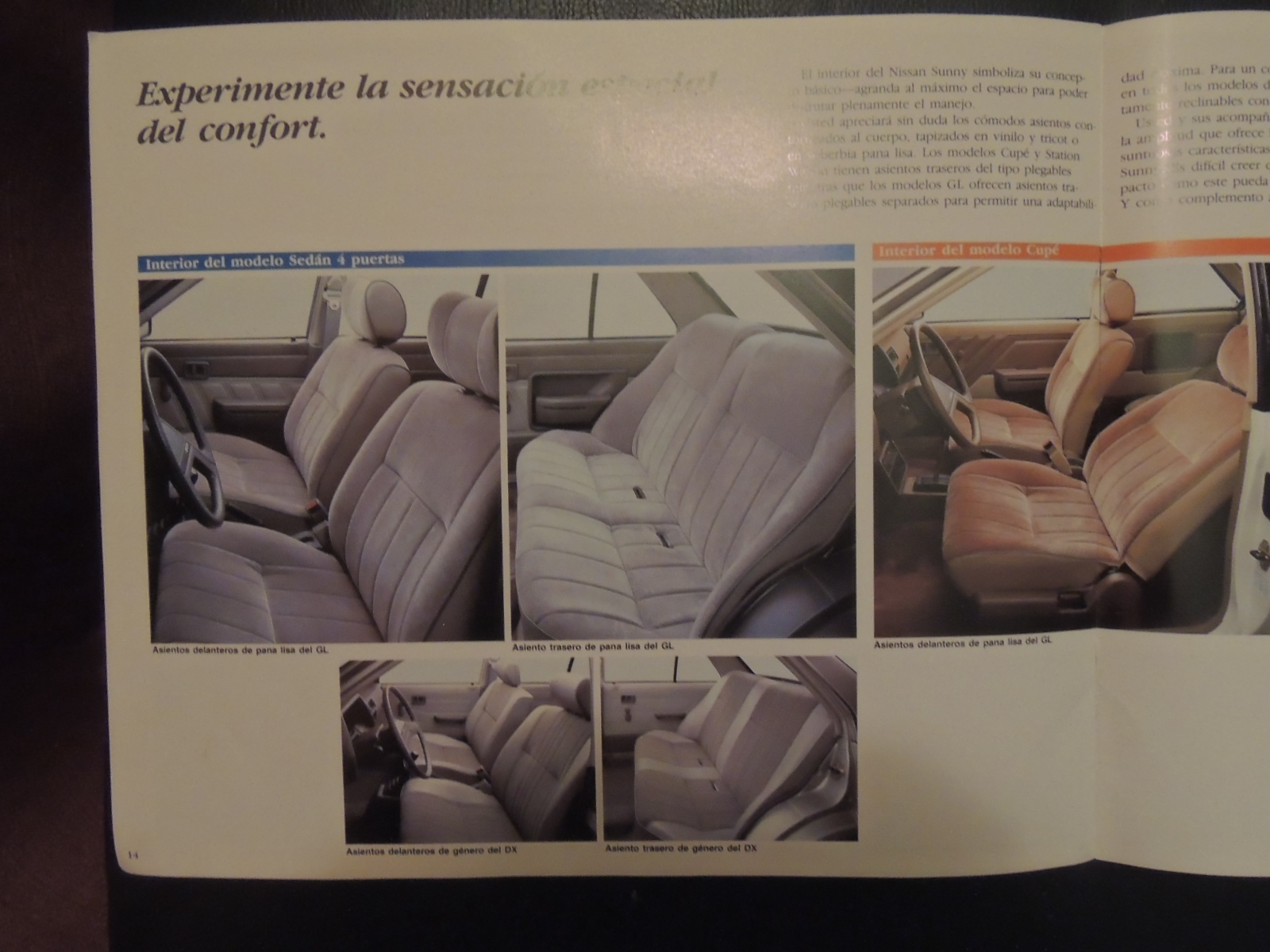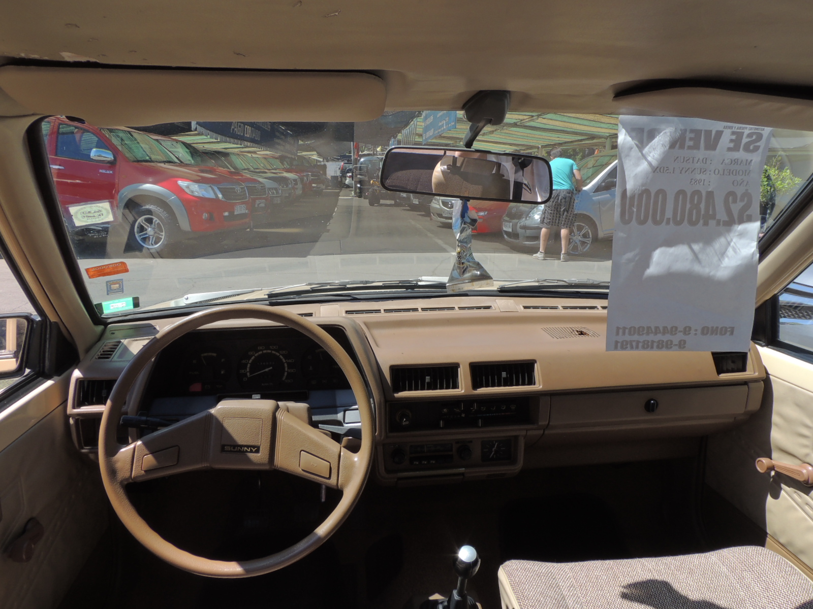 Interiormente, el Sunny cumplía a cabalidad con la máxima: «Pequeño por fuera, grande por dentro», que demuestra que un auto por ser compacto, no tiene por qué dejar de ser espacioso. Abrimos sus puertas y nos acomodamos en sus asientos con tejido textil, a tono con su color beige, completamente reclinables coon apoyacabezas delanteros regulables, revestimientos de puertas parcialmente de plástico (dejando la parte superior en metal del color del auto), con vidrios de accionamiento manual.