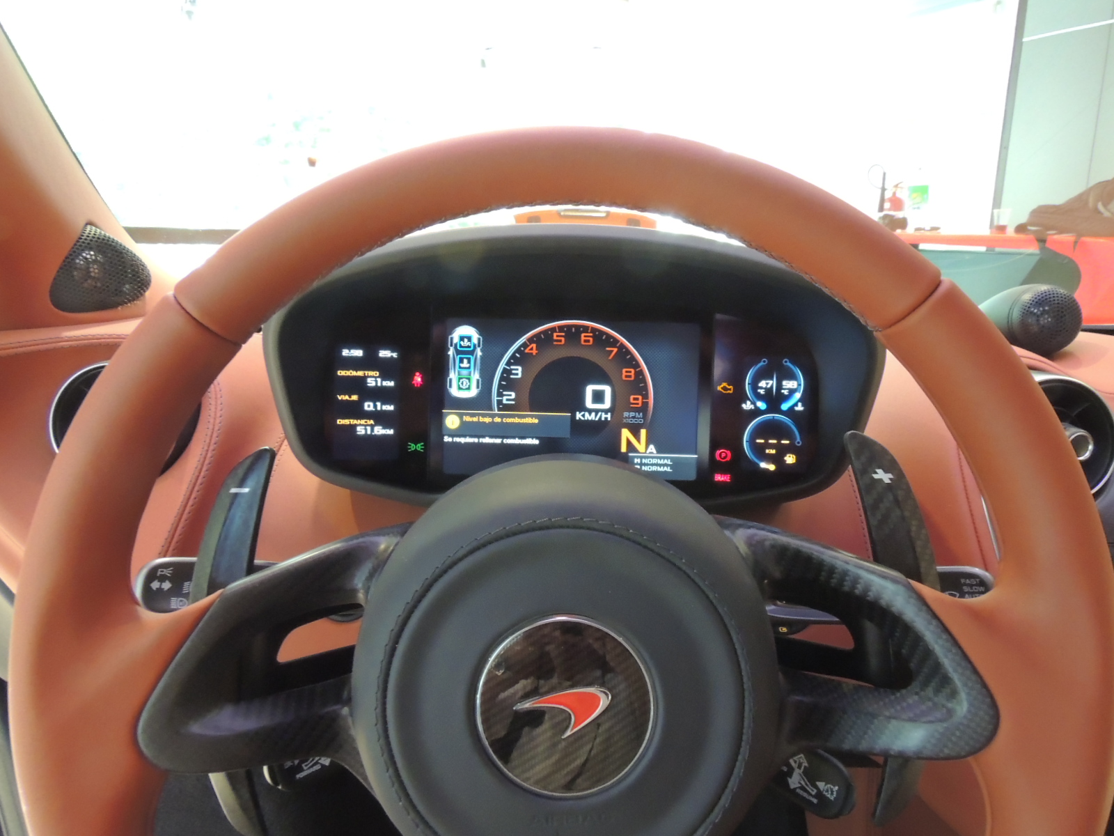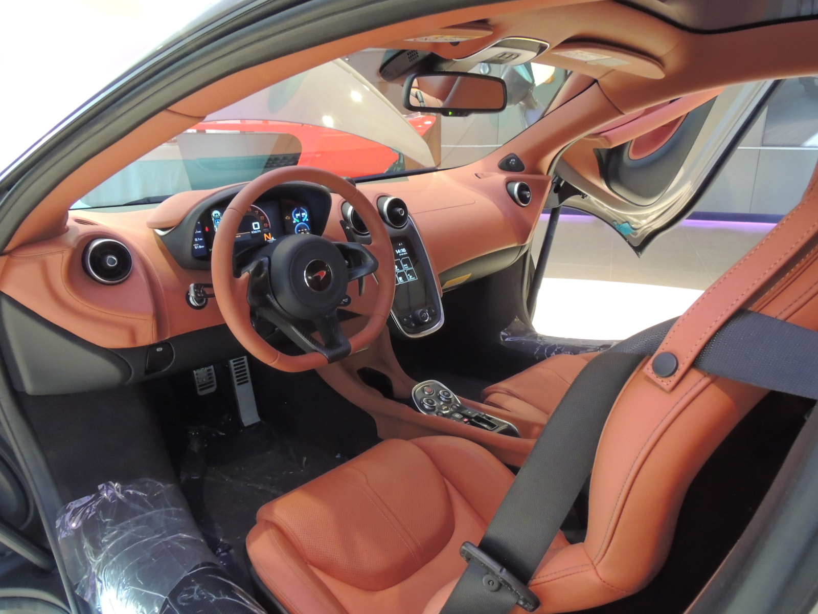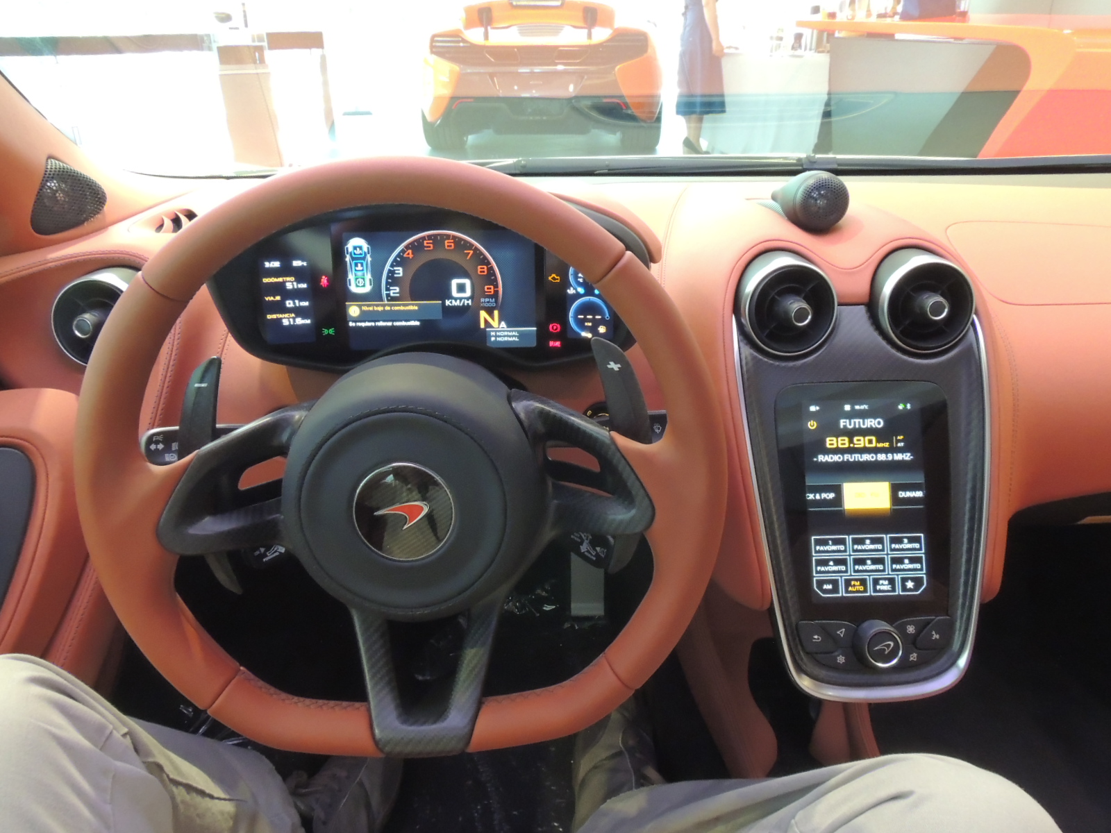 Su elegante interior está acompañado por una consola central, sistema de información y entretenimiento -McLaren IRIS- con pantalla táctil de siete pulgadas. Este último incluye navegación por satélite, conexión por Bluetooth y la transmisión de audio. IRIS también controla los sistemas de cámara de visión trasera opcional estéreo y control climático.