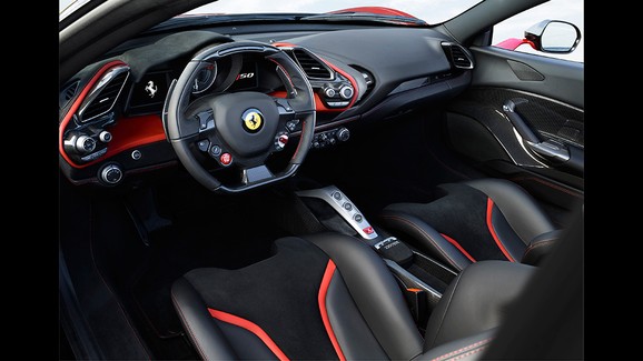 La sección del capó se ha rebajado en el centro y con unos pasos de rueda en relieve, lo cual enfatiza la musculatura típica de los Ferrari deportivos con motor central trasero. Dos canales de aire en fibra de carbono esculpen el frontal del capo, otorgando ahora un aspecto más agudo y afilado subrayado también por las ópticas LED de diseño específico, todo ello contribuye a resaltar su perfil más dinámico.