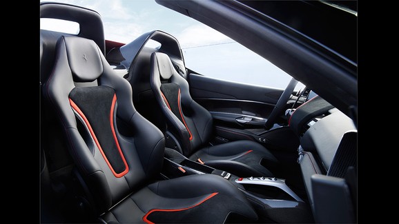 La sofisticada sección de cola está sin lugar a dudas dominada por un equilibrado juego de conjuntos gráficos y elementos tridimensionales. El motor se encuentra enmarcado por una cubierta transparente de policarbonato con una forma específica para ofrecer una extensión visual a los dos arcos de protección activos para conductor y pasajero. Una lamina transversal se proyecta como un puente entre los dos arcos de protección, haciendo un guiño característico a los prototipos Ferrari de los años sesenta.