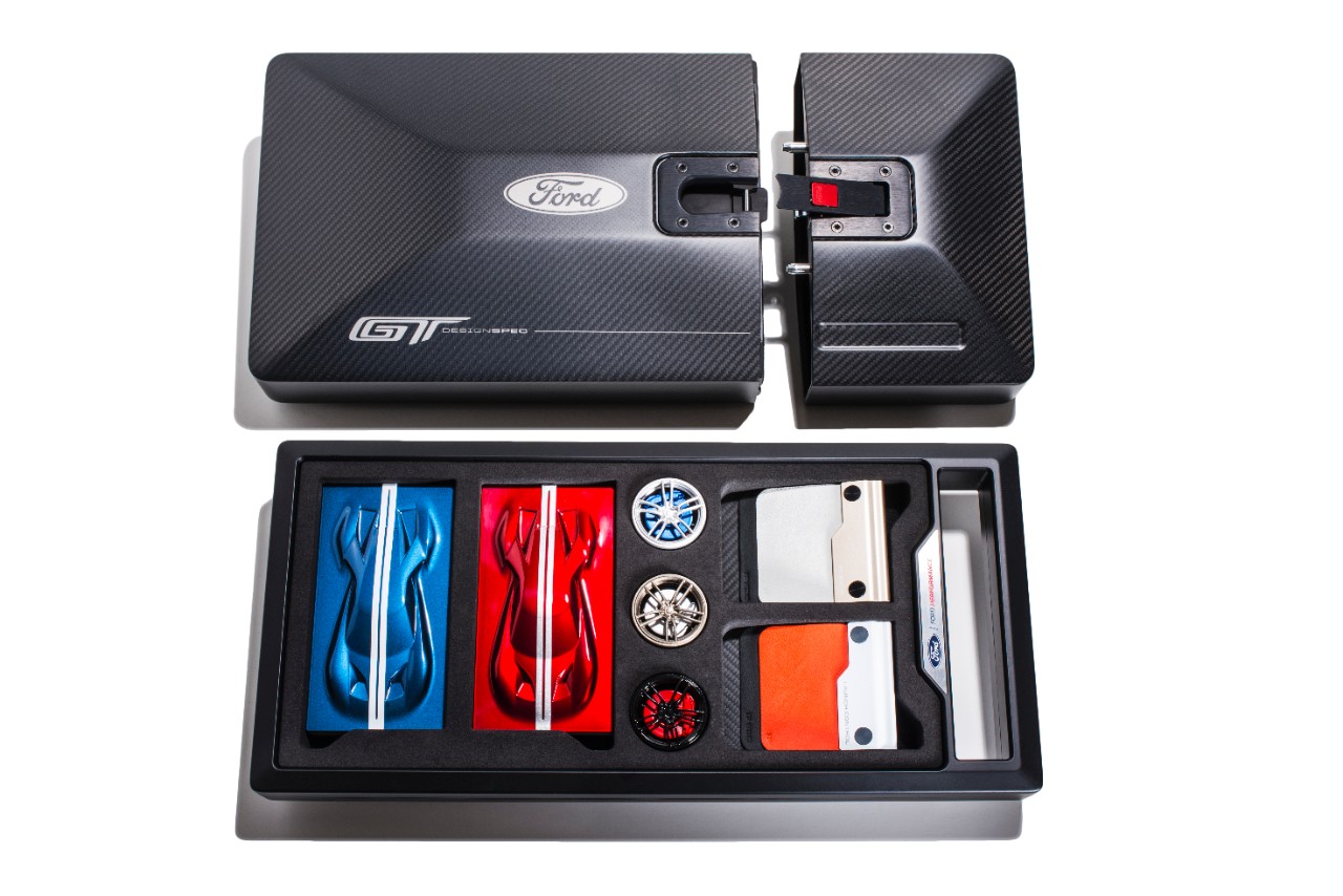 El equipo de diseño del Ford GT ha ido mucho más allá de la típica web de configuración y ha desarrollado piezas miniaturizadas abstractas para cada kit que utilizan los mismos materiales avanzados que se emplean en el interior del coche, incluidos fibra de carbono y un cierre idéntico al que se puede encontrar en el Ford GT. Se incluyen muestras de cada opción interior, realizados en los mismos materiales, cuero de alta calidad y Alcántara, que tendrá el habitáculo del nuevo Ford GT.