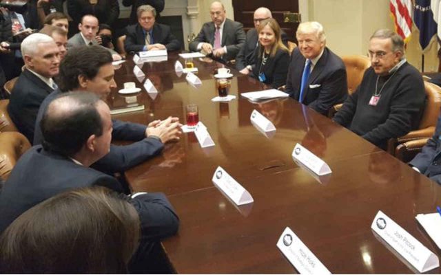 Trump, quien ha amenazado con imponer un arancel de 35 por ciento a los autos importados, recibió en la Casa Blanca a los presidentes ejecutivos de GM, Mary Barra; de Ford, Mark Fields, y de Fiat Chrysler, Sergio Marchionne, a quienes dijo que quiere ver que se construyan nuevas plantas de automóviles en Estados Unidos.